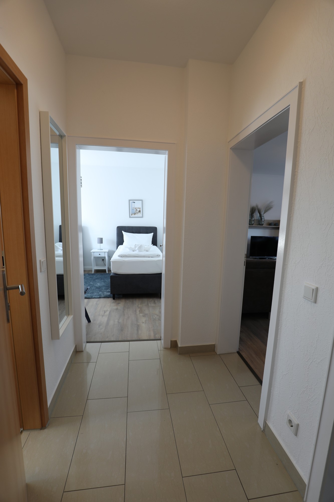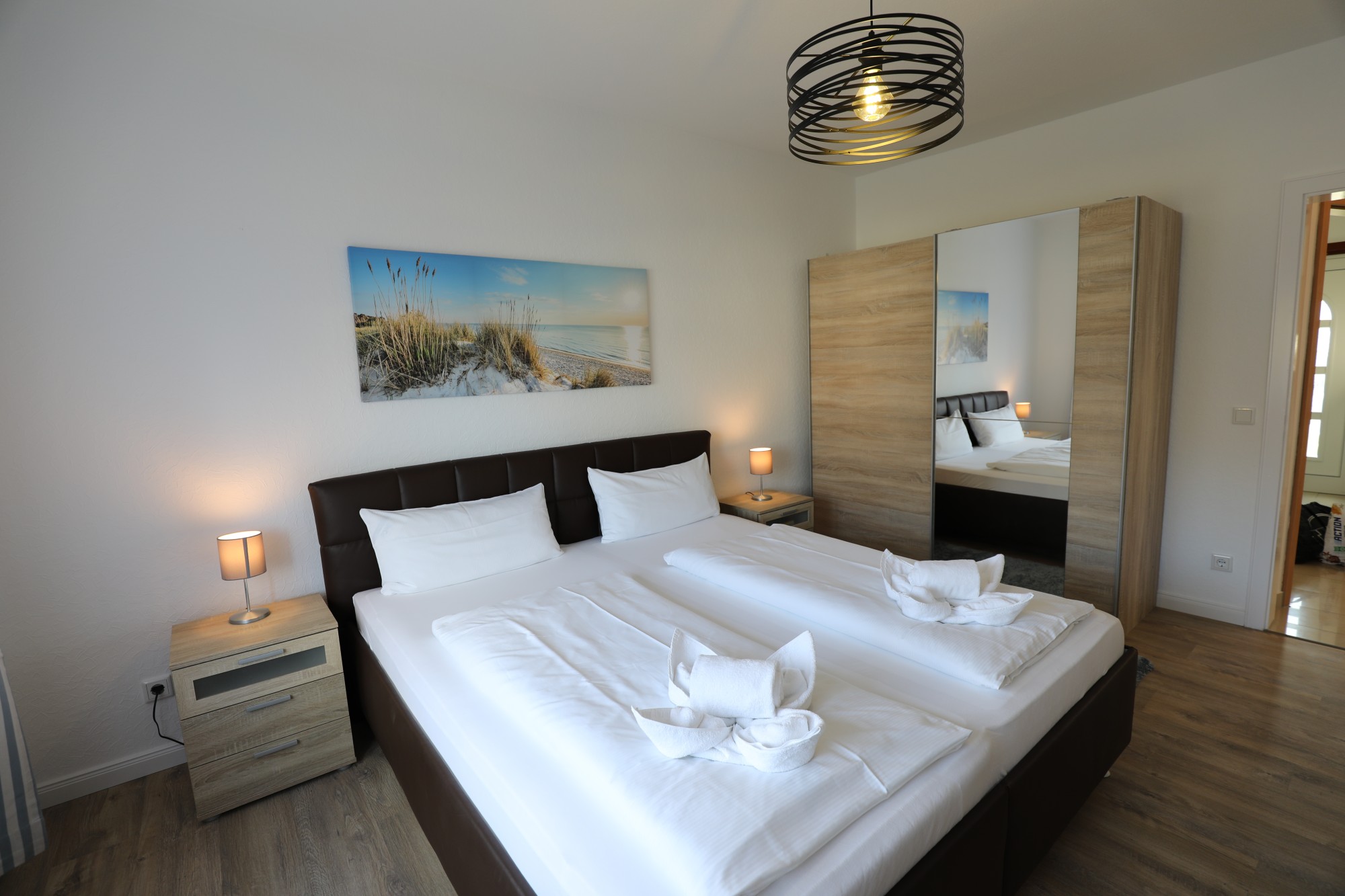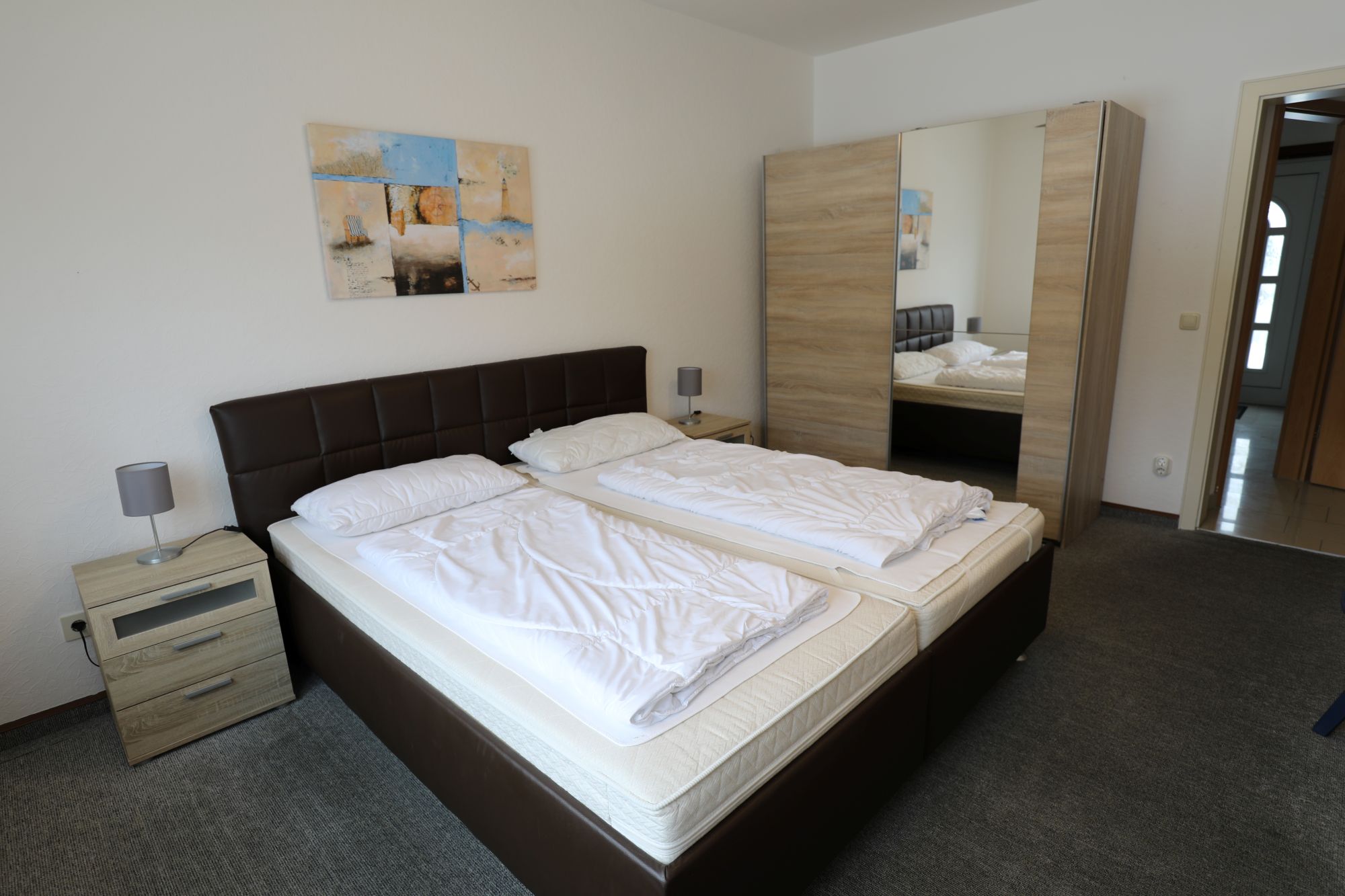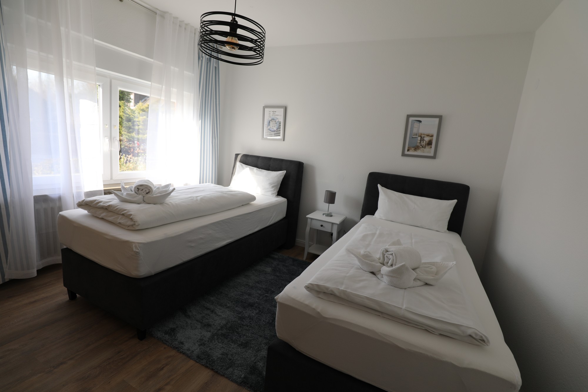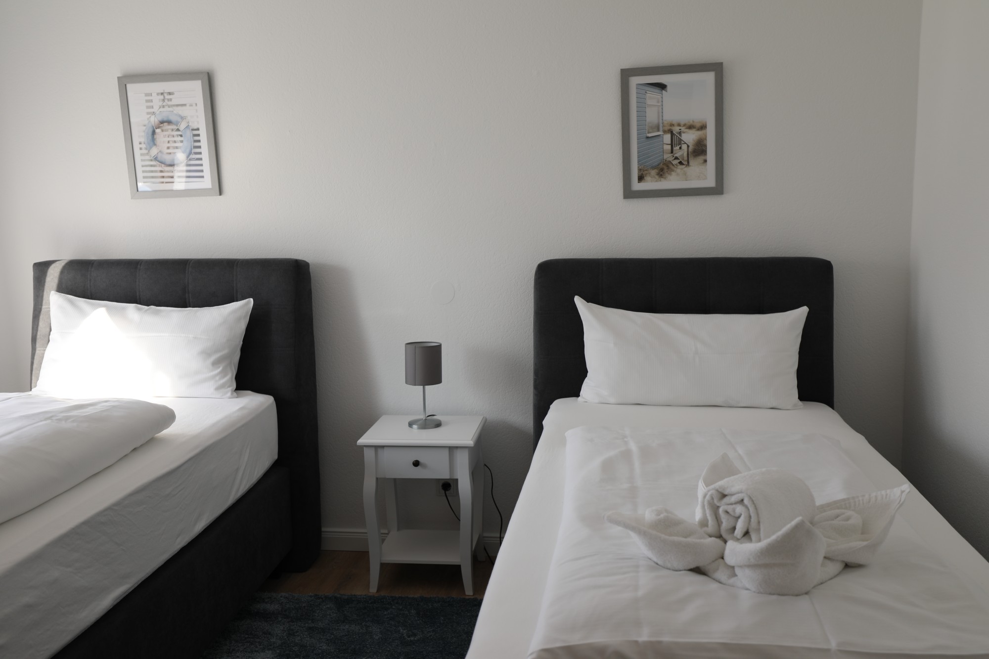 Es sind 2 separate Schlafzimmer vorhanden, eins mit Doppelbett und eins mit zwei Einzelbetten).