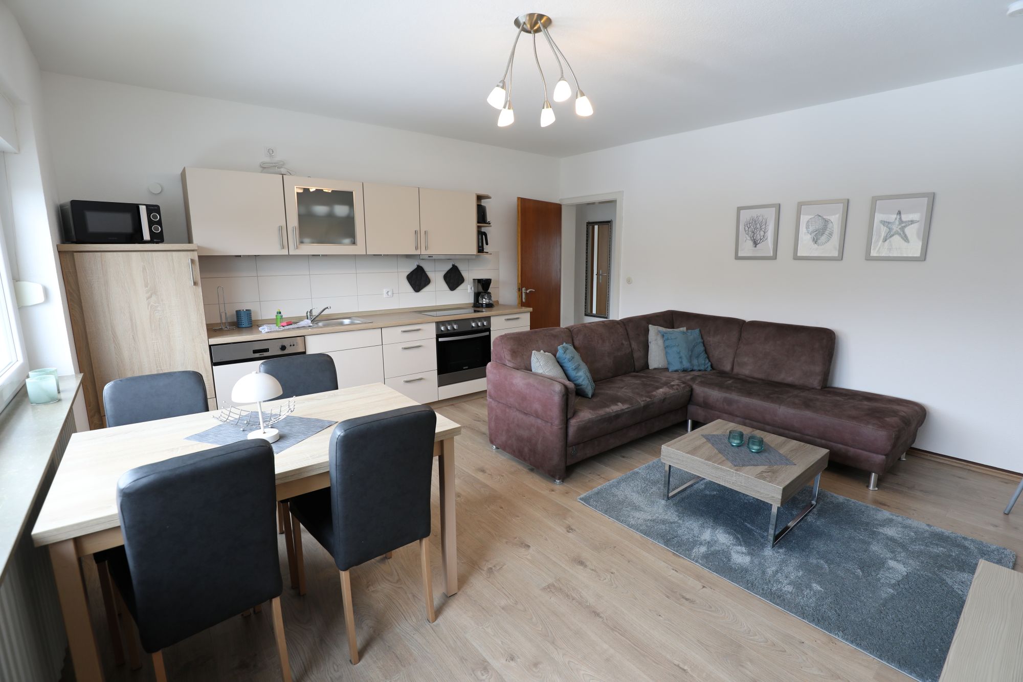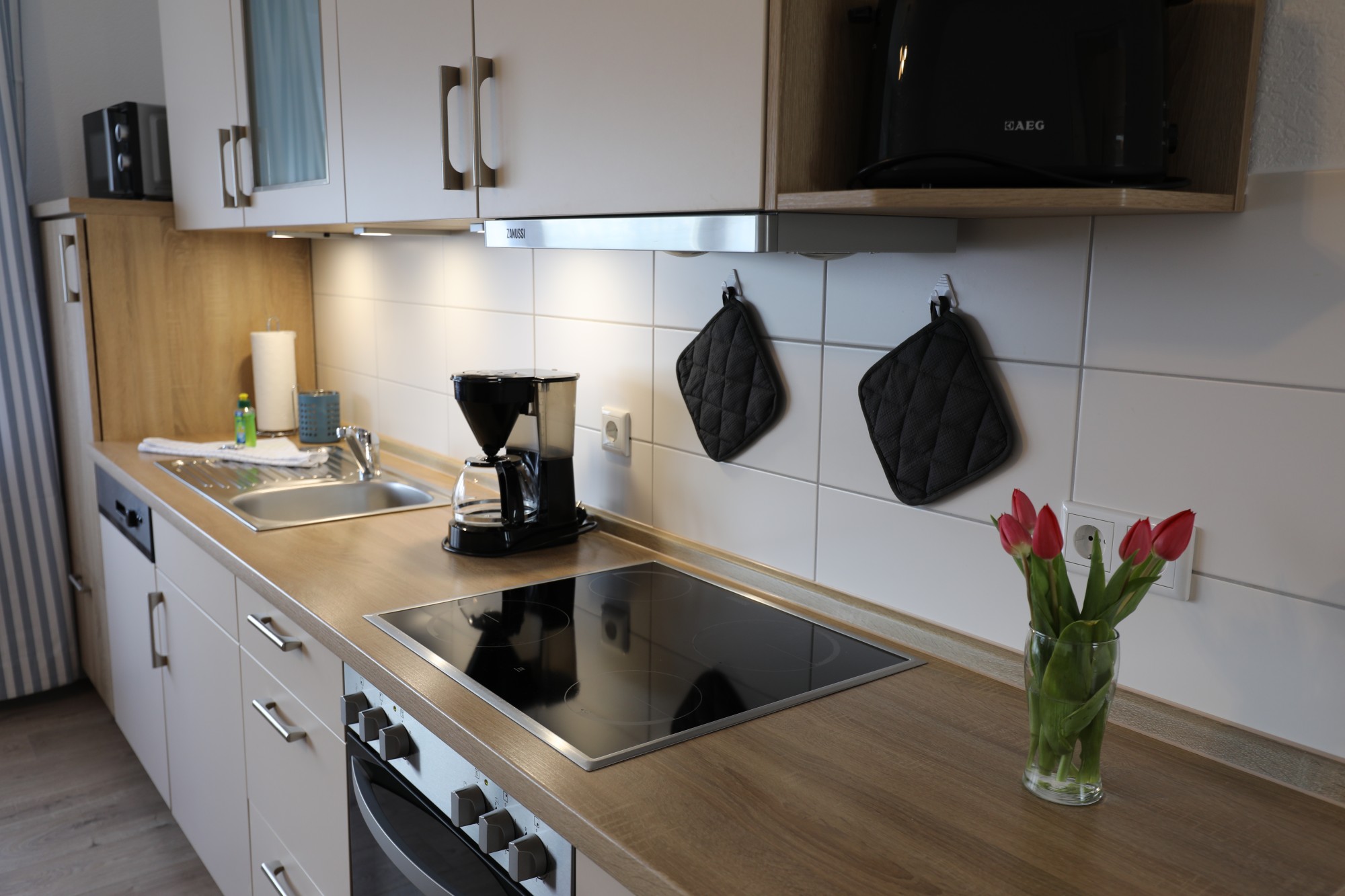 Die Küchenzeile ist ausgestattet mit einem Ceranfeld, Backofen, Kühlschrank, Toaster, Wasserkocher sowie einer Mikrowolle.