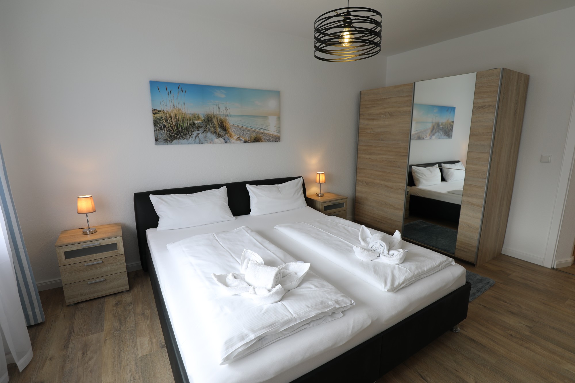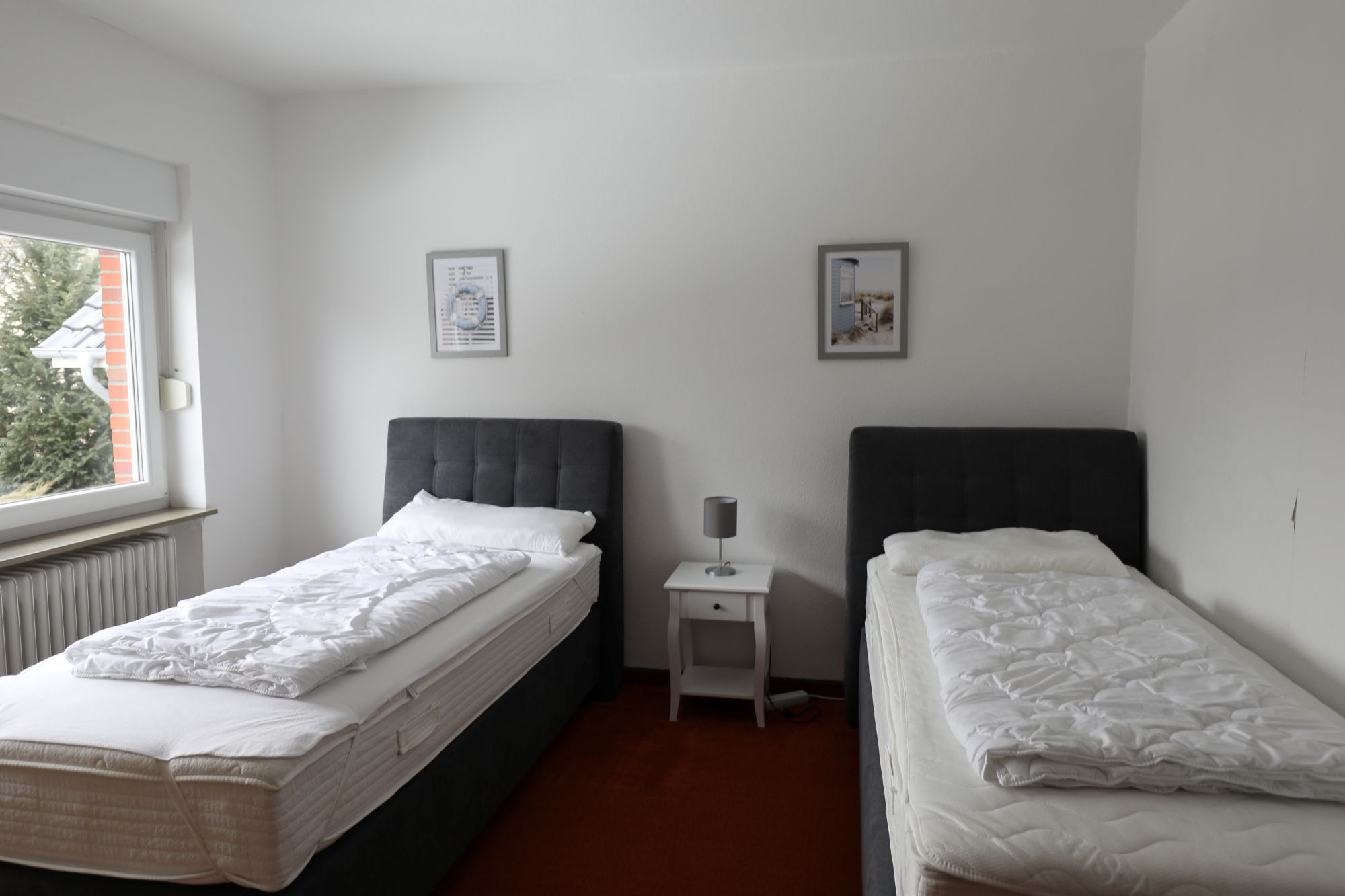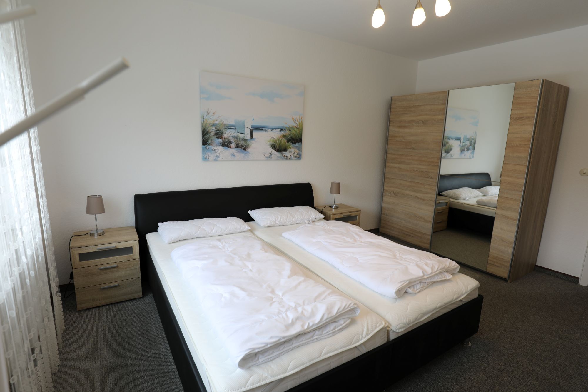 Es sind 2 separate Schlafzimmer vorhanden, eins mit Doppelbett und eins mit zwei Einzelbetten).