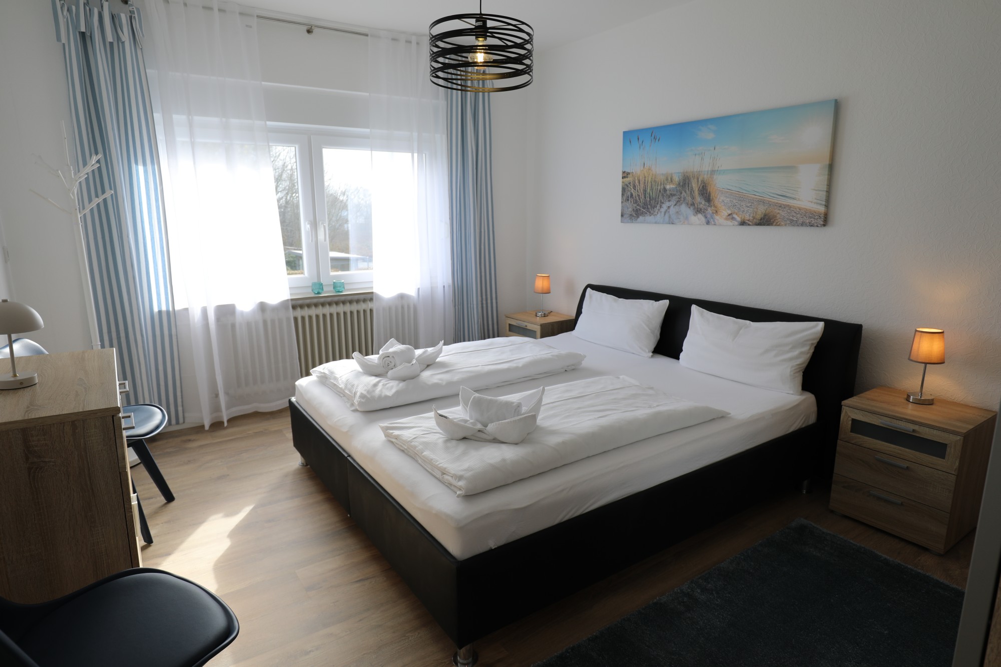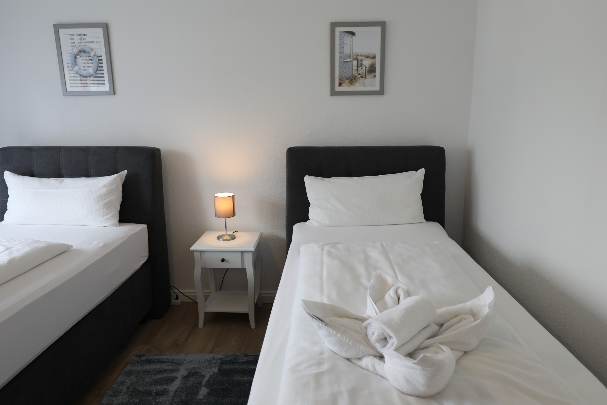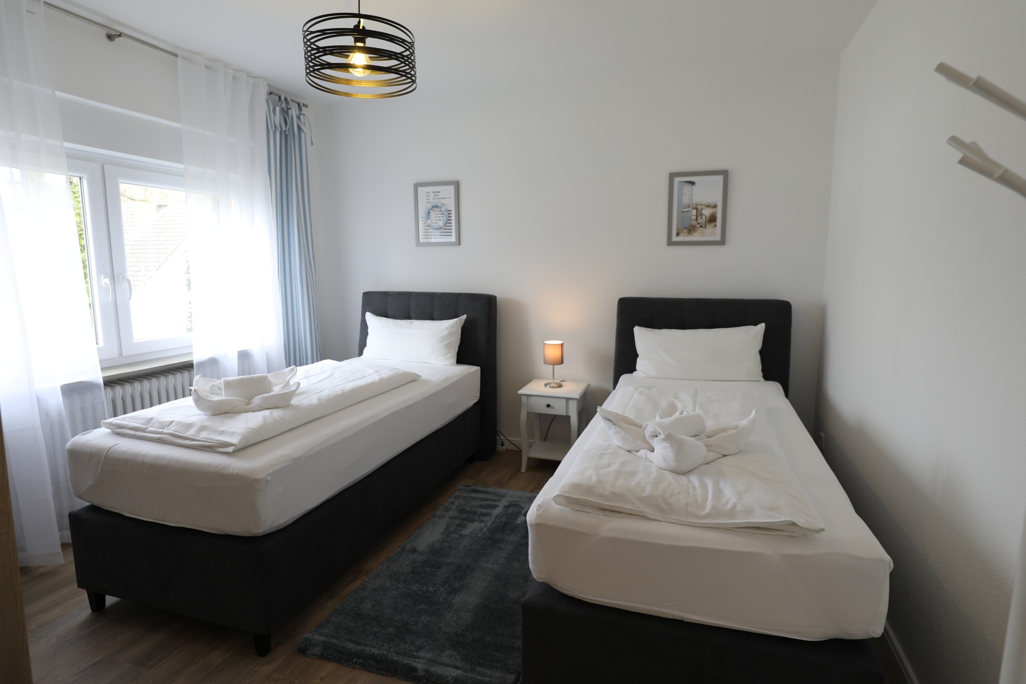 Es sind 2 separate Schlafzimmer vorhanden, eins mit Doppelbett und eins mit zwei Einzelbetten).