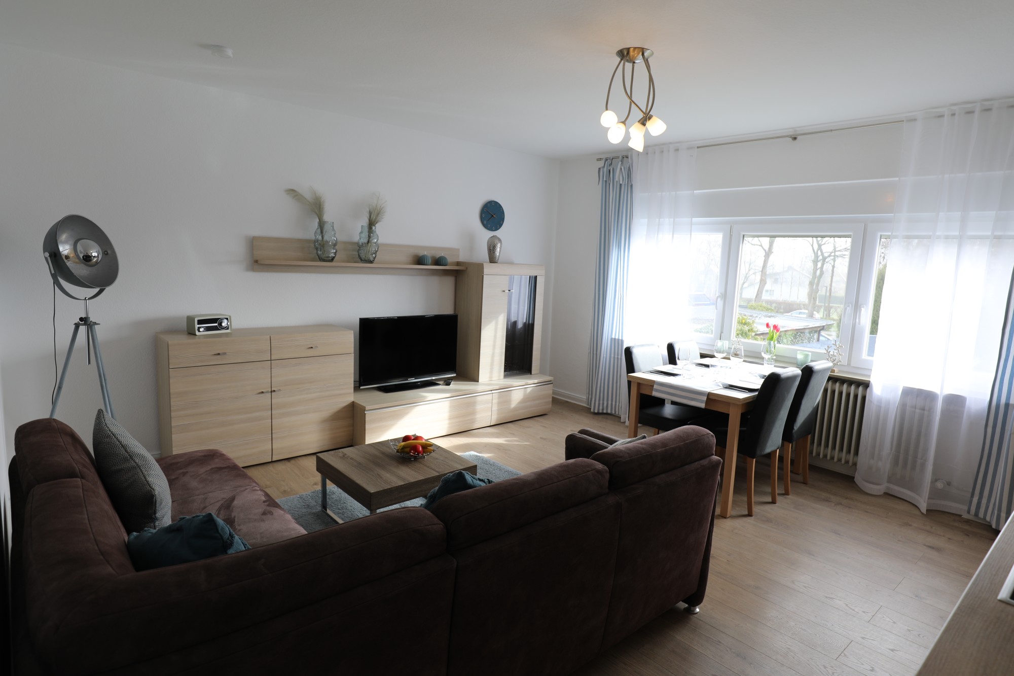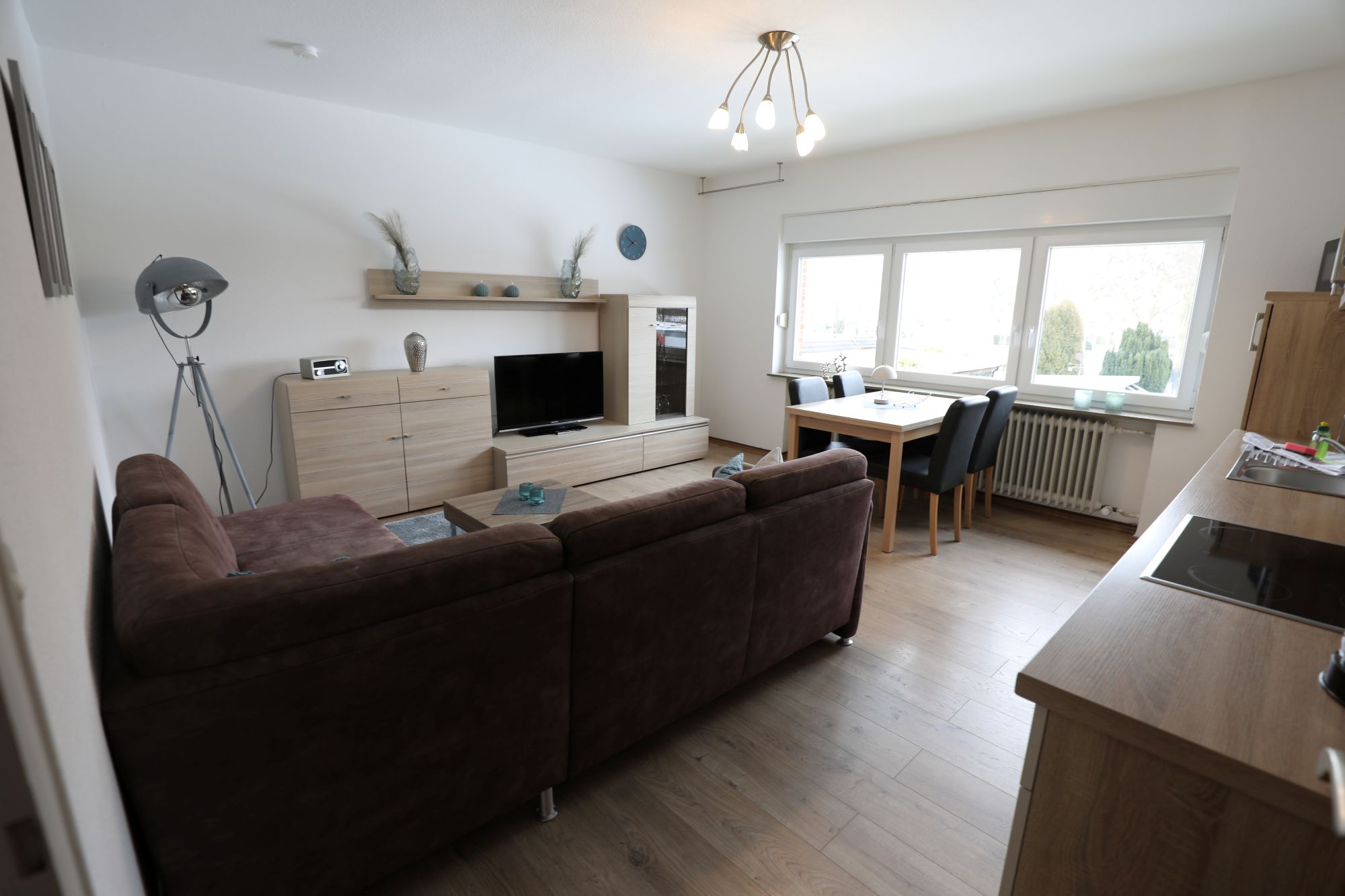 Das geräumige Wohnzimmer verfügt über eine bequeme Couchgruppe, einen separaten Essplatz und eine komplett ausgestattete Küchenzeile.