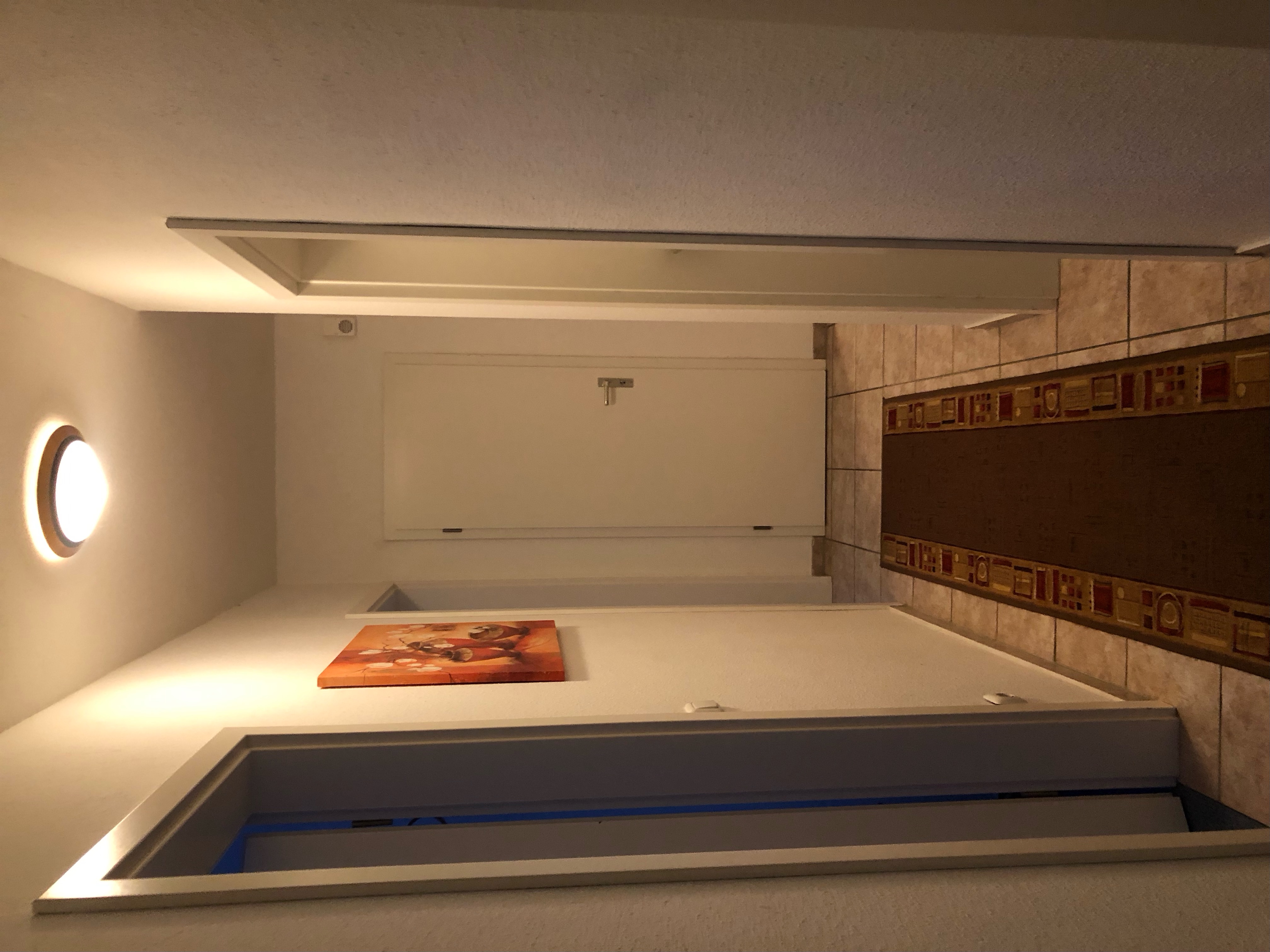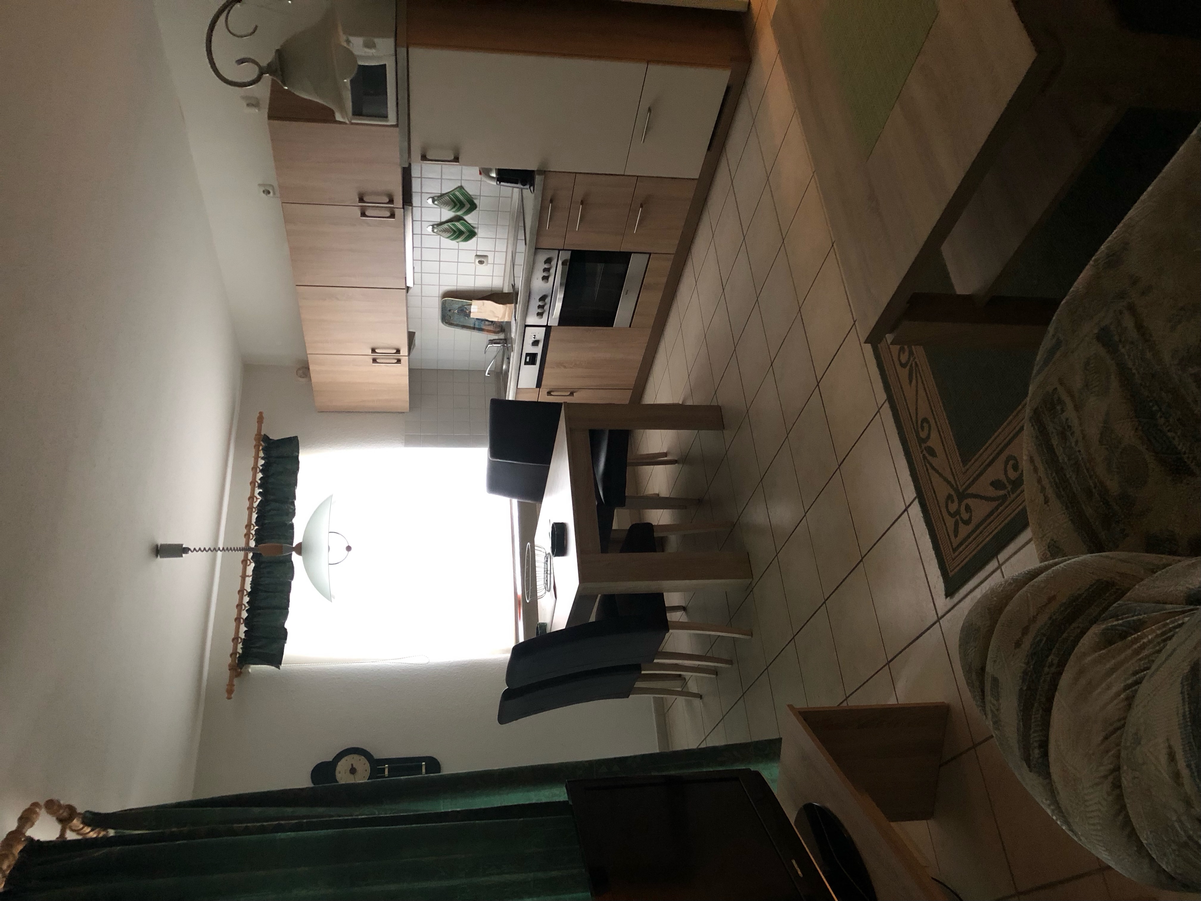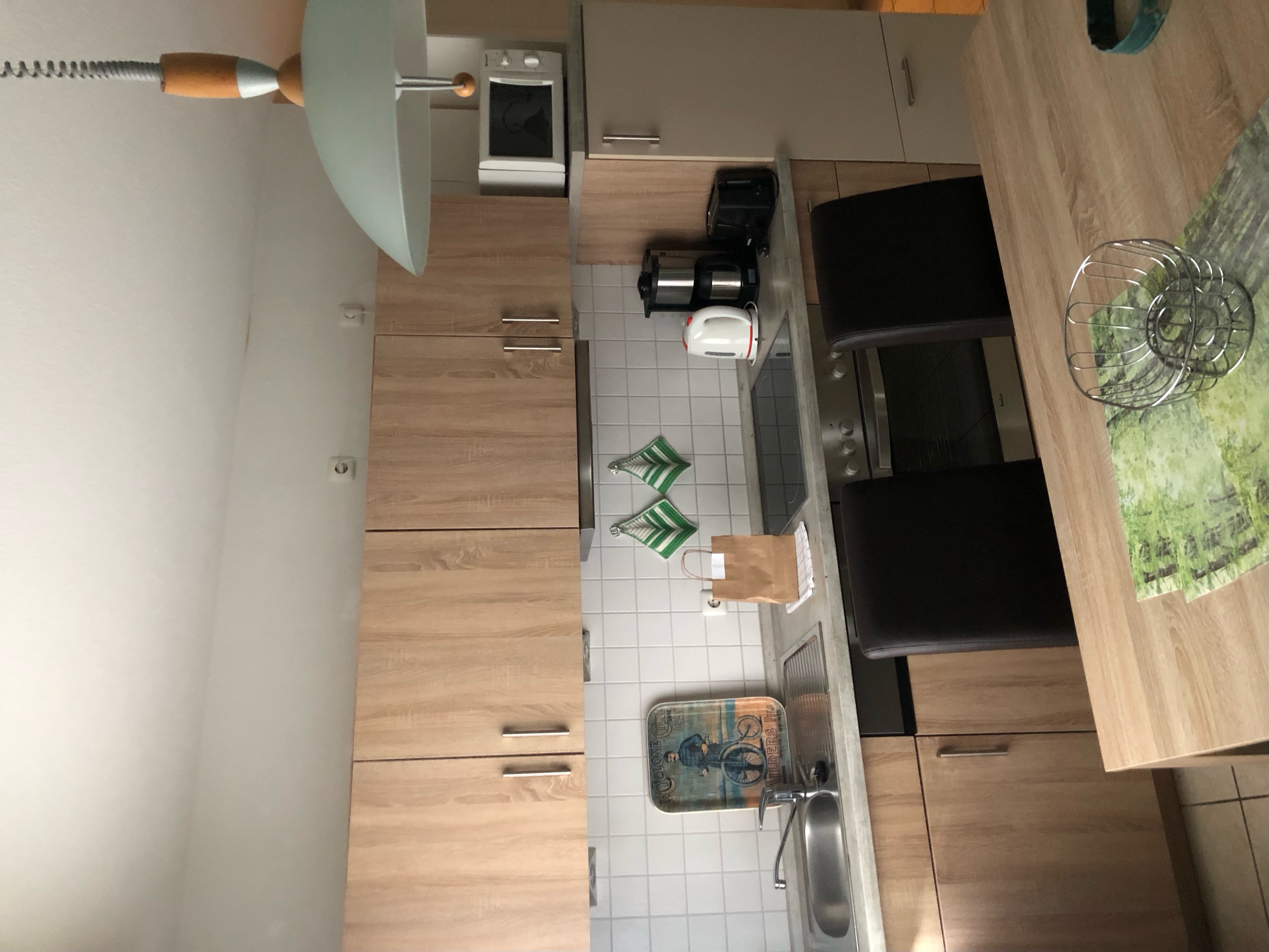Die Küchenzeile ist ausgestattet mit einem Ceranfeld, Backofen, Kühlschrank, Toaster, Wasserkocher sowie einer Mikrowolle.