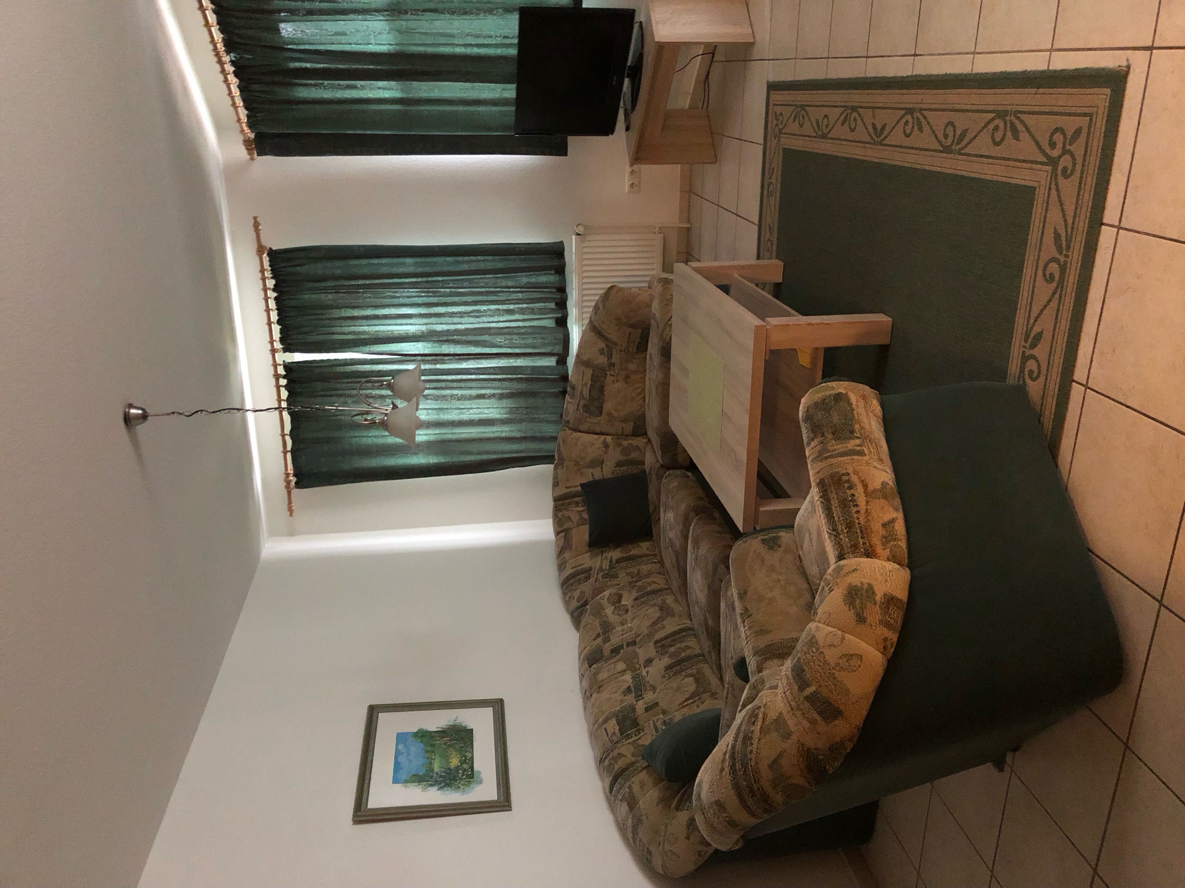 Das geräumige Wohnzimmer verfügt über eine bequeme Couchgruppe, einen separaten Essplatz und eine komplett ausgestattete Küchenzeile.