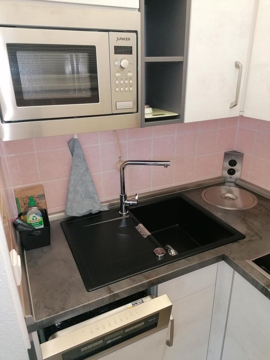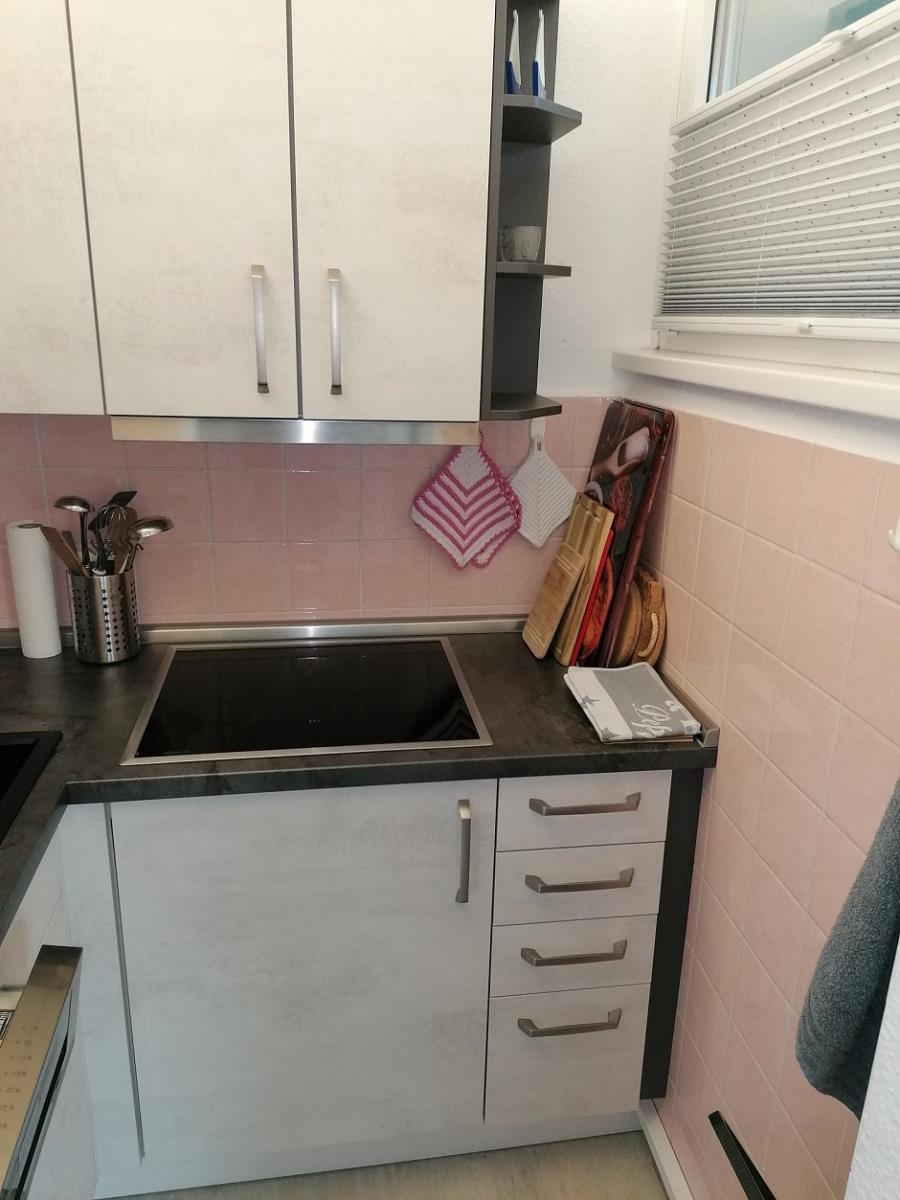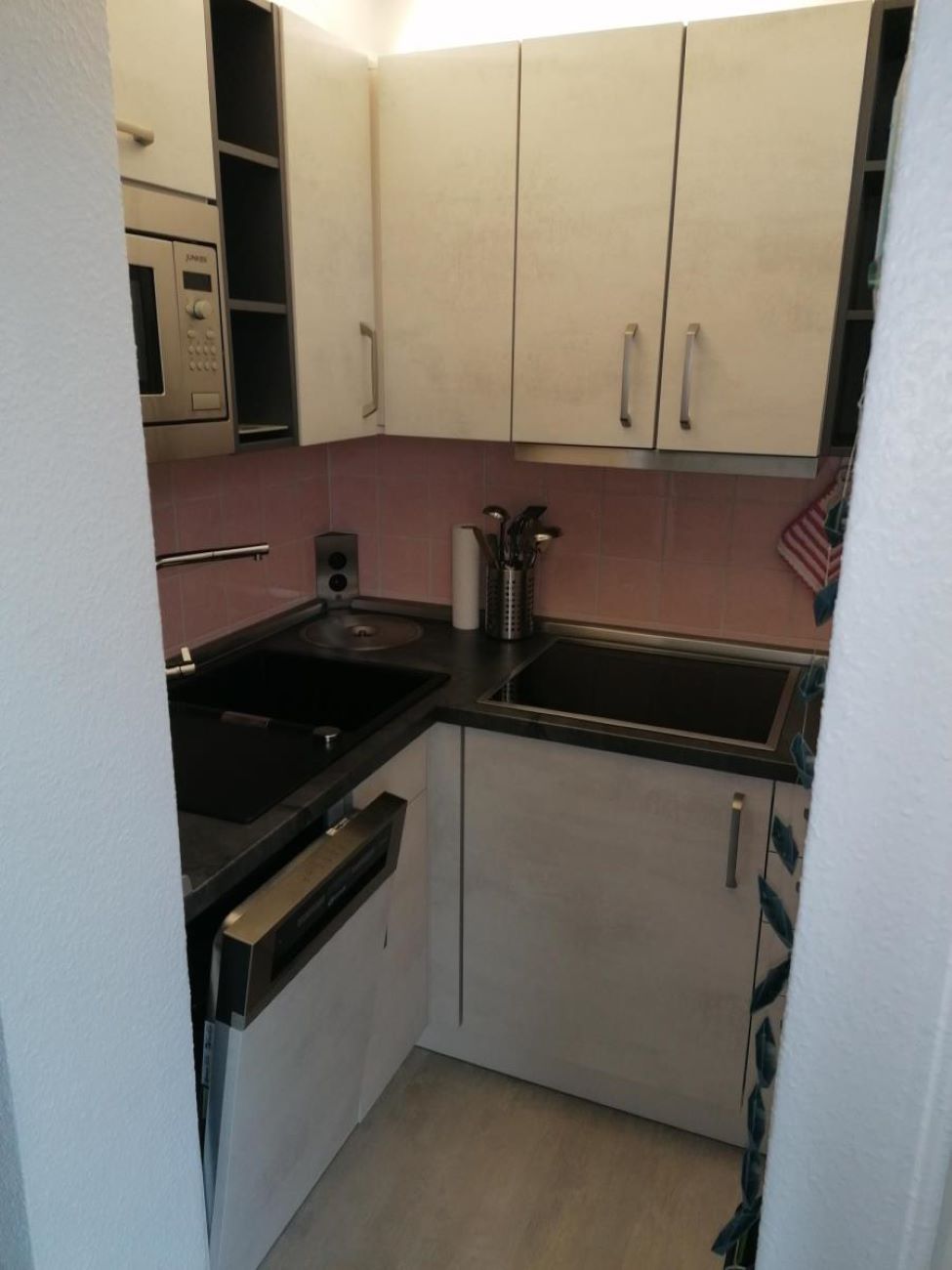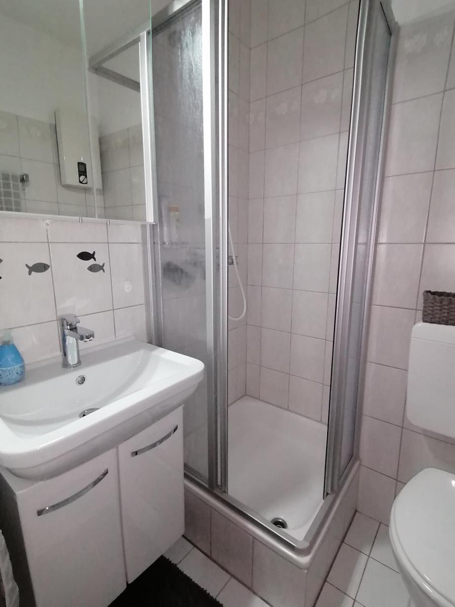 Die separate Einbauküche ist komplett ausgestattet – ideal für Selbstversorger. Im Badezimmer finden Sie Dusche, WC, Waschbecken und Spiegelschrank.