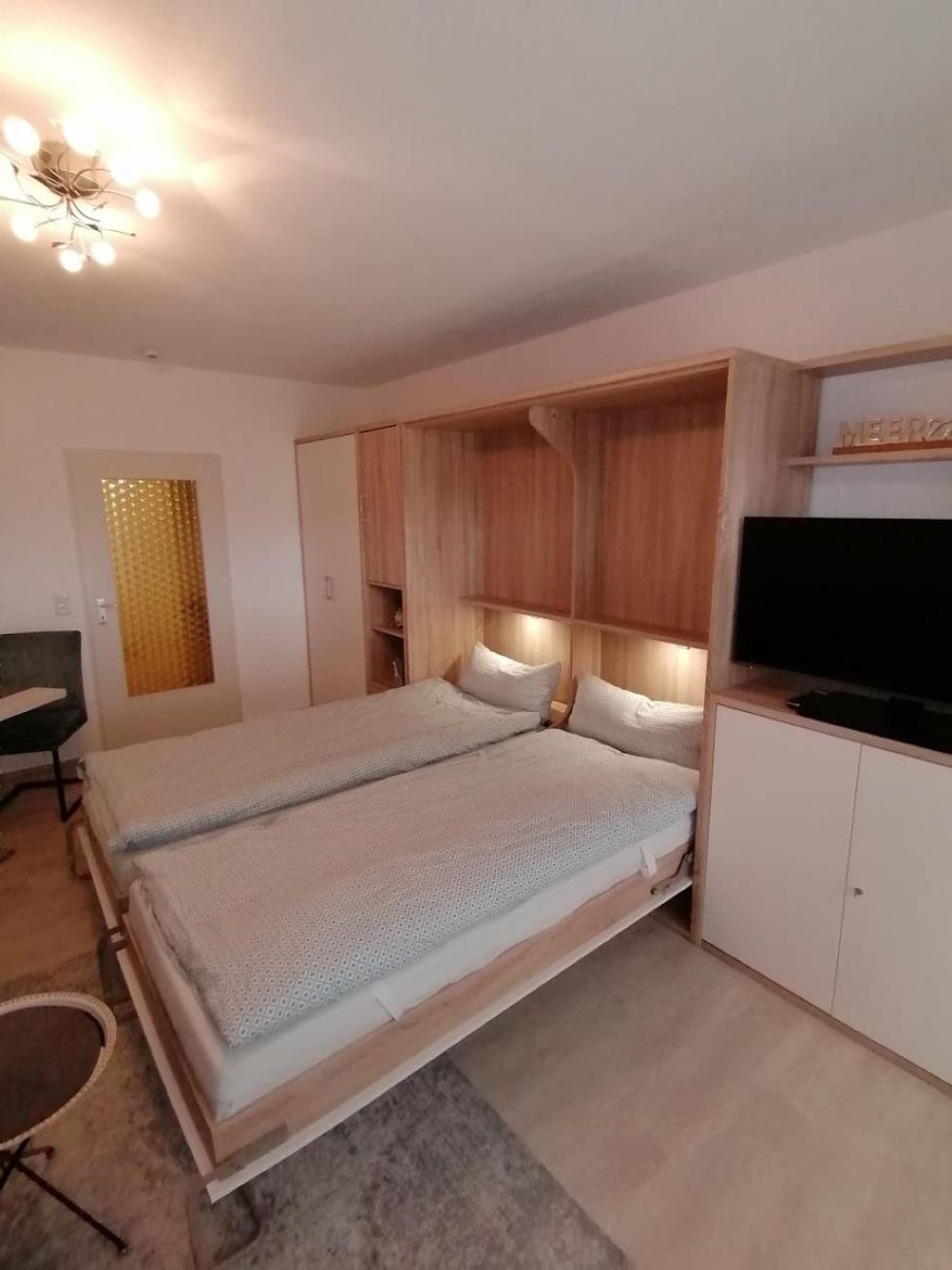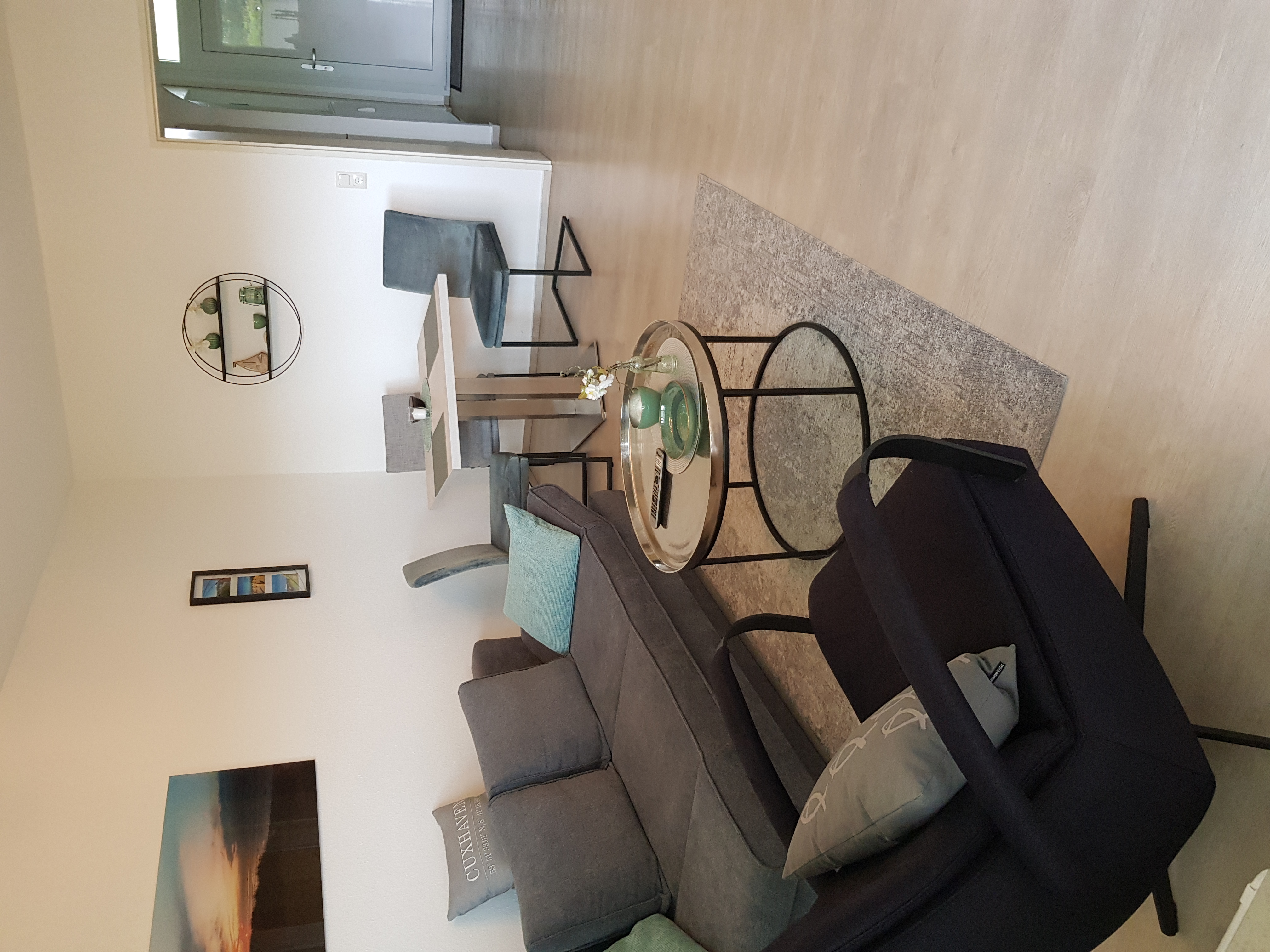 Die Wohnung ist stufenlos zugänglich und verfügt über einen kombinierten Wohn- und Schlafbereich mit einem praktischen Schrankbett (2x 90x200 cm), einer modernen Couch, einem bequemen Sessel und einer gemütlichen Essecke. Vom Wohnbereich aus gelangen Sie direkt auf die nach Süden ausgerichtete Terrasse, die mit bequemen Gartenmöbeln zum Entspannen einlädt.