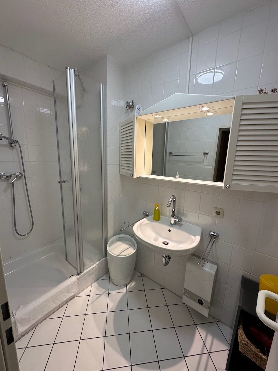 Im oberen Bereich finden Sie einen geräumigen Wohnbereich mit Fernseher sowie eine Küchenzeile mit Essplatz. Das Bad ist mit einer Dusche ausgestattet, ein separates WC sorgt für zusätzlichen Komfort.