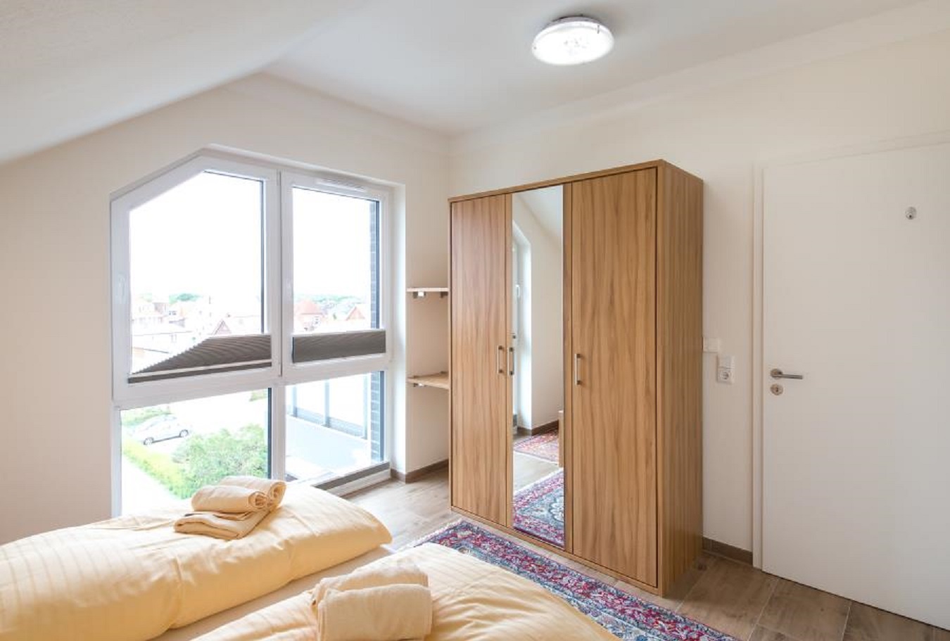 Die Wohnung befindet sich in der 4. Etage mit Fahrstuhl, hat zwei Schlafzimmer, eins mit Doppelbett und ein weiters mit einer gemütlichen modernen Doppelschlafcouch.