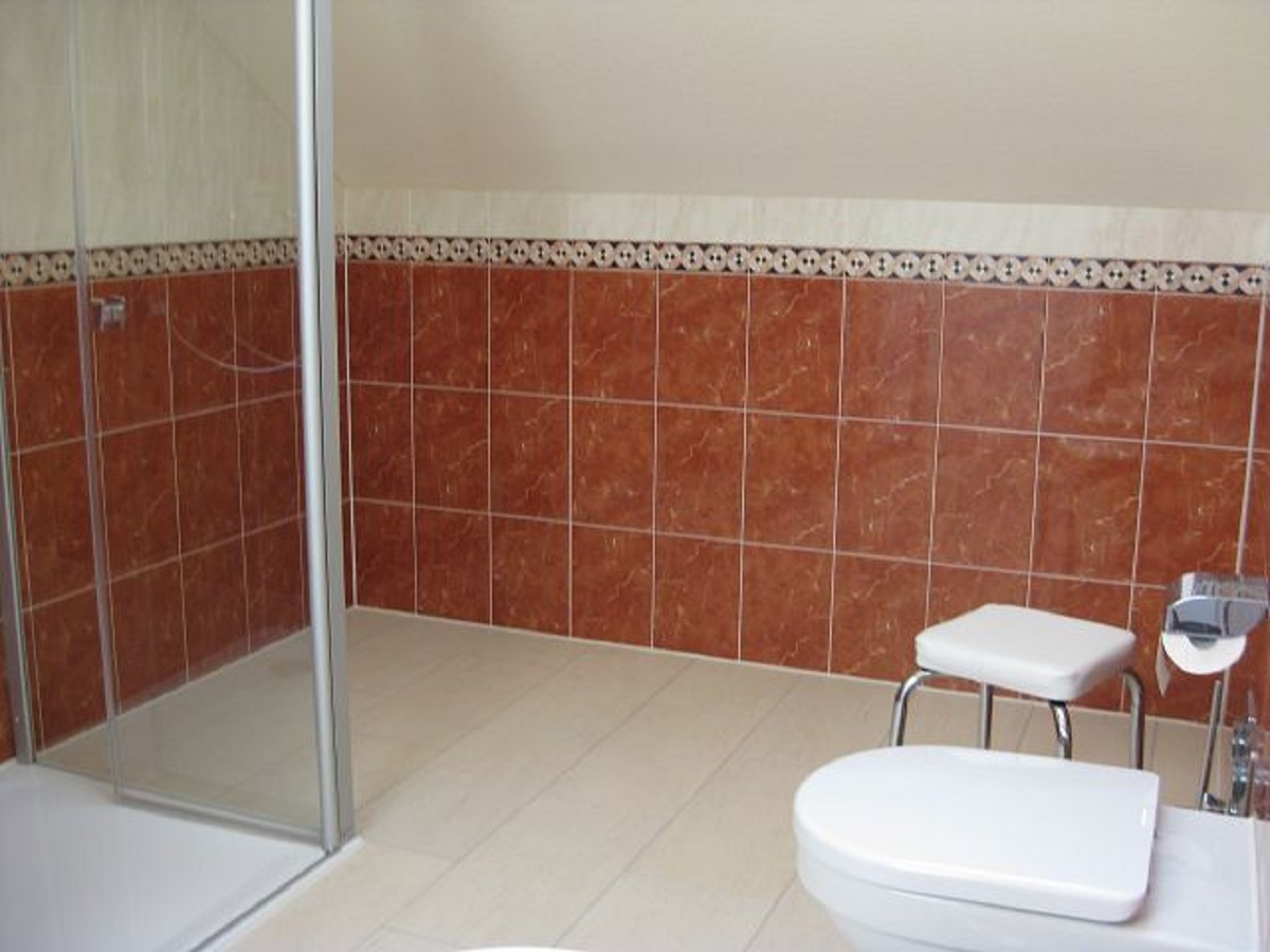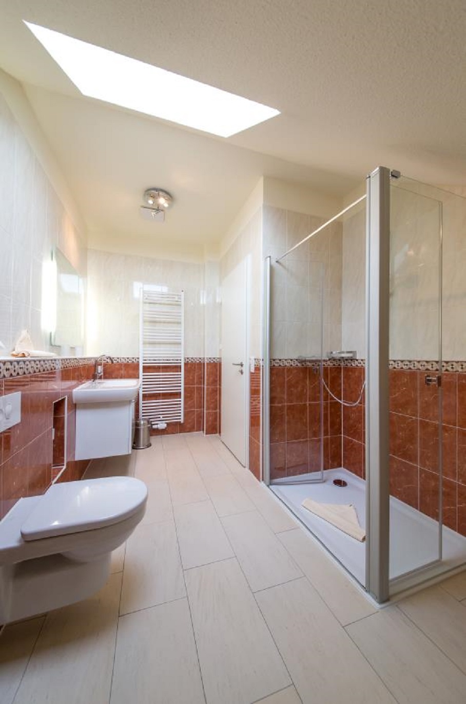 Das Bad verfügt über eine ebenerdige Dusche, WC und elektrisch zu öffnendem Dachfenster.