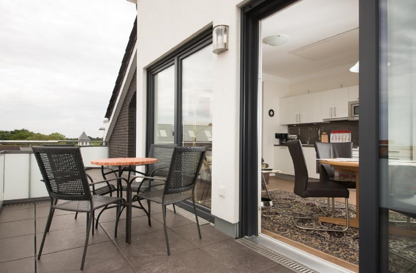 Großer Balkon mit den dazugehörigen Balkonmöbel zum Relaxen.