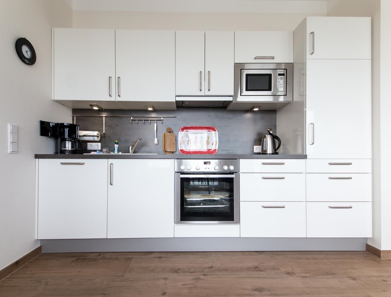 Das Wohnzimmer hat einen großem Flachbildschirm und eine Essecke und eine integrierte Küche (Backofen ,Geschirrspüler).