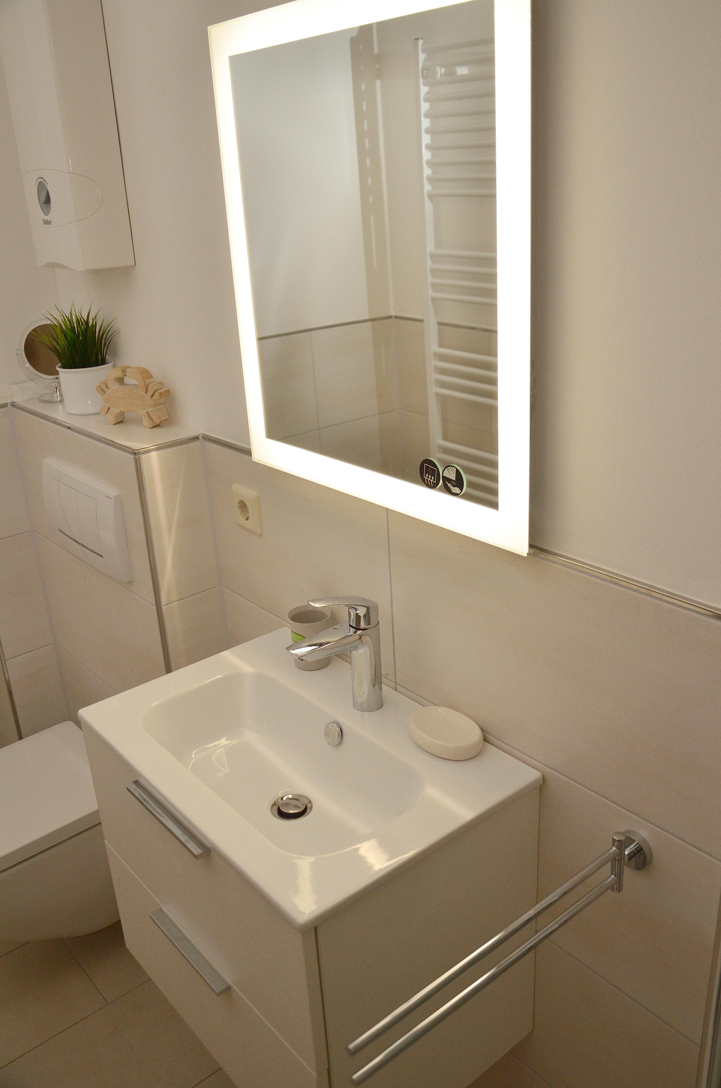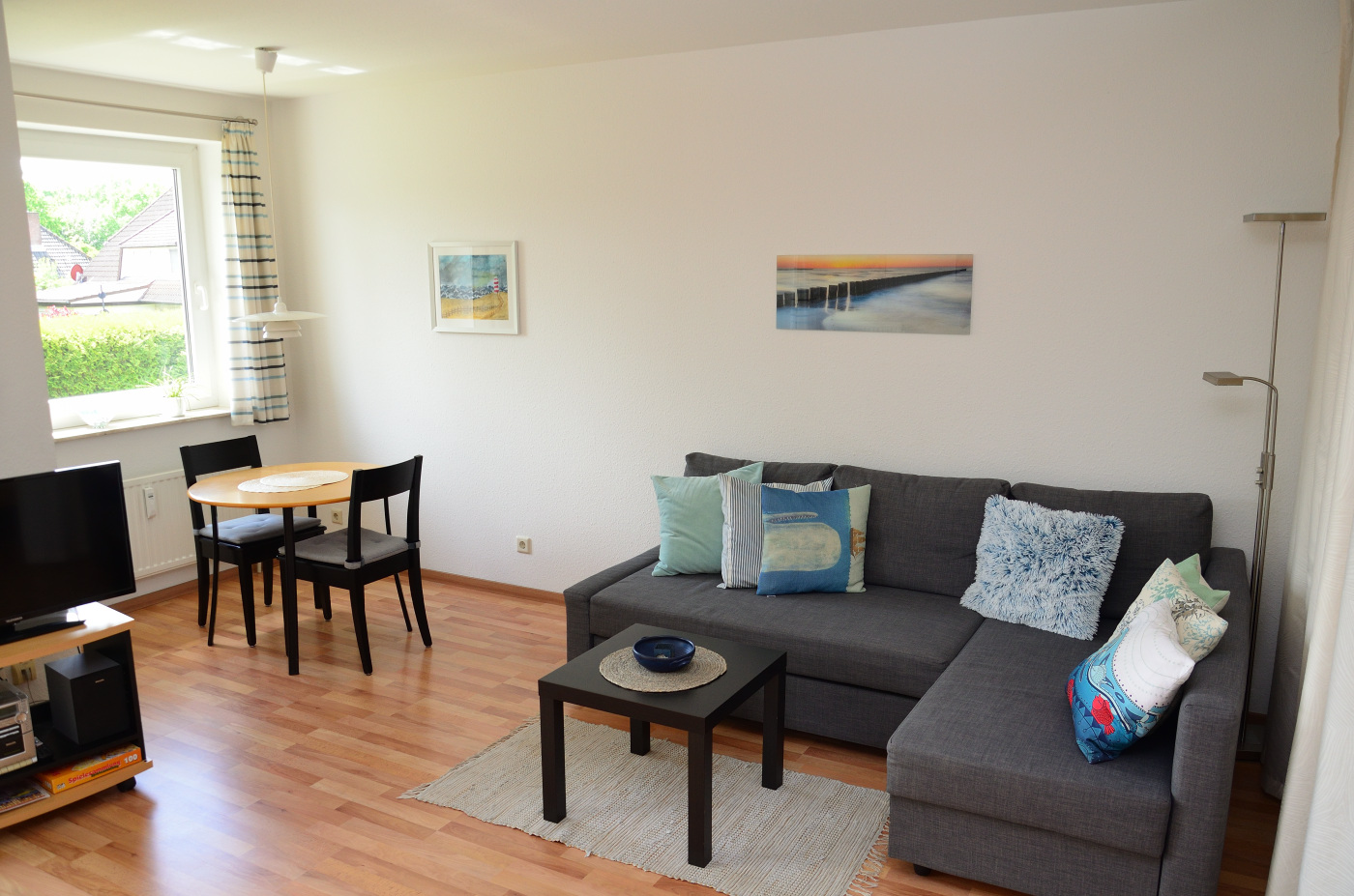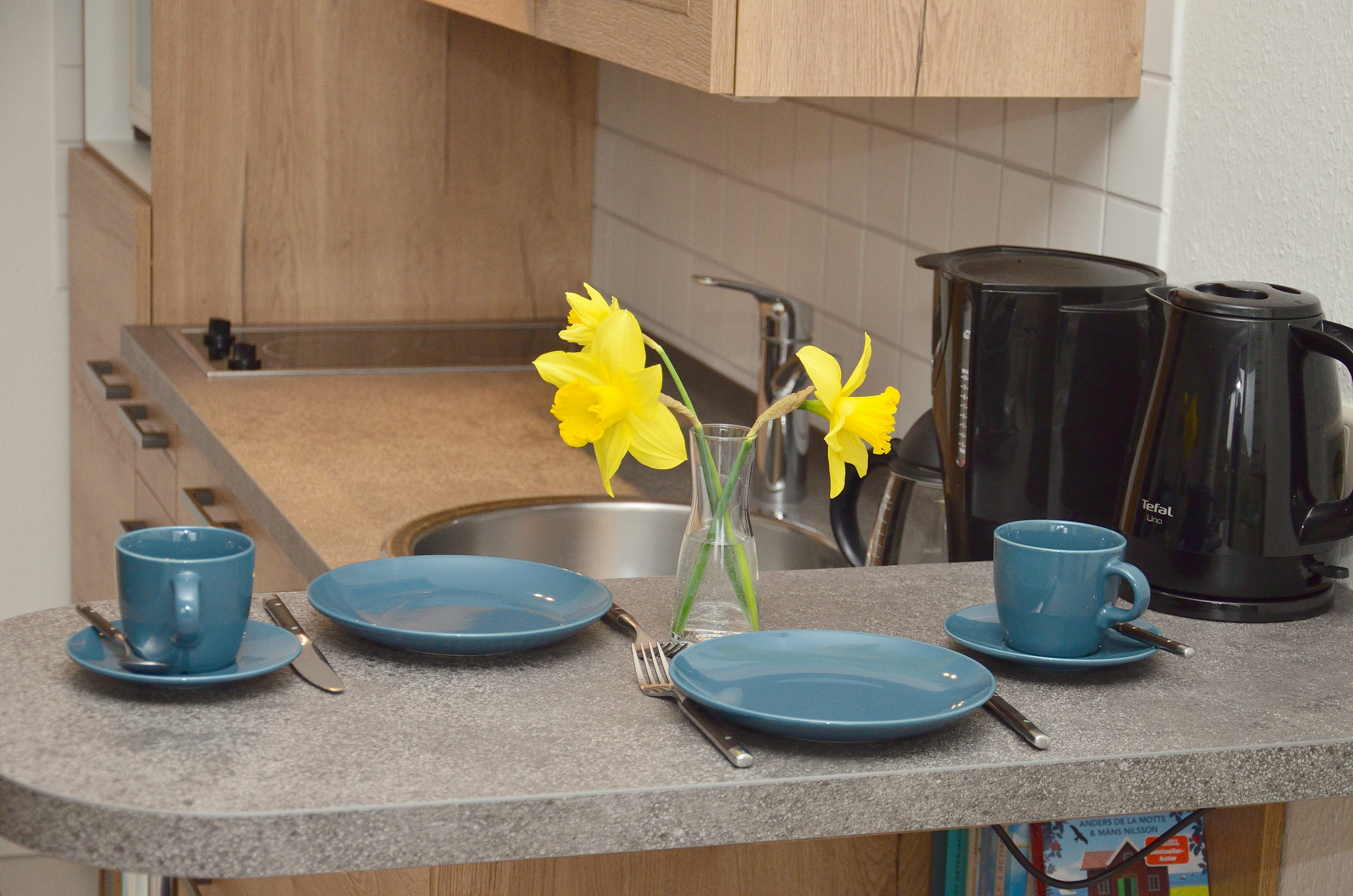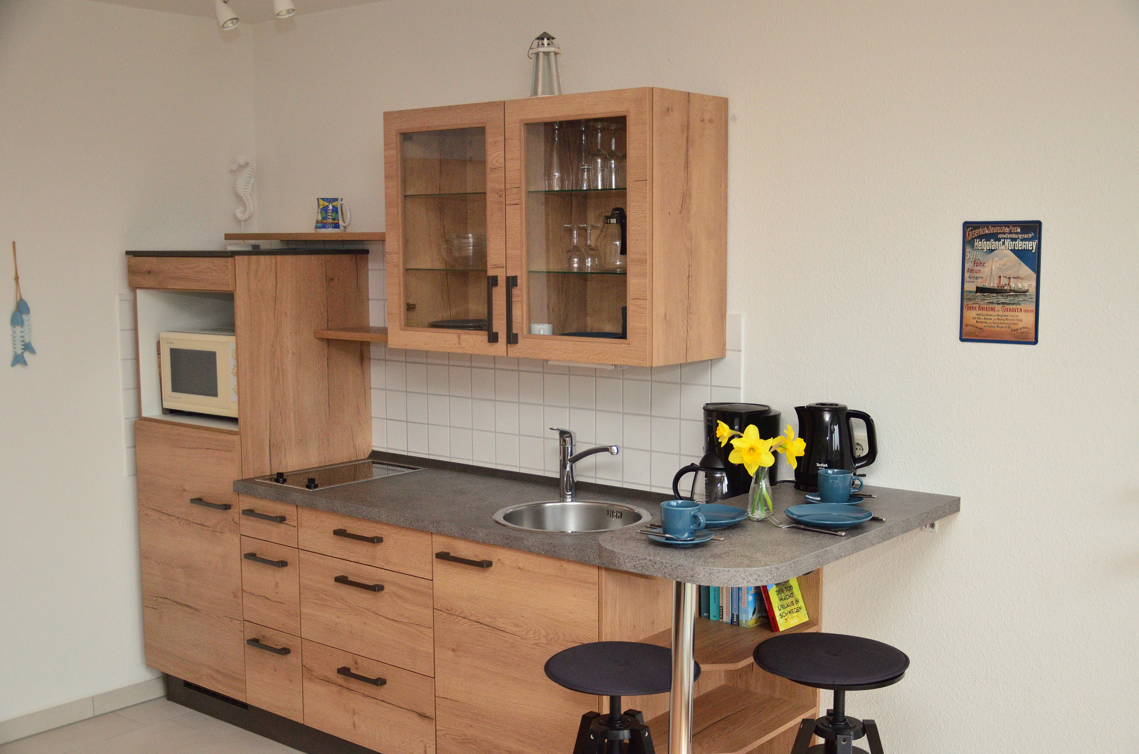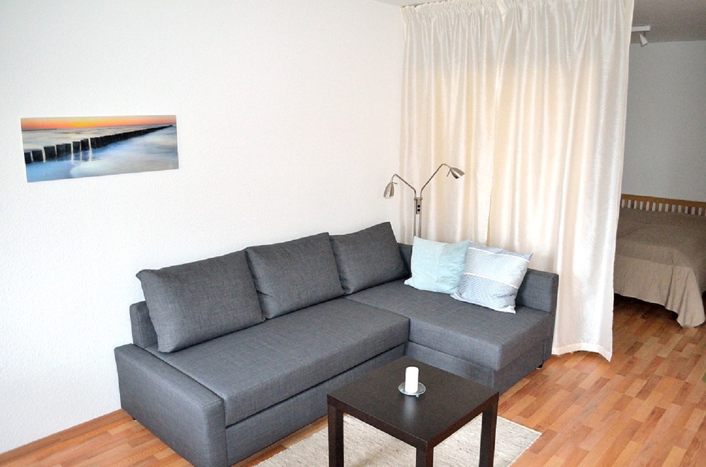 Die geschmackvoll sanierte Wohnung bietet einen offenen Wohnschlafraum mit moderner Sitzgarnitur, TV, kostenlosem WLAN und einem gemütlichen Doppelbett in einer Schlafnische. Die neue, integrierte Küchenzeile ist mit Kühlschrank, Cerankochfeld und Mikrowelle ausgestattet und bietet alles für die kleine Selbstverpflegung zwischendurch.