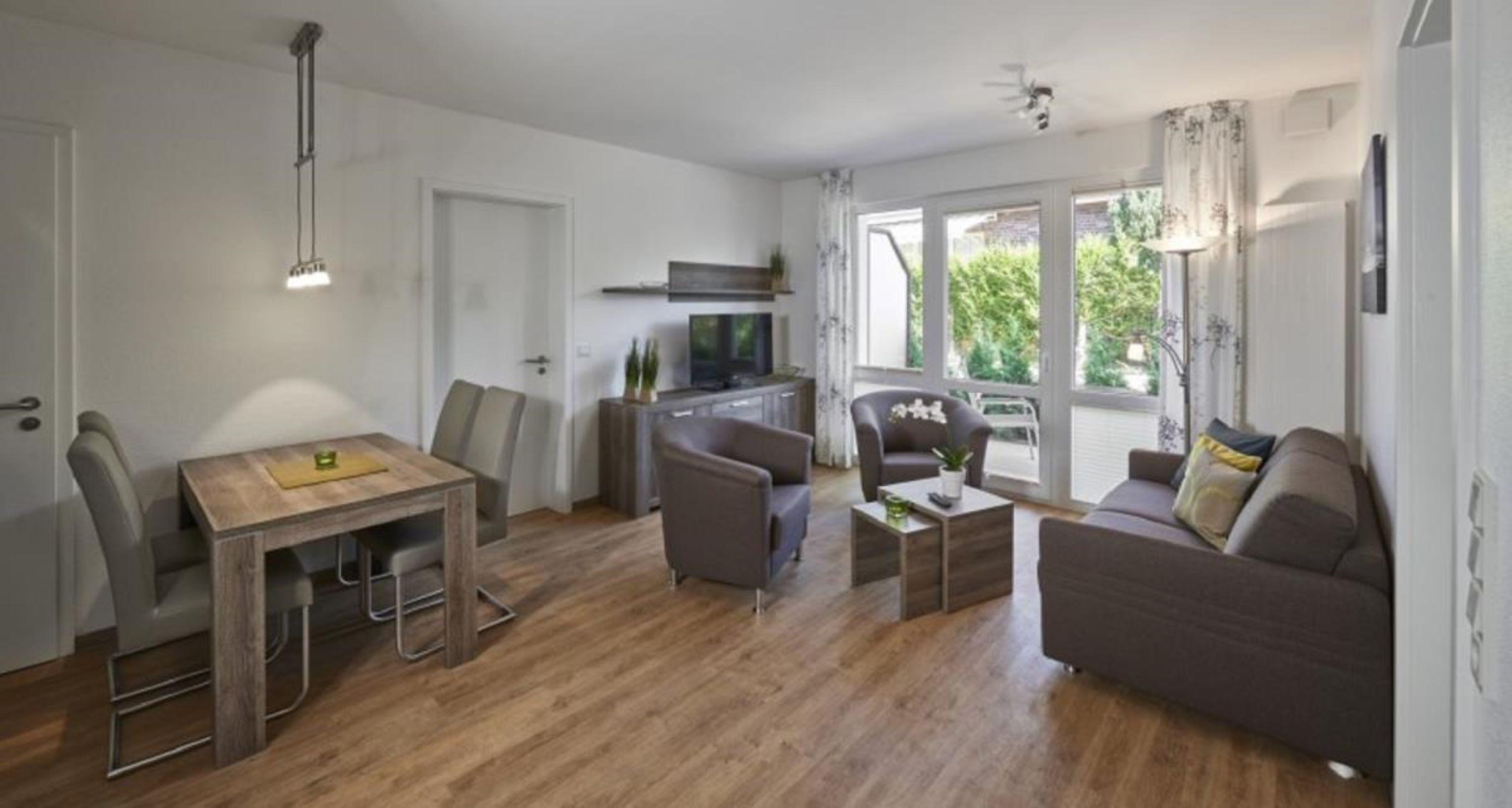 Die 59 m² große Wohnung befindet sich im Erdgeschoss und verfügt über direkten Zugang zum Garten – ideal für Familien mit Kindern oder Gäste, die gerne im Grünen frühstücken möchten. Die Einrichtung ist durchgehend modern, hochwertig und auf Wohlfühlen ausgelegt – mit stilvollen Möbeln, komfortablen Betten und einem durchdachten Raumkonzept. Jede Wohnung verfügt über kostenloses WLAN und einen hauseigenen Parkplatz direkt am Gebäude. Wäschepakete sind bei uns bequem zubuchbar. Das Mitbringen von Haustieren ist im Hause „Op de Geest“ jedoch nicht gestattet.