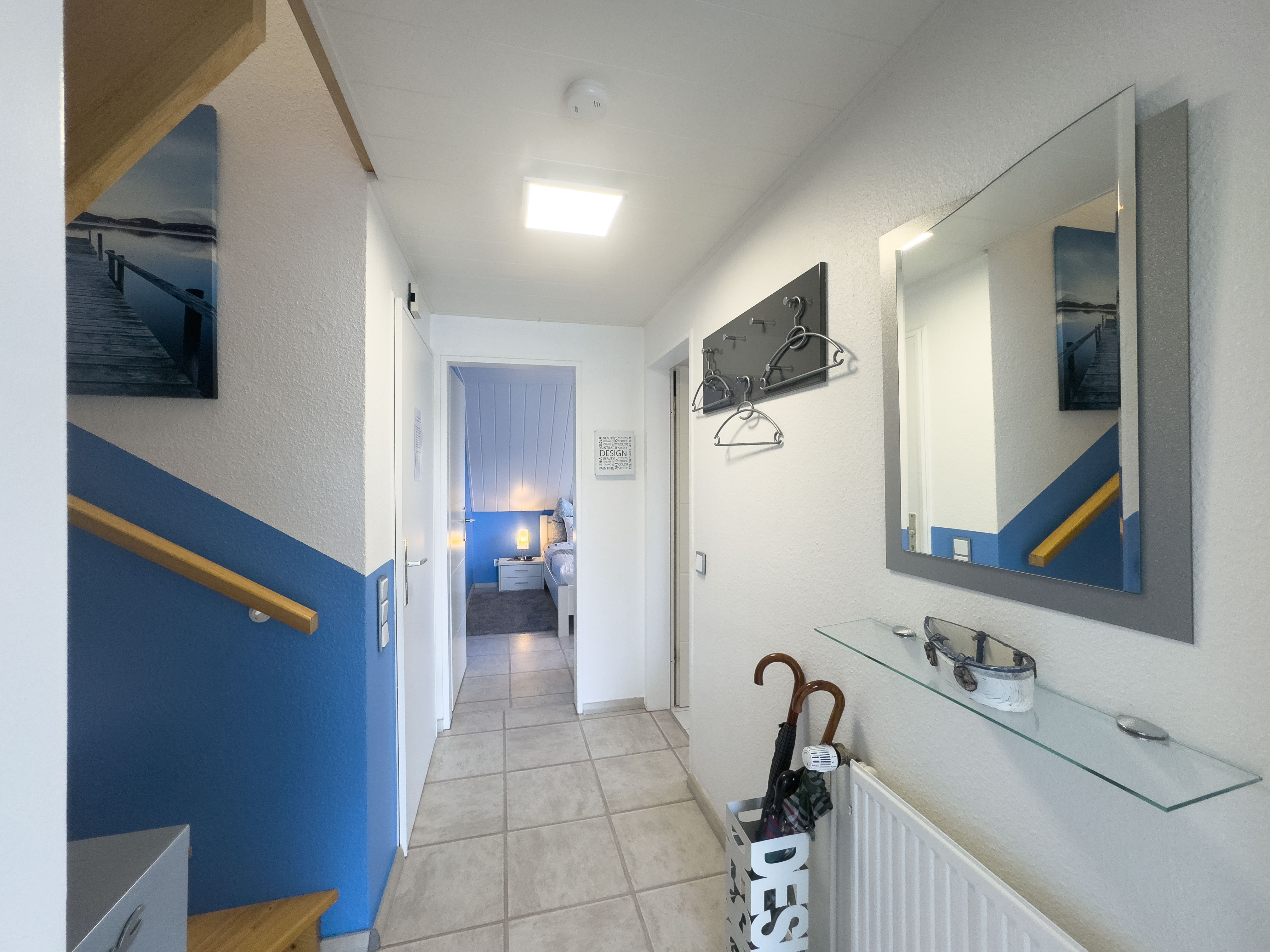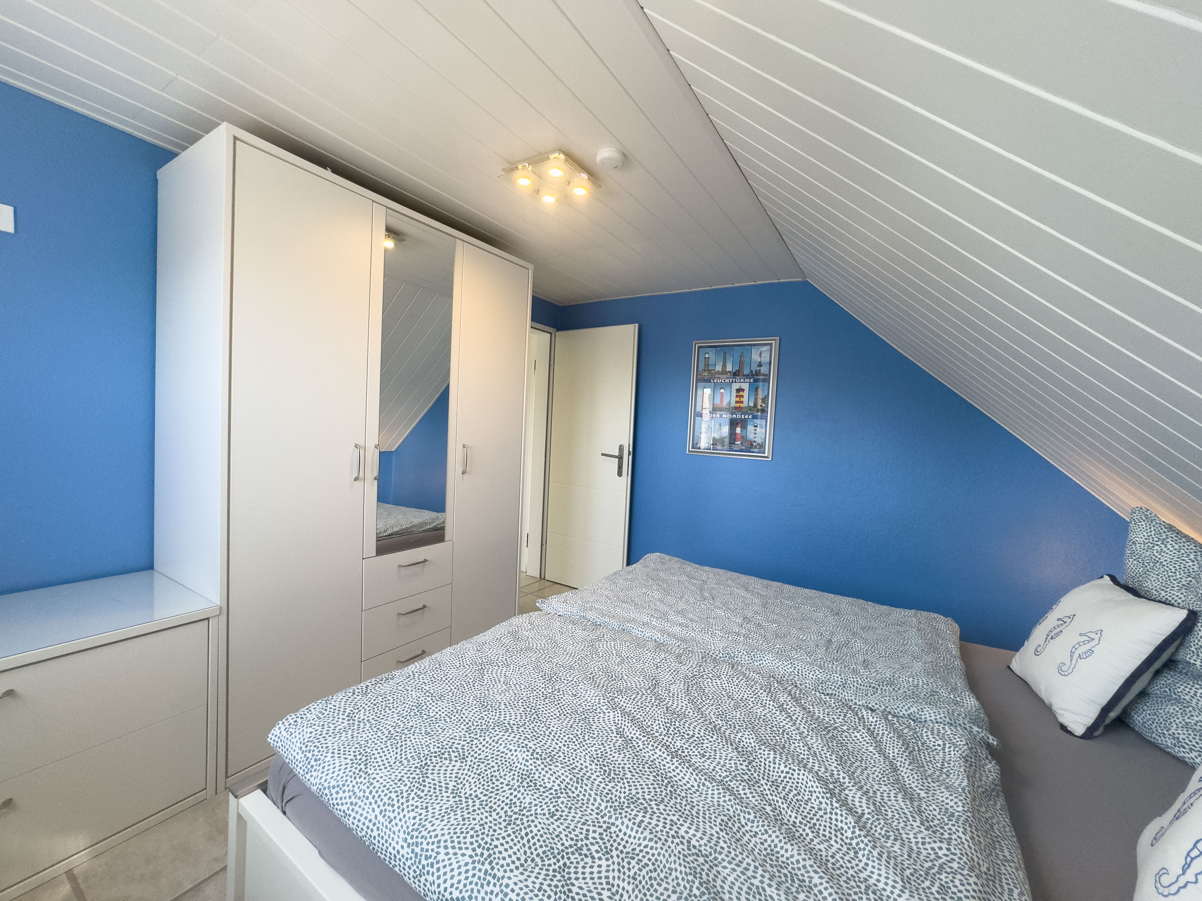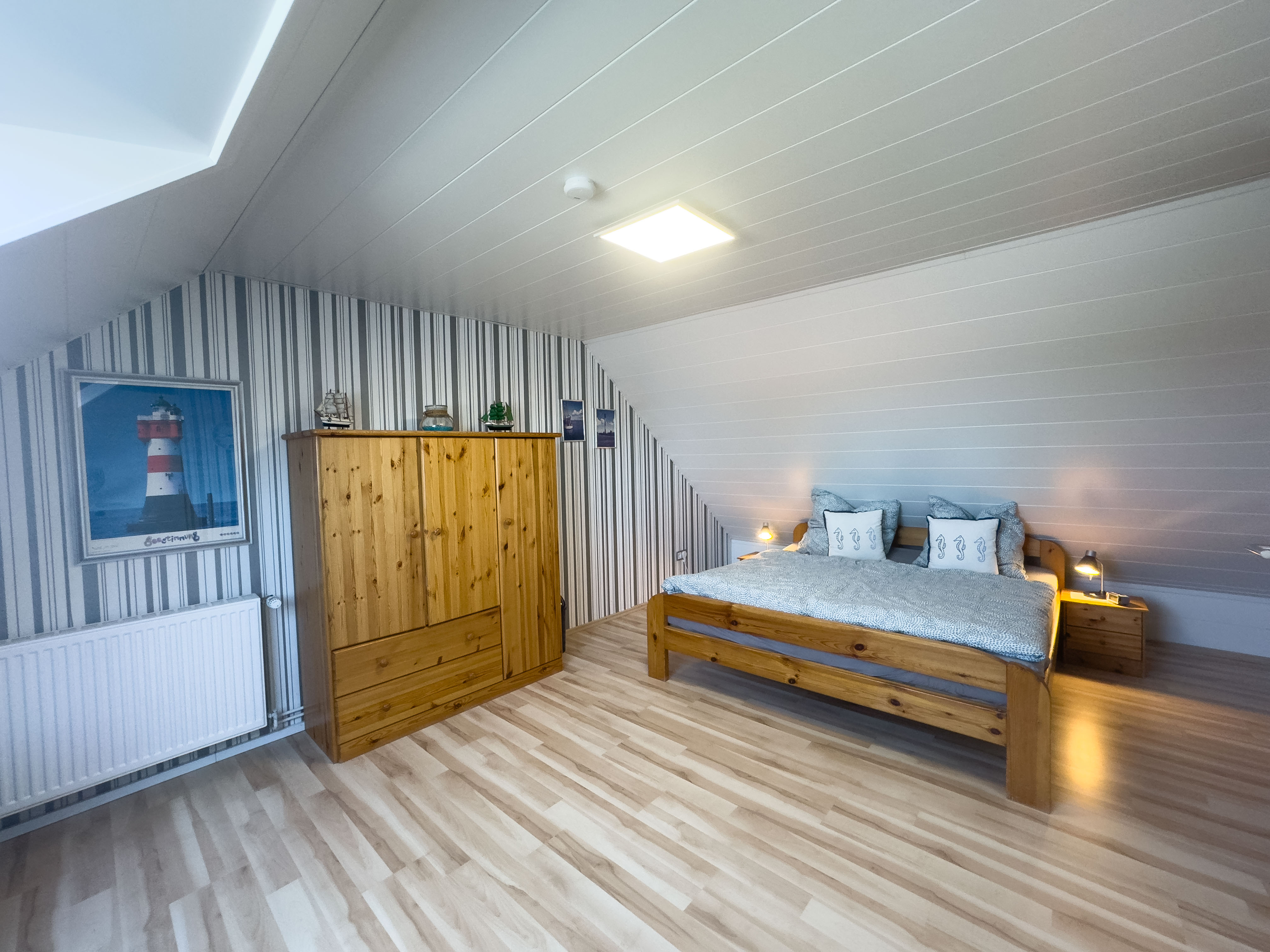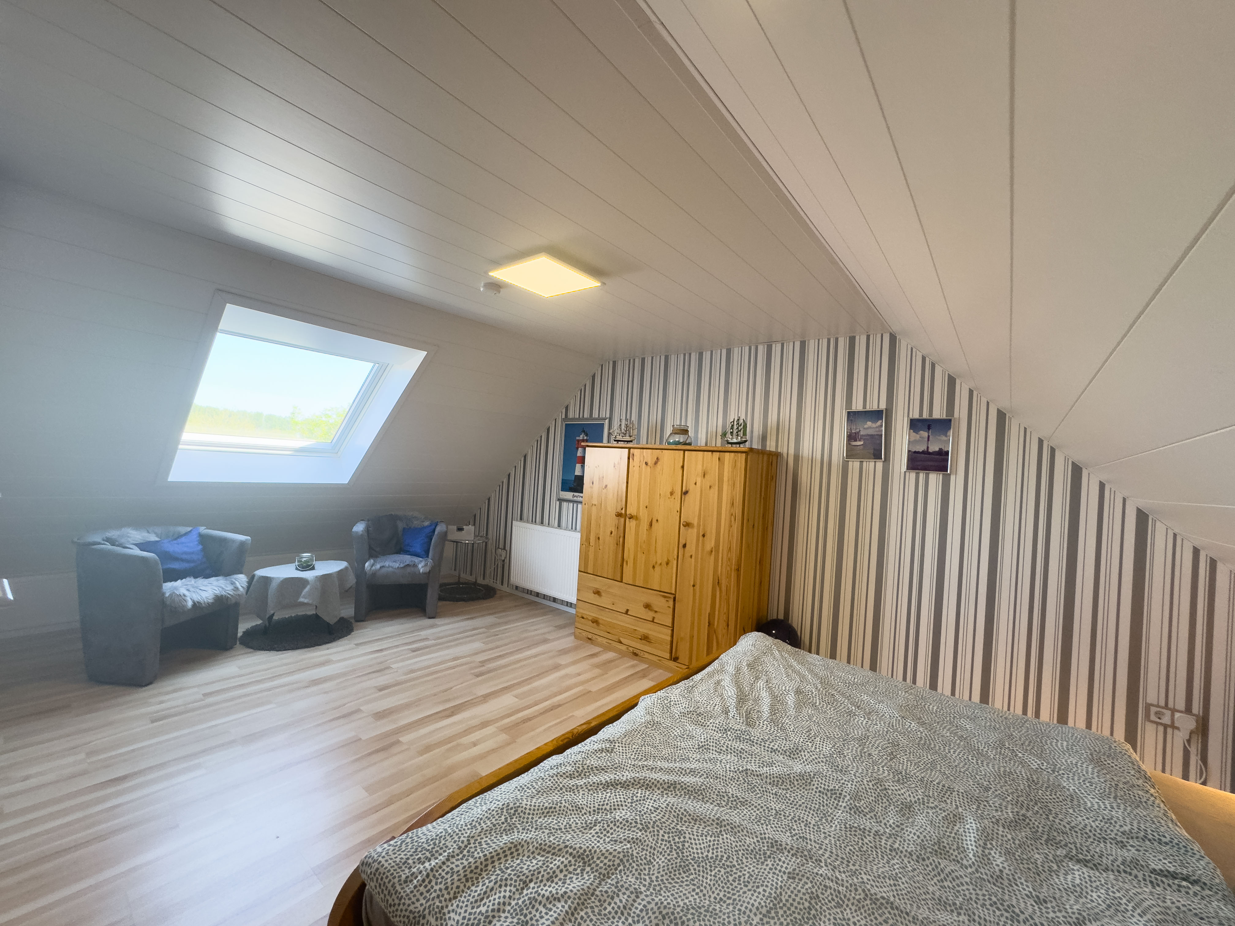 Das helle Badezimmer verfügt über Dusche und WC. Im Hauptschlafzimmer sorgt ein komfortables Doppelbett und ein Kleiderschrank für erholsamen Schlaf und ausreichend Stauraum. Über eine offene Holztreppe erreichen Sie das Dachgeschoss – hier finden Sie ein weiteres Doppelbett, einen Schrank sowie eine einladende Leseecke unter dem Dach.