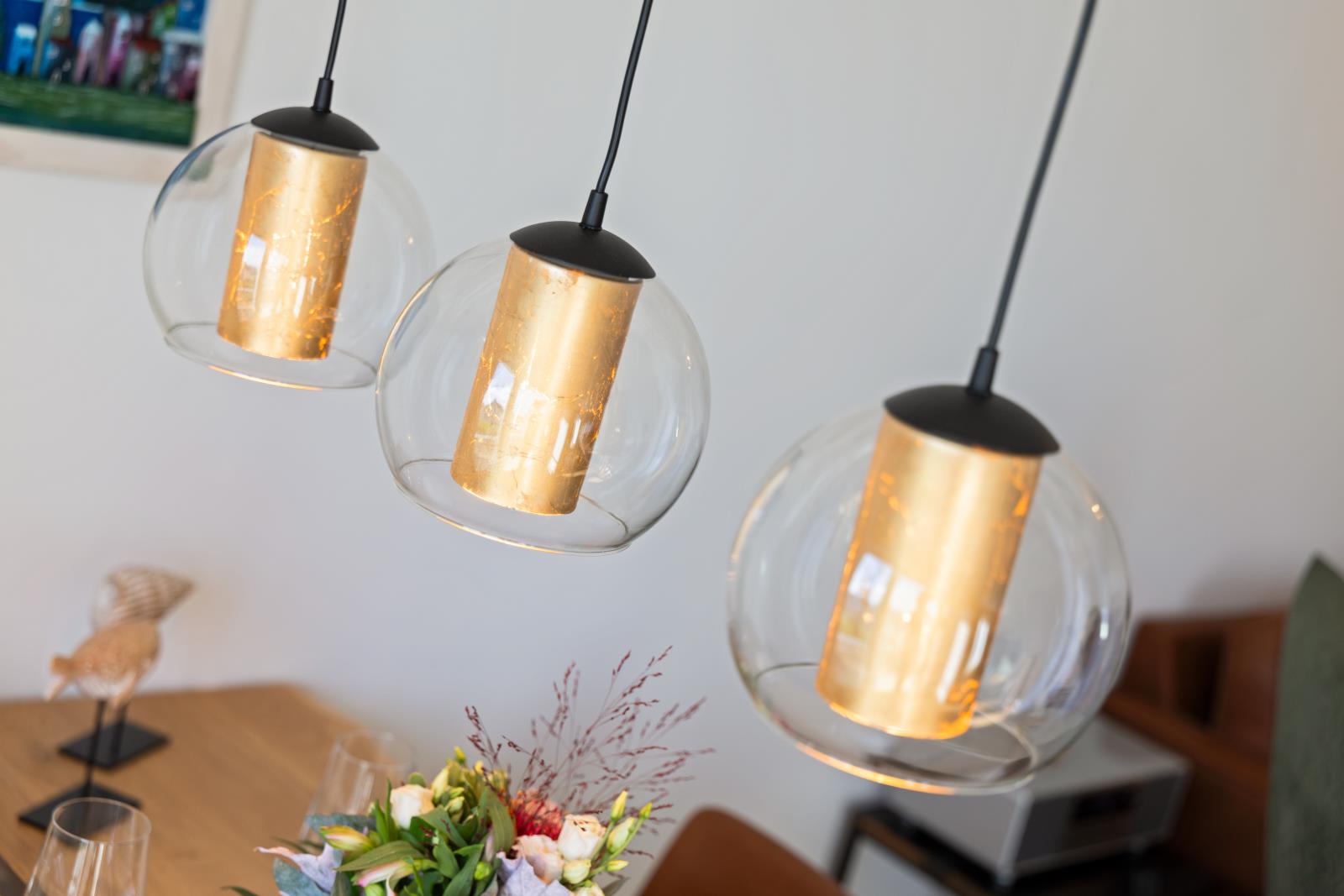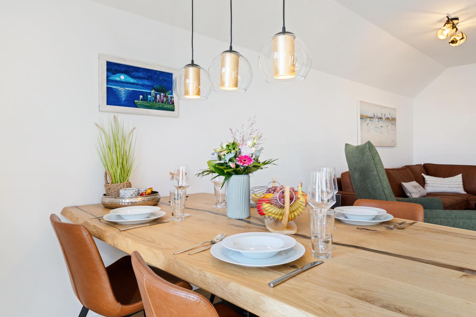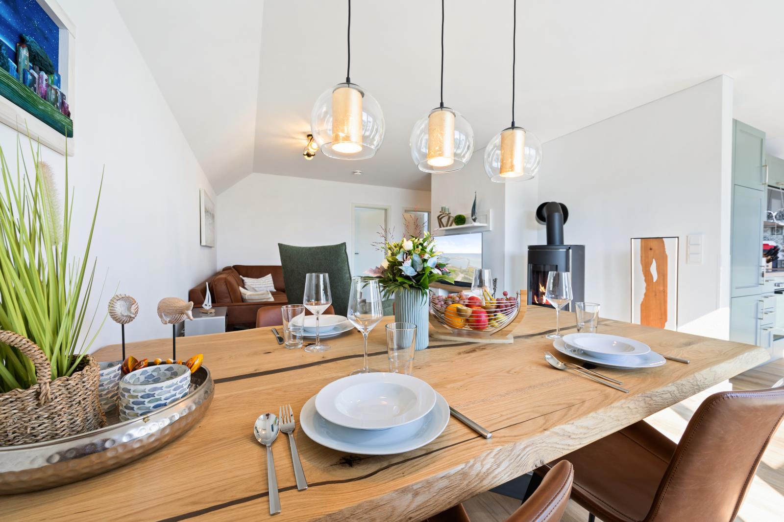 Im offenen Wohn- und Essbereich sorgt ein stilvolles Interieur aus Naturmaterialien und maritimen Akzenten für ein entspanntes Urlaubsambiente. Die komfortable Couch bietet Platz für gesellige Abende, während der angrenzende Essbereich mit Designerstühlen und eleganten Pendelleuchten zu langen Frühstücken oder gemütlichen Abendessen einlädt.