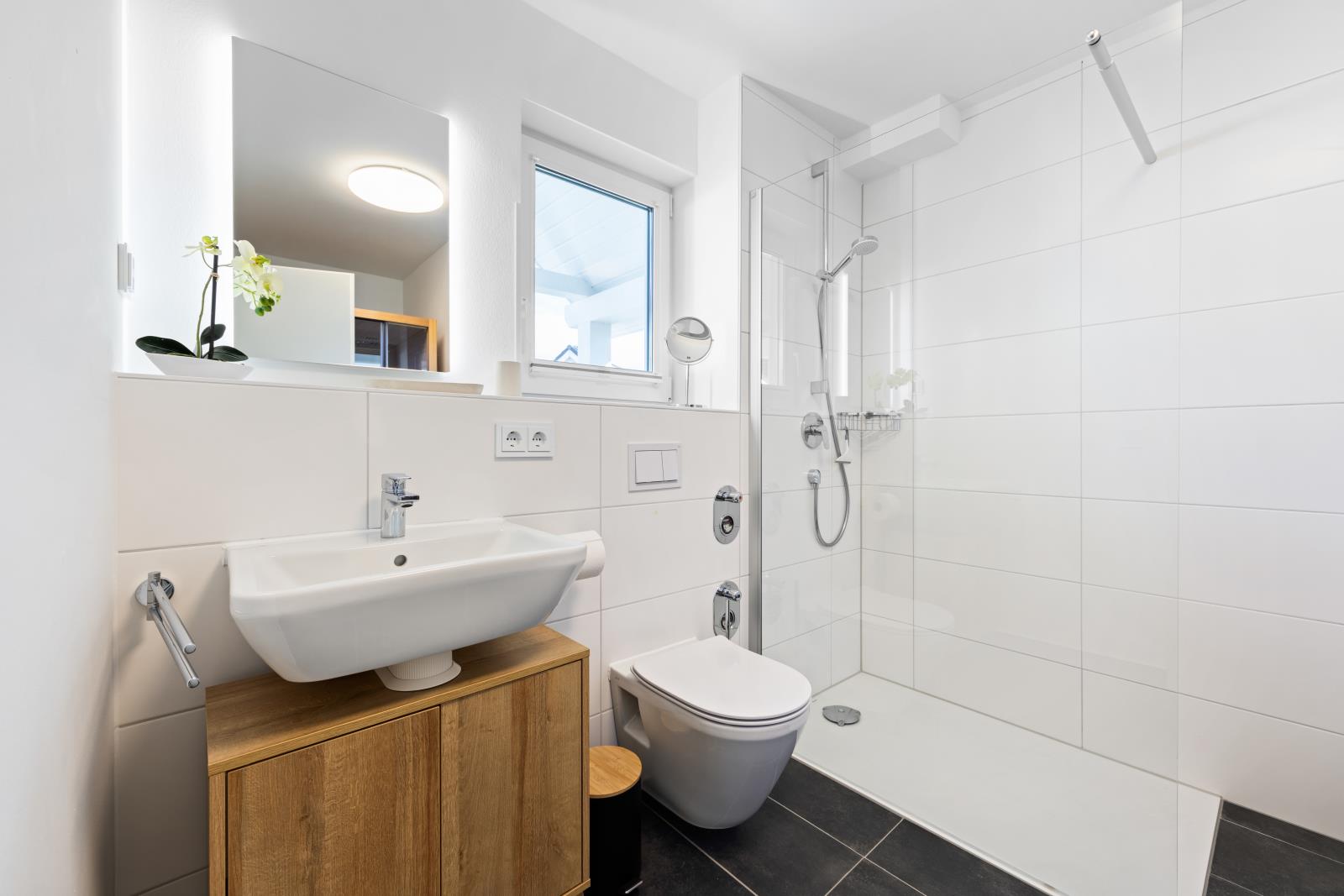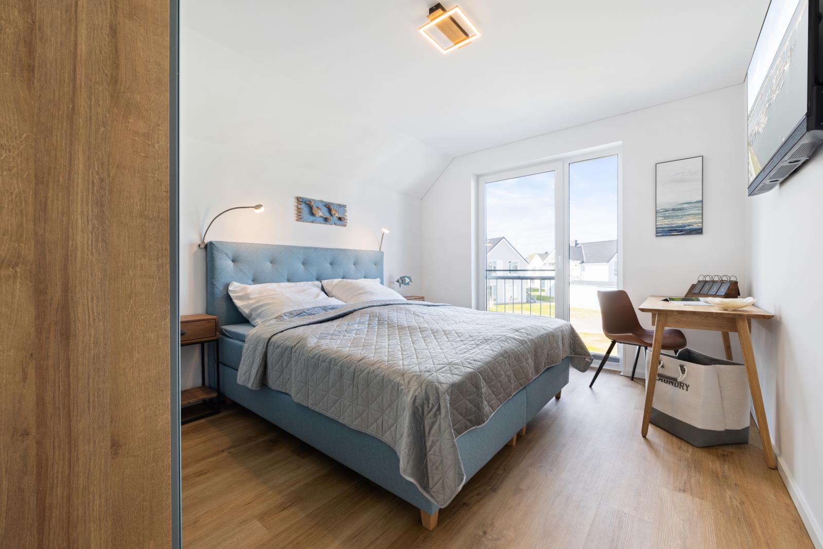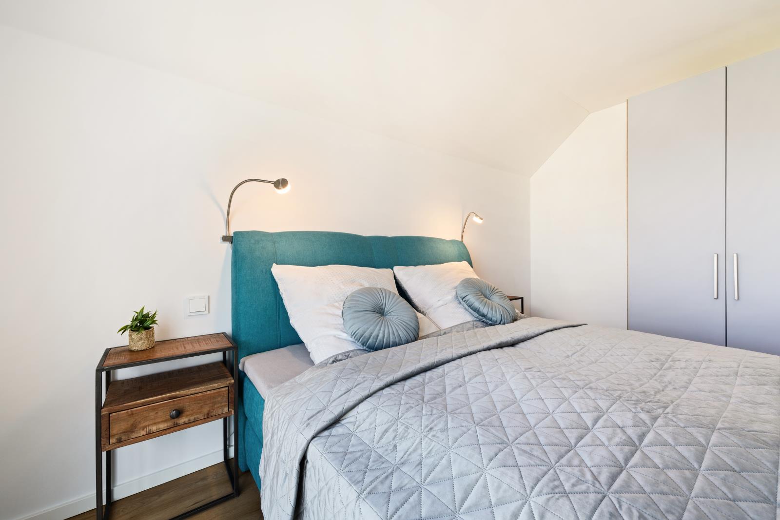 Die beiden Schlafzimmer sind mit hochwertigen Boxspringbetten ausgestattet und bieten dank direktem Zugang zum Balkon oder zur Terrasse ideale Rückzugsorte zum Ausschlafen, Lesen oder Träumen. Dezente Farben, warme Textilien und liebevoll gewählte Details schaffen hier ein behagliches Ambiente, das für Ruhe und Entspannung sorgt.