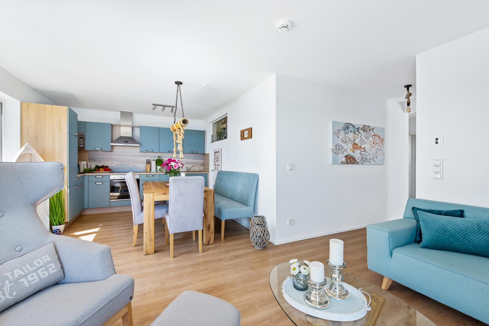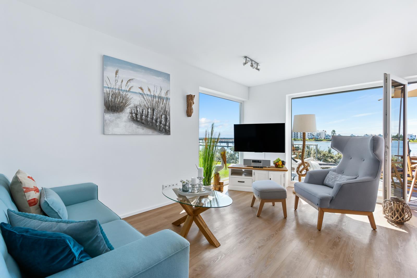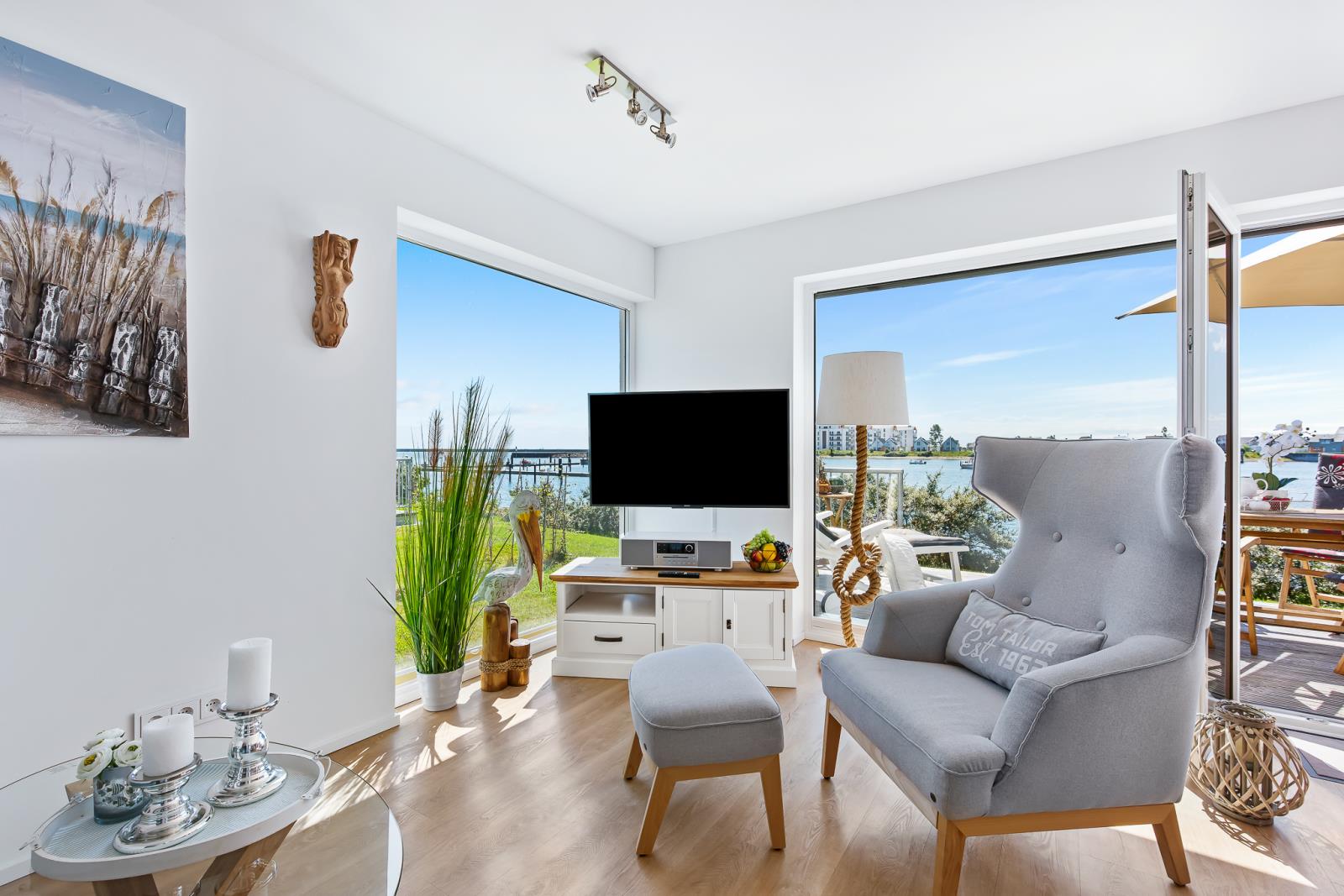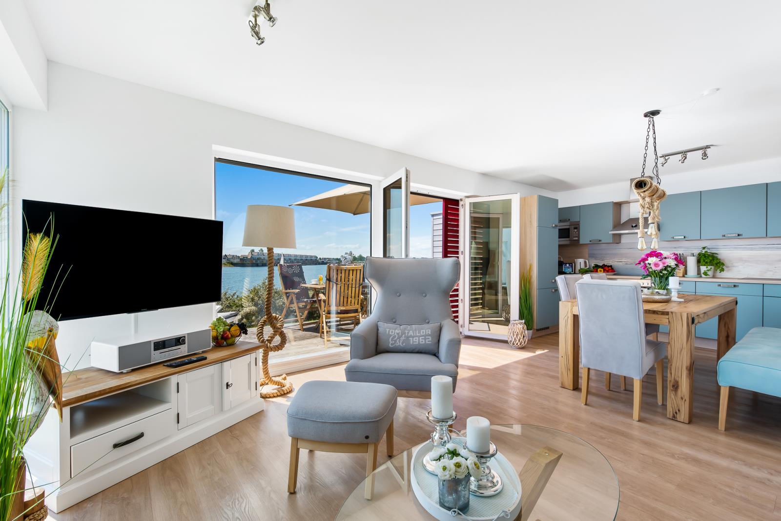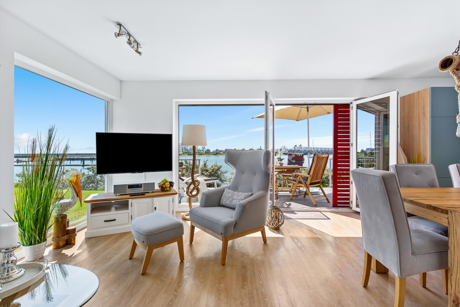 Im Inneren empfängt Sie stilvoller Komfort mit hochwertiger Ausstattung und viel Liebe zum Detail. Eine Infrarot-Sauna mit LED-Farblichttherapie und Soundsystem sowie eine Whirlpool-Badewanne sorgen für wohltuende Wellnessmomente – ideal nach einem langen Spaziergang am Strand oder einem aktiven Tag an der frischen Ostseeluft. Der offene Wohn- und Essbereich überzeugt mit maritimem Flair, einer voll ausgestatteten Küche und großen Panoramafenstern, die den Blick auf die Marina freigeben – perfekt für gesellige Abende oder ein ausgedehntes Frühstück mit Wasserblick.