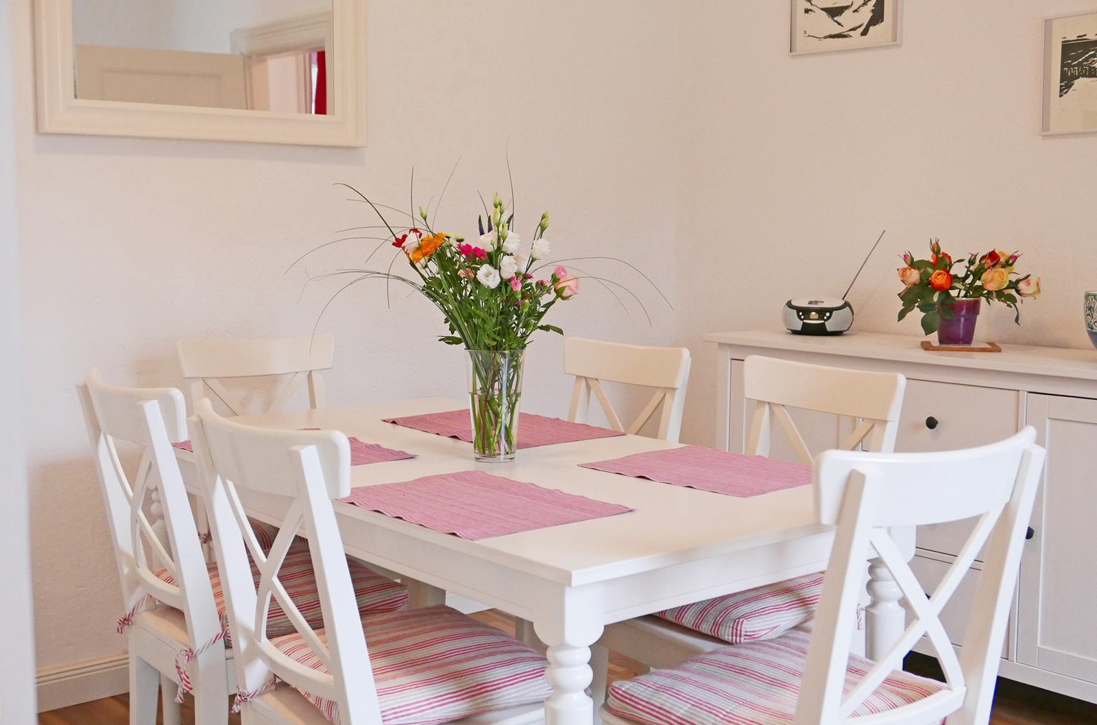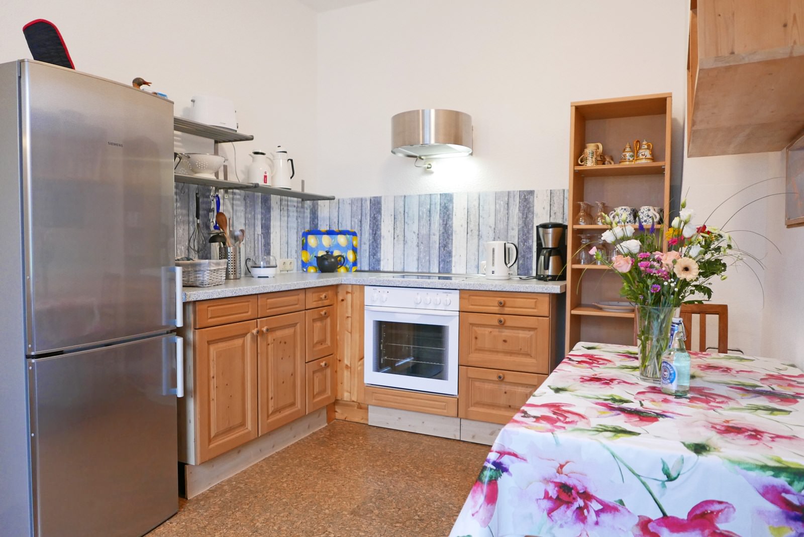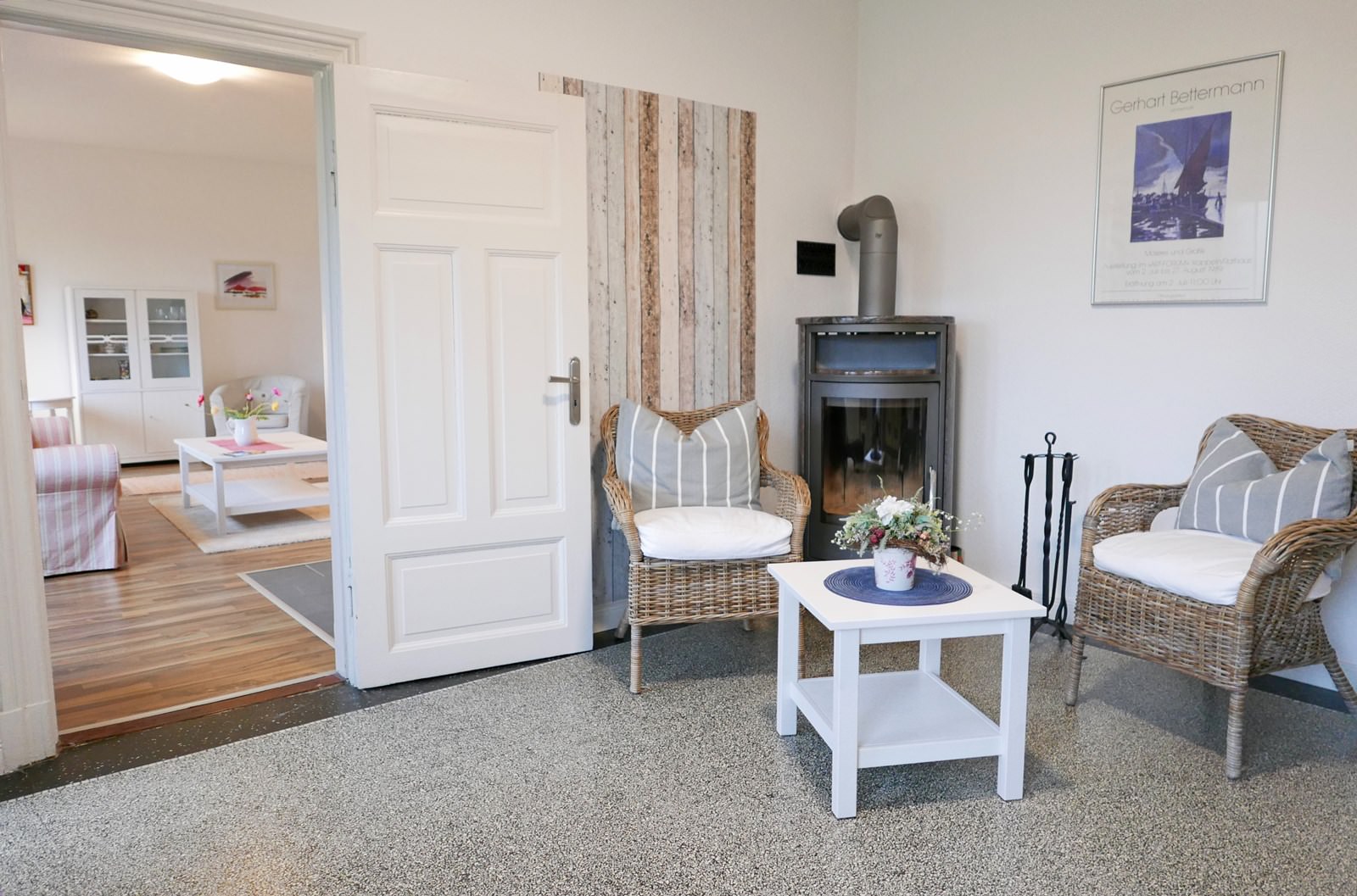 Für bis zu 4 Personen bietet die schöne Landhauswohnung eine komfortable Ausstattung auf ca. 110 m² und einen großen Garten mit schönem Blick ins Grüne. Die hellen Räumlichkeiten und geschmackvolles Mobiliar sorgen für eine angenehme Wohlfühlatmosphäre. Das Wohnzimmer ist großzügig gestaltet, bietet bequeme Sitzgarnituren und eine gemütliche Leseecke mit einer eigenen kleinen Ferienbibliothek - für Unterhaltung sorgen Flachbild-TV, DVD-Player, Musikanlage und kostenfreies WLAN. Ein besonderes optisches Highlight bietet der historische Ofen im Wohnbereich, auch wenn dieser leider nicht befeuert werden darf. Trotzdem müssen Sie bei kälterem Wetter natürlich nicht frieren und können es sich vor dem knisternden, modernen Kaminofen in der Tenne so richtig gemütlich machen. Zusätzlich verfügt die Wohnung natürlich auch über eine Zentralheizung. In der Küche stehen diverse technische Annehmlichkeiten und ein kleiner Essbereich zur Verfügung, direkt anschließend sogar noch ein helles Esszimmer mit großem Tisch. Für die angenehme Nachtruhe wurde das Haus mit zwei Schlafzimmern ausgestattet, eines davon sogar mit hochwertigem Boxspringbett. Da ein Badezimmer mit Badewanne vorhanden ist und eines mit Dusche und Toilette, eignet sich das Haus auch wunderbar für zusammenreisende Paare und Freunde. Die Wohnung ist in gewissem Maße behindertengerecht, da alle Räume, mit Ausnahme des Badezimmers mit der Badewanne, ebenerdig und bequem betretbar sind.