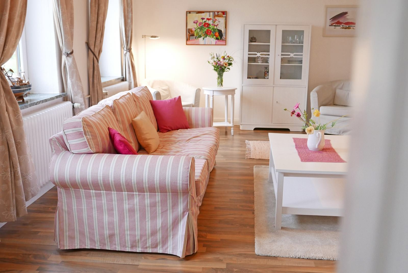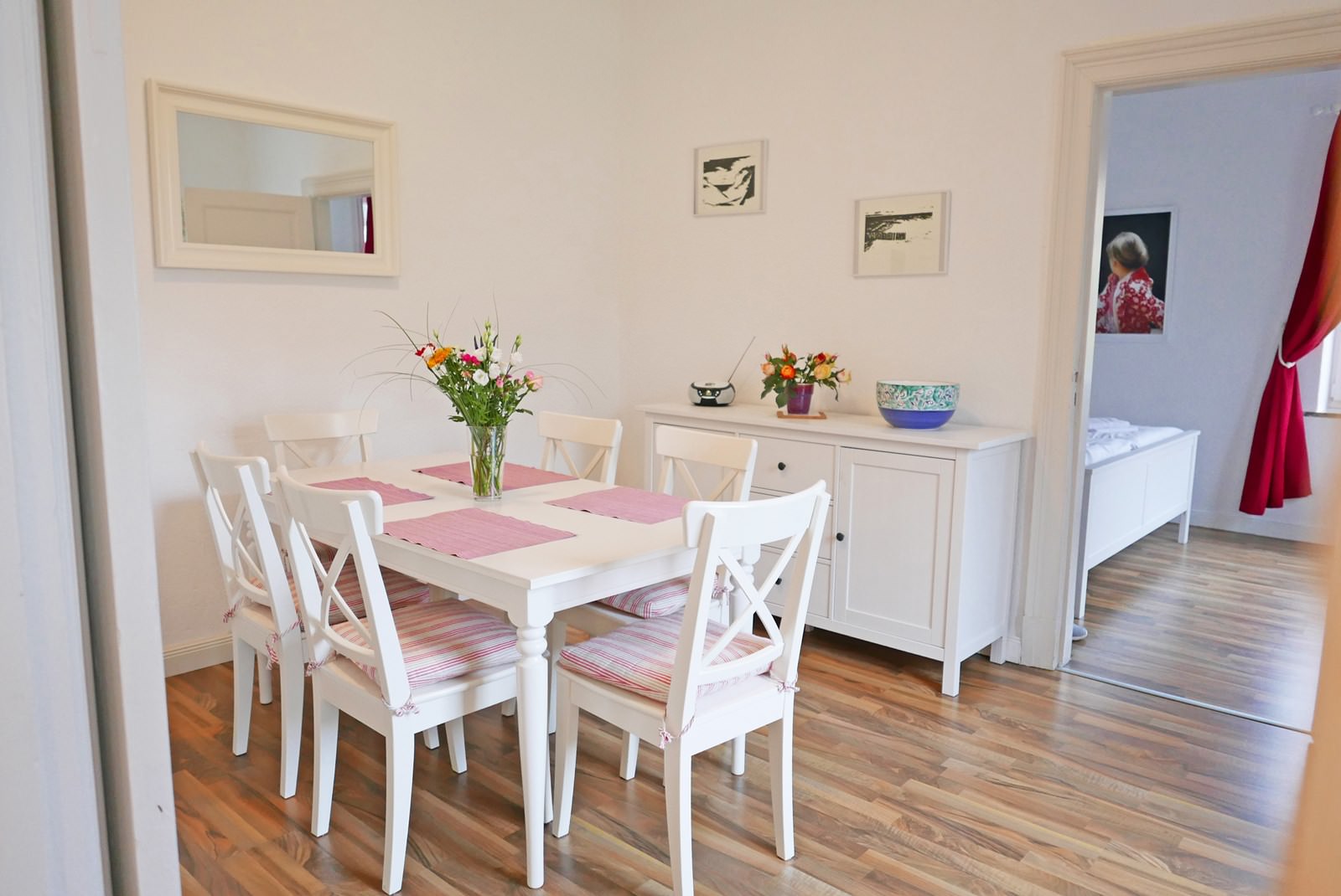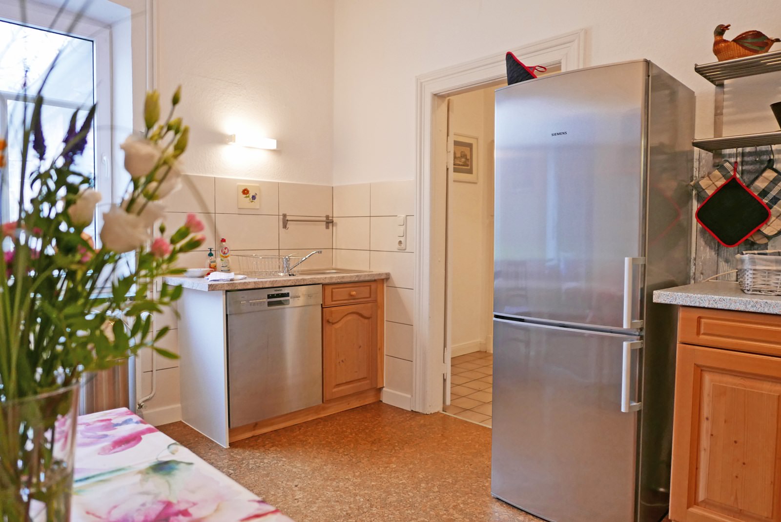 Für bis zu 4 Personen bietet die schöne Landhauswohnung eine komfortable Ausstattung auf ca. 110 m² und einen großen Garten mit schönem Blick ins Grüne. Die hellen Räumlichkeiten und geschmackvolles Mobiliar sorgen für eine angenehme Wohlfühlatmosphäre. Das Wohnzimmer ist großzügig gestaltet, bietet bequeme Sitzgarnituren und eine gemütliche Leseecke mit einer eigenen kleinen Ferienbibliothek - für Unterhaltung sorgen Flachbild-TV, DVD-Player, Musikanlage und kostenfreies WLAN. Ein besonderes optisches Highlight bietet der historische Ofen im Wohnbereich, auch wenn dieser leider nicht befeuert werden darf. Trotzdem müssen Sie bei kälterem Wetter natürlich nicht frieren und können es sich vor dem knisternden, modernen Kaminofen in der Tenne so richtig gemütlich machen. Zusätzlich verfügt die Wohnung natürlich auch über eine Zentralheizung. In der Küche stehen diverse technische Annehmlichkeiten und ein kleiner Essbereich zur Verfügung, direkt anschließend sogar noch ein helles Esszimmer mit großem Tisch. Für die angenehme Nachtruhe wurde das Haus mit zwei Schlafzimmern ausgestattet, eines davon sogar mit hochwertigem Boxspringbett. Da ein Badezimmer mit Badewanne vorhanden ist und eines mit Dusche und Toilette, eignet sich das Haus auch wunderbar für zusammenreisende Paare und Freunde. Die Wohnung ist in gewissem Maße behindertengerecht, da alle Räume, mit Ausnahme des Badezimmers mit der Badewanne, ebenerdig und bequem betretbar sind.