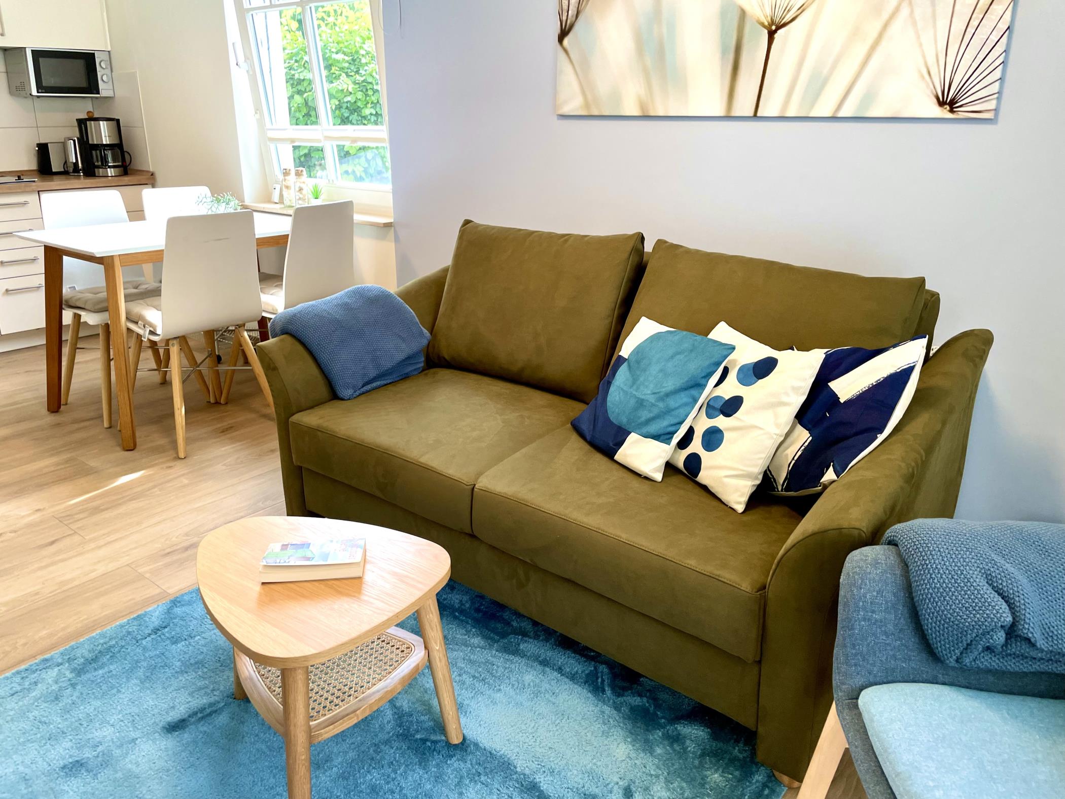 Der Wohnraum verfügt über eine gemütliche Ess- und Sitzecke, deren Couch zum Bett ausgezogen werden kann. Die Küche wurde in 2017 komplett neu eingebaut und verfügt neben einem kleinen Cerankochfeld über eine Mikrowelle, einen Kühlschrank und einen Geschirrspüler.