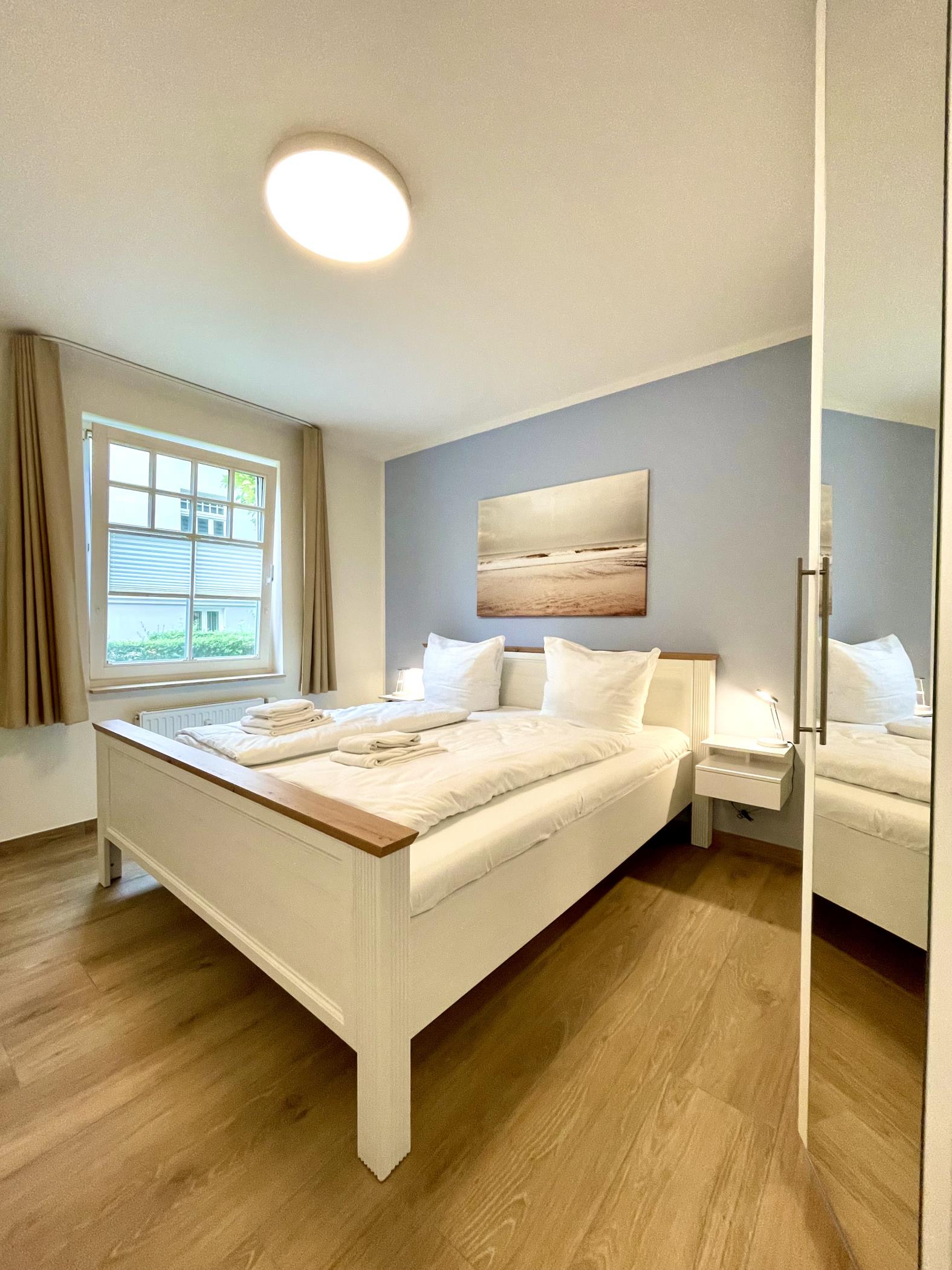 Im Schlafzimmer stehen dem Gast ein schönes Doppelbett mit hochwertigen Matratzen sowie ein geräumiger Kleiderschrank zur Verfügung.