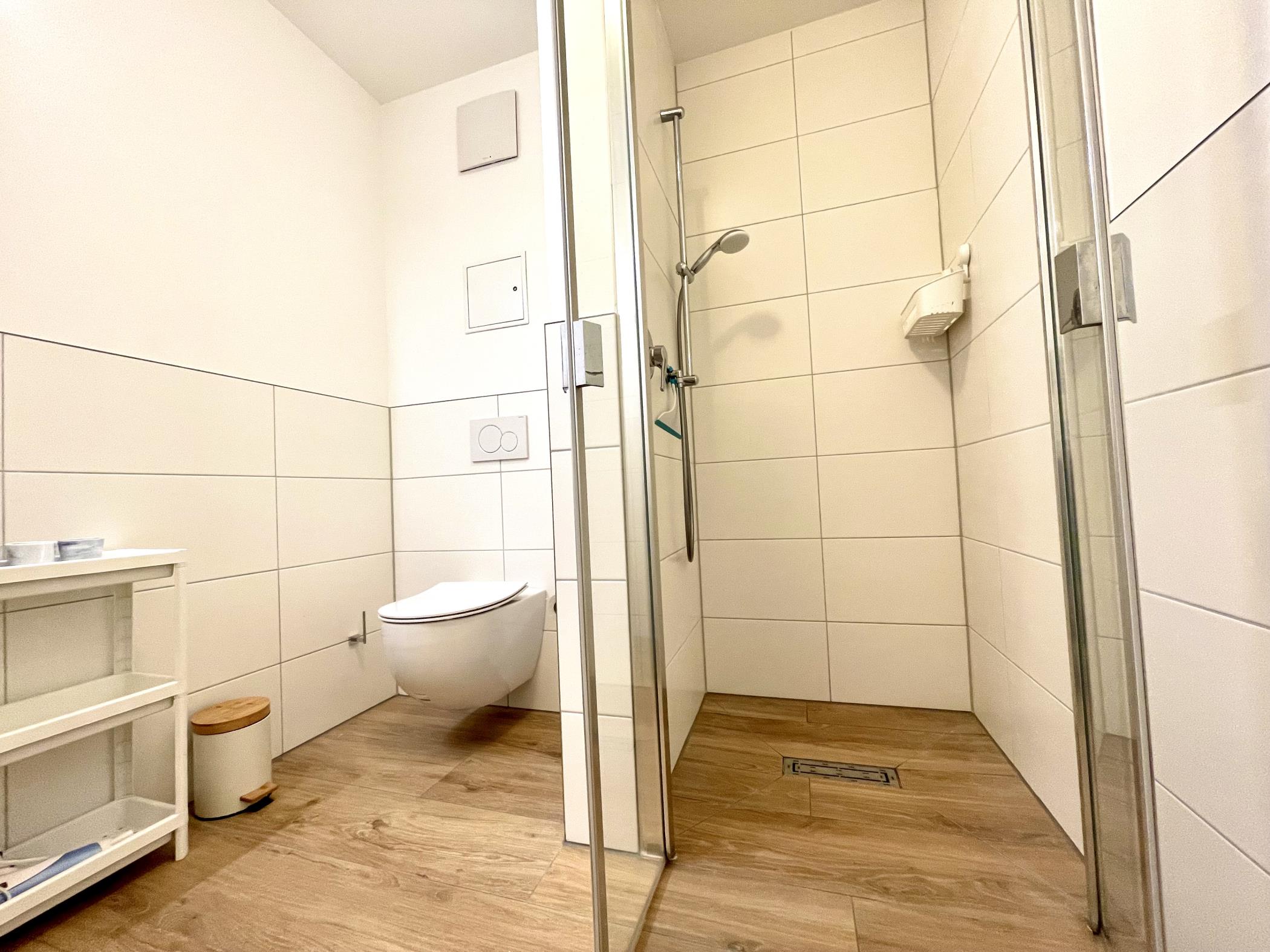 Das Badezimmer mit seinem schönen Waschtisch, dem großem Spiegel und der Dusche runden das Angebot dieser attraktiven Ferienwohnung ab.