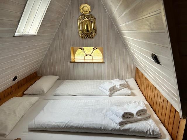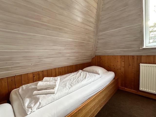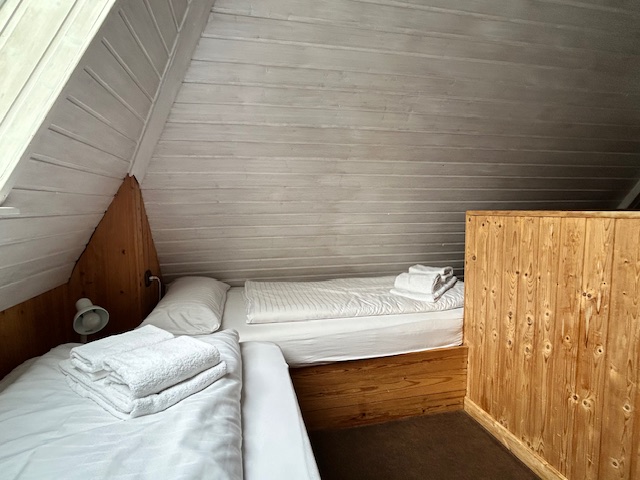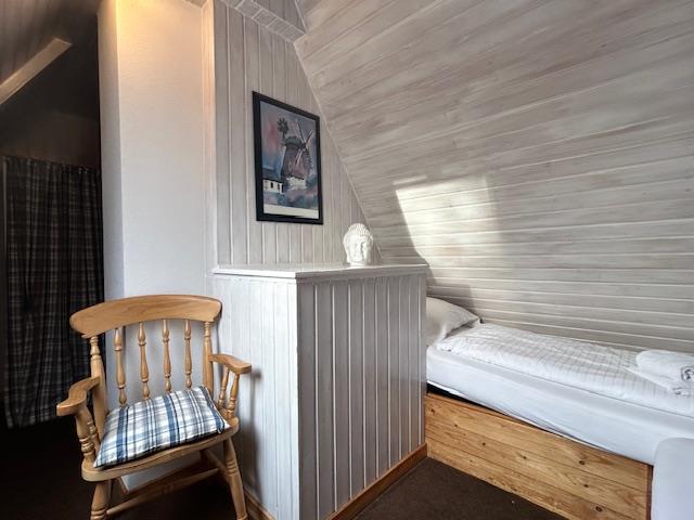 Bad mit Duche (Einstieg 24 cm) und WC Beide Schlafzimmer sind über eine steile Raumspartreppe erreichbar. Schlafzimmer 1: Doppelbett - nur ein seitlicher Einstieg, unter Dachschrägen Schlafzimmer 2: zwei Einzelbetten