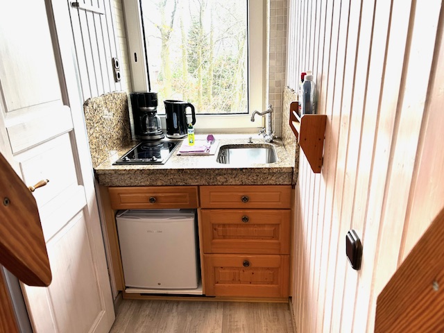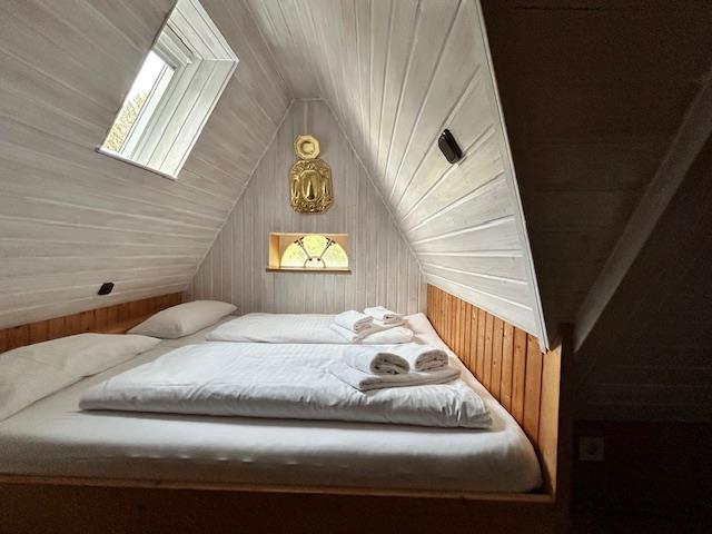 Eine Maisonettwohnung für bis zu 4 Personen im Obergeschoß des Hauses. Klein und fein zum Wohlfühlen. Die weißen Holzvertäfelungen strahlen Helligkeit und Frische aus. Die Einrichtung besteht aus schönen Eichenmöbeln im Bauernstil.