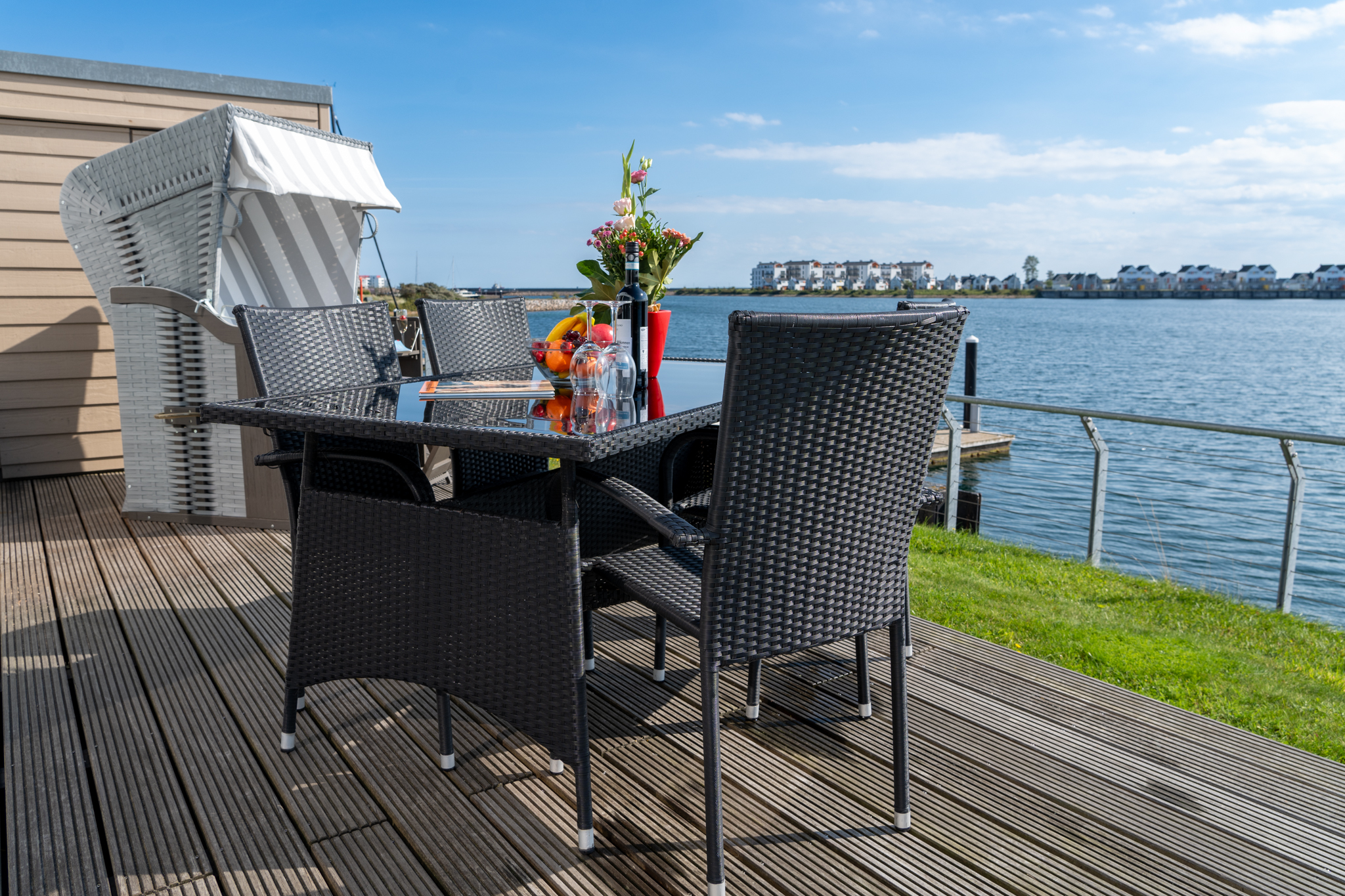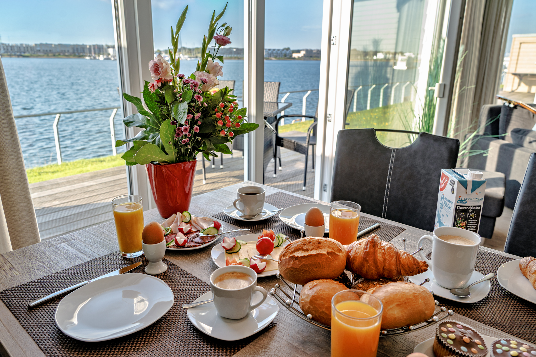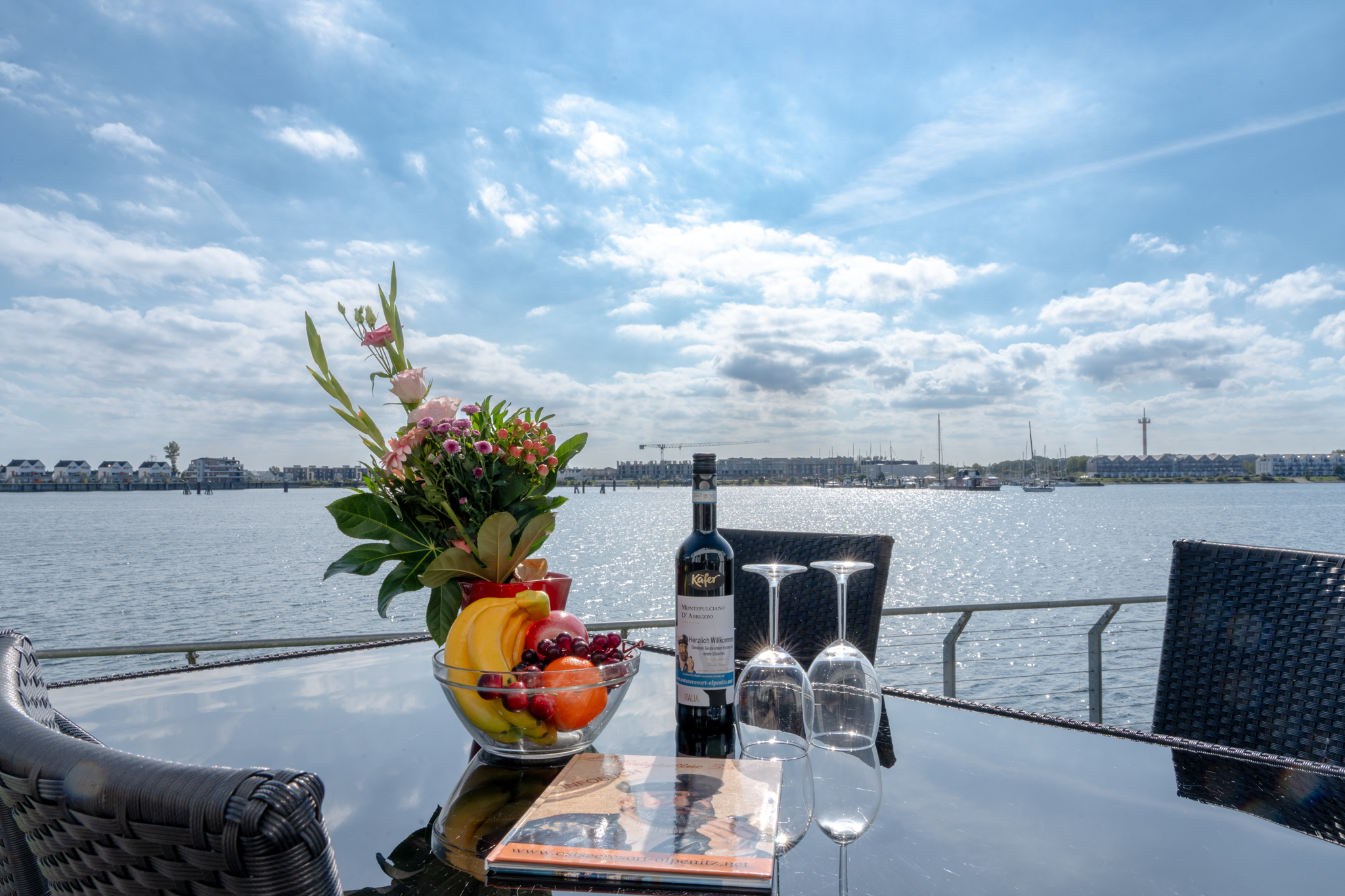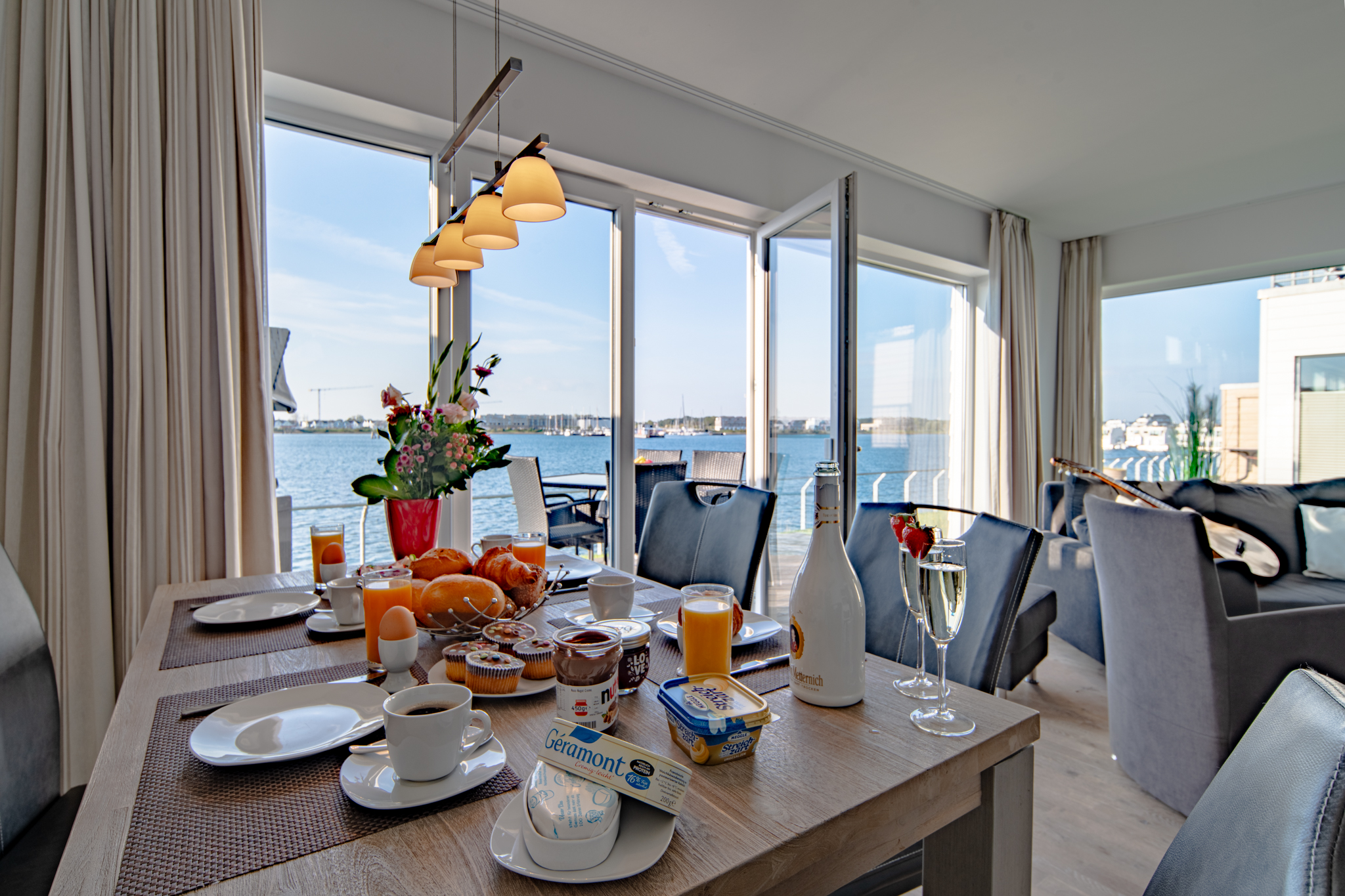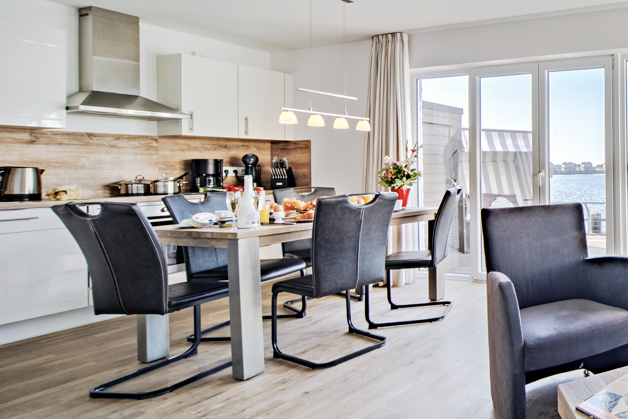 Der großzügige Wohn- und Essbereich mit Blick auf den Hafen lädt zum Verweilen ein. Erleben Sie maritime Momente und beobachten Sie die vorbeifahrenden Segelschiffe.