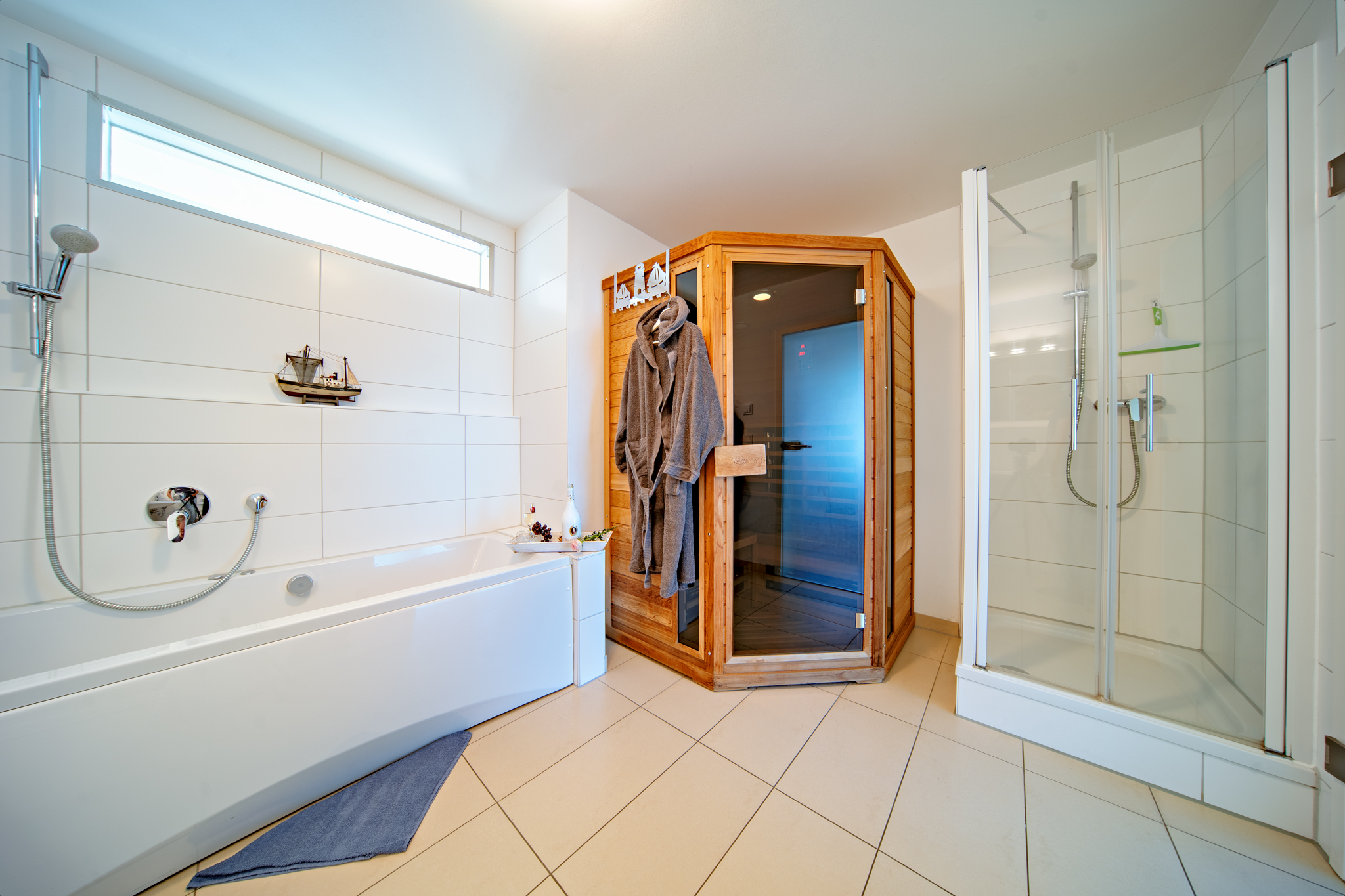 Die Ausstattung umfasst eine Infrarotsauna, eine Badewanne mit Whirlpoolfunktionen und eine Dusche für pure Erholung. Waschmaschine, Spülmaschine, Bügeleisen, Bügelbrett und TV im Wohnzimmer sorgen für Ihren Komfort.