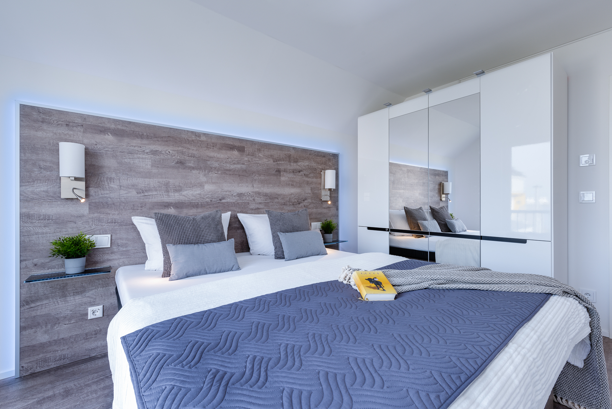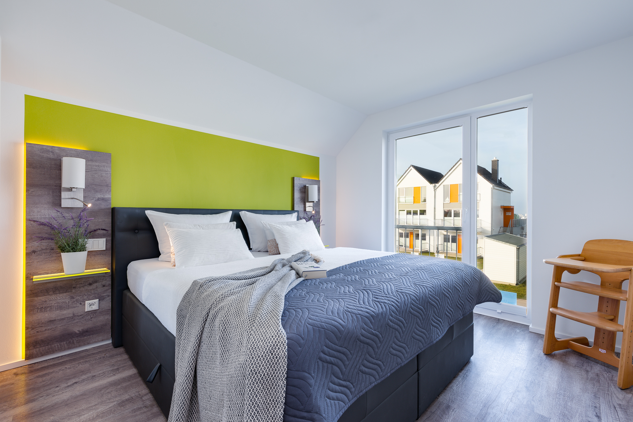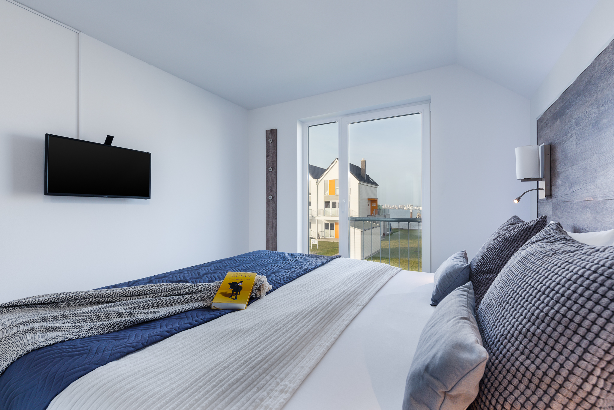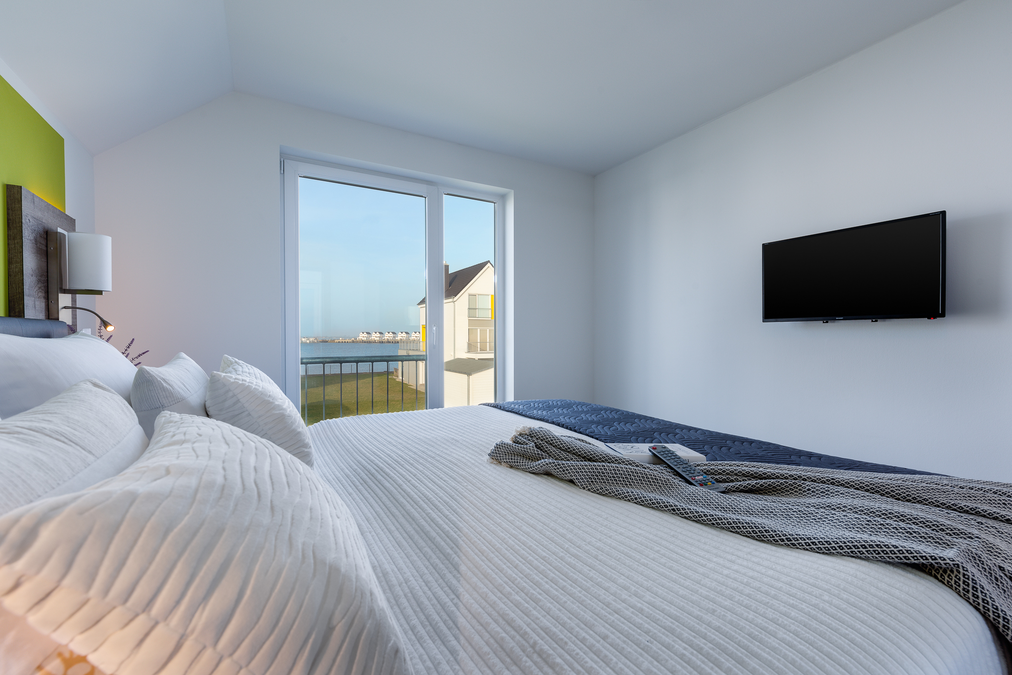 Die Schlafzimmer sind mit einem sehr komfortablen Boxspring-Bett und einem teilberuhigten Wasserbett ausgestattet und lassen einen Blick auf das Hafenbecken und den abendlichen Sonnenuntergängen vom Bett aus zu. Alle drei Zimmer (SZ/WZ) sind mit LED-Flachbildschirmen ausgestattet.