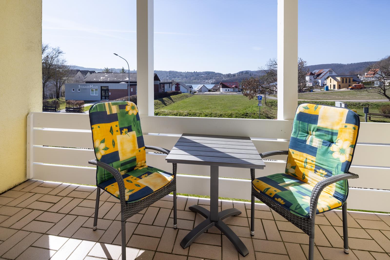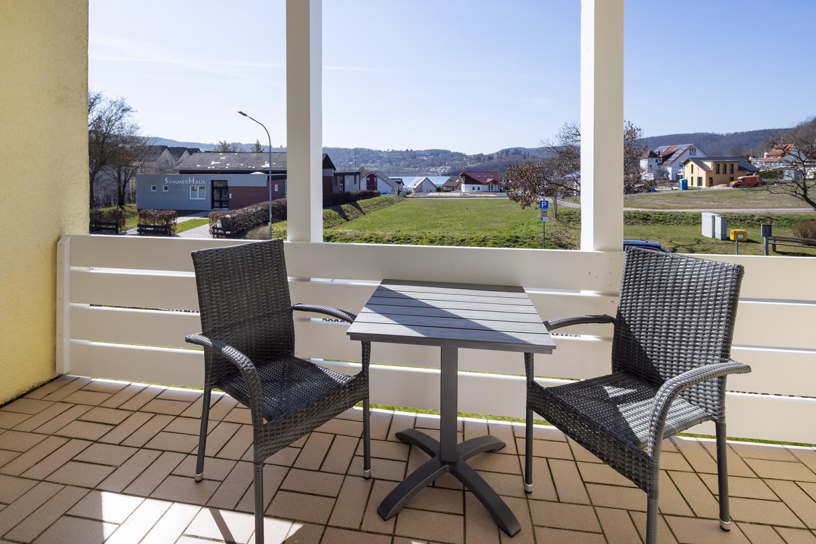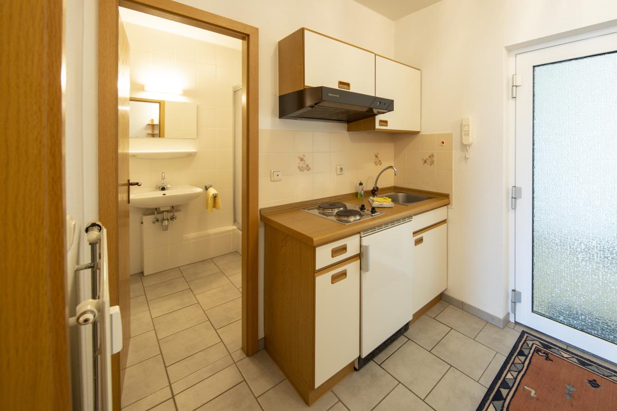 Die Ferienwohnung "Kleiner Seeblick" liegt in der Seeresidenz auf der Halbinsel Scheid am Edersee. Sie verfügt über ein großen Wohn-Schlafraum mit Doppelbett, Couch, Esstisch und einen überdachten Balkon. Es gibt ein kleines Bad mit Dusche und WC, sowie eine kleine Pantryküche im Flur integriert mit einem 2 Platten Kochfeld und Mikrowelle, Kaffemaschine und Wasserkocher. Bei einem vollen See können Sie vom überdachten Balkon und Wohnzimmer über die Dächer der Häuser davor den See sehen.