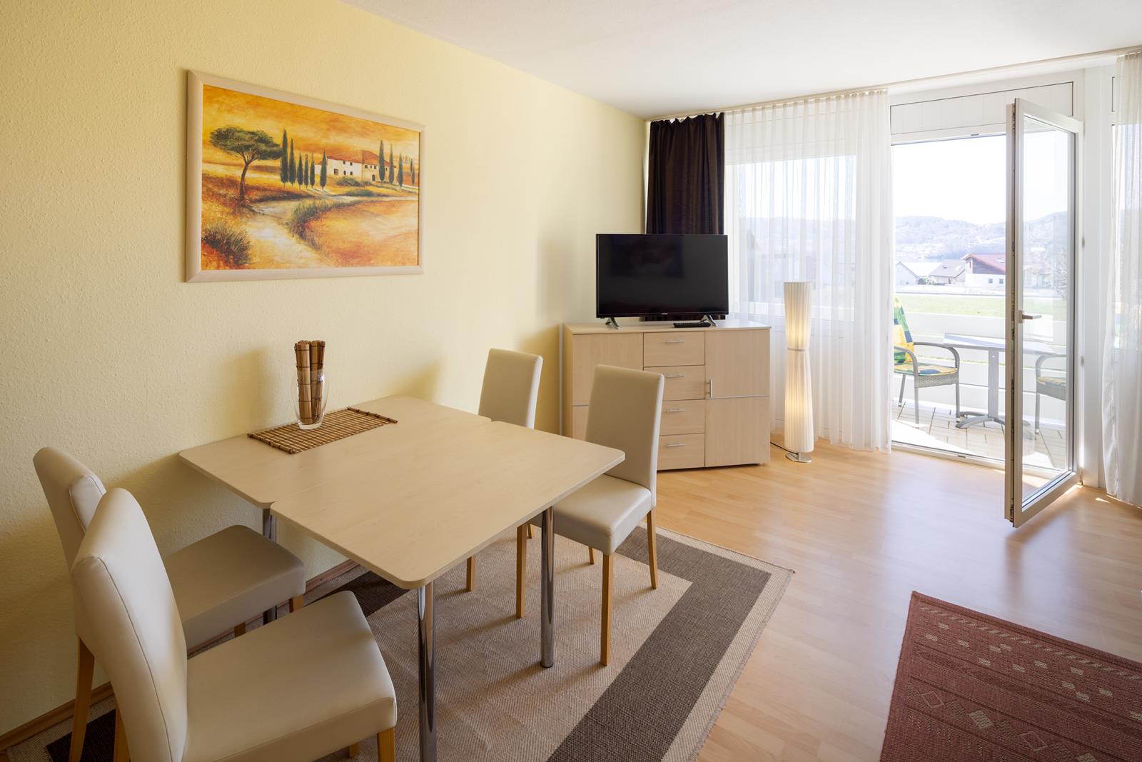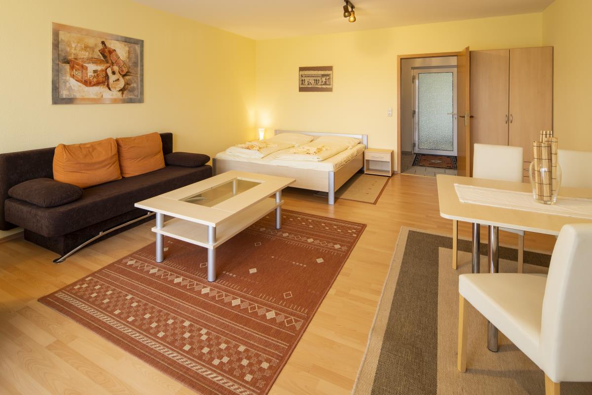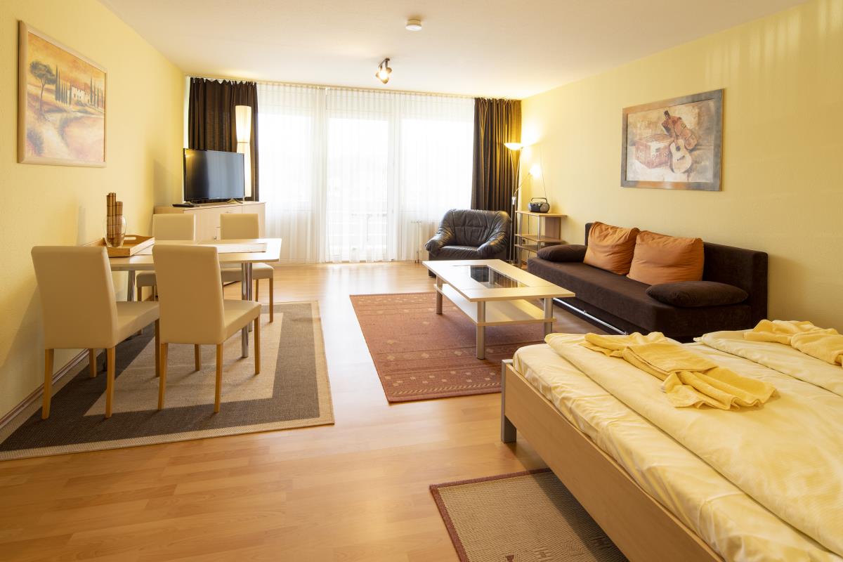 Die Ferienwohnung "Kleiner Seeblick" liegt in der Seeresidenz auf der Halbinsel Scheid am Edersee. Sie verfügt über ein großen Wohn-Schlafraum mit Doppelbett, Couch, Esstisch und einen überdachten Balkon. Es gibt ein kleines Bad mit Dusche und WC, sowie eine kleine Pantryküche im Flur integriert mit einem 2 Platten Kochfeld und Mikrowelle, Kaffemaschine und Wasserkocher. Bei einem vollen See können Sie vom überdachten Balkon und Wohnzimmer über die Dächer der Häuser davor den See sehen.
