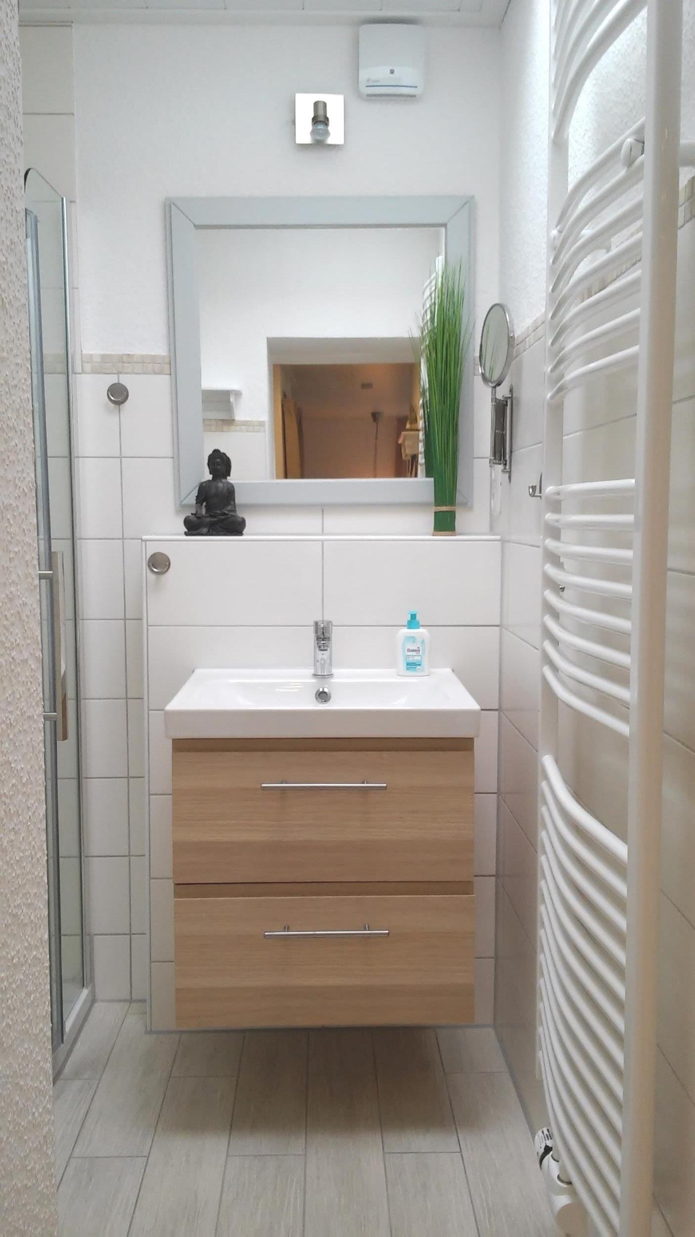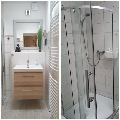Ein modernes Badezimmer mit Dusche, kostenfreies WLAN (Glasfaser), TV, eine Waschmaschine und ein eigener Parkplatz auf dem Grundstück sorgen für zusätzlichen Komfort.