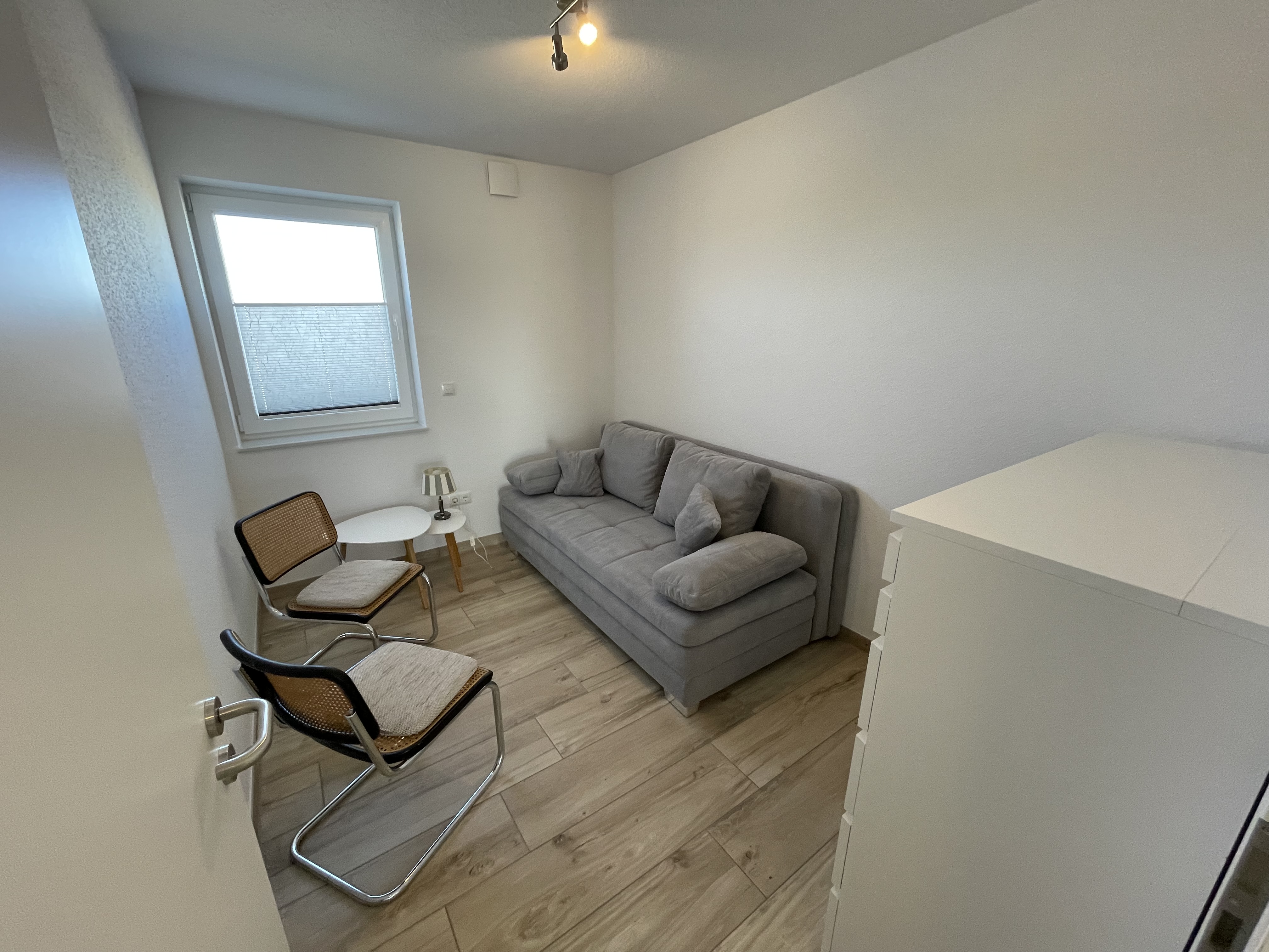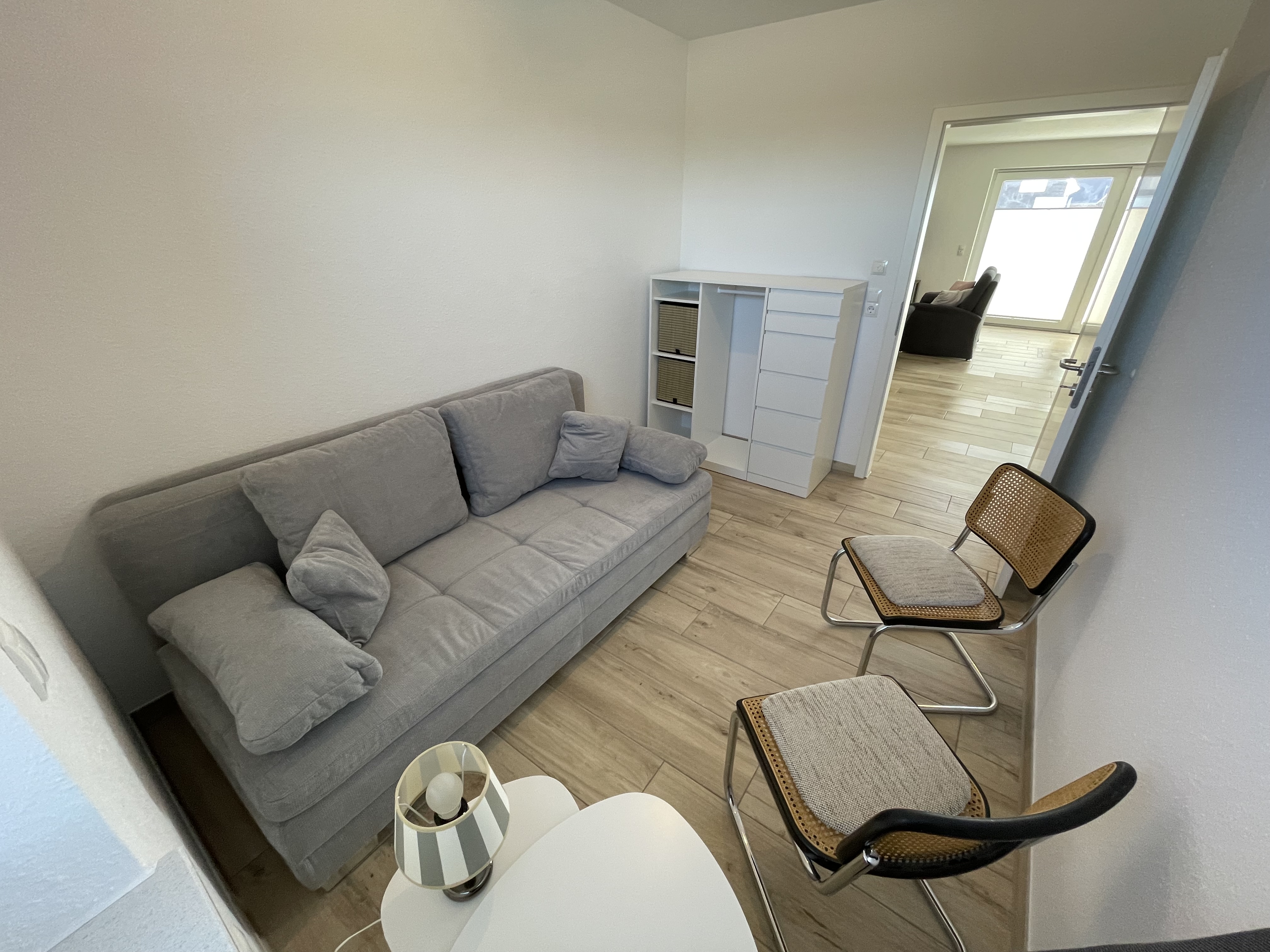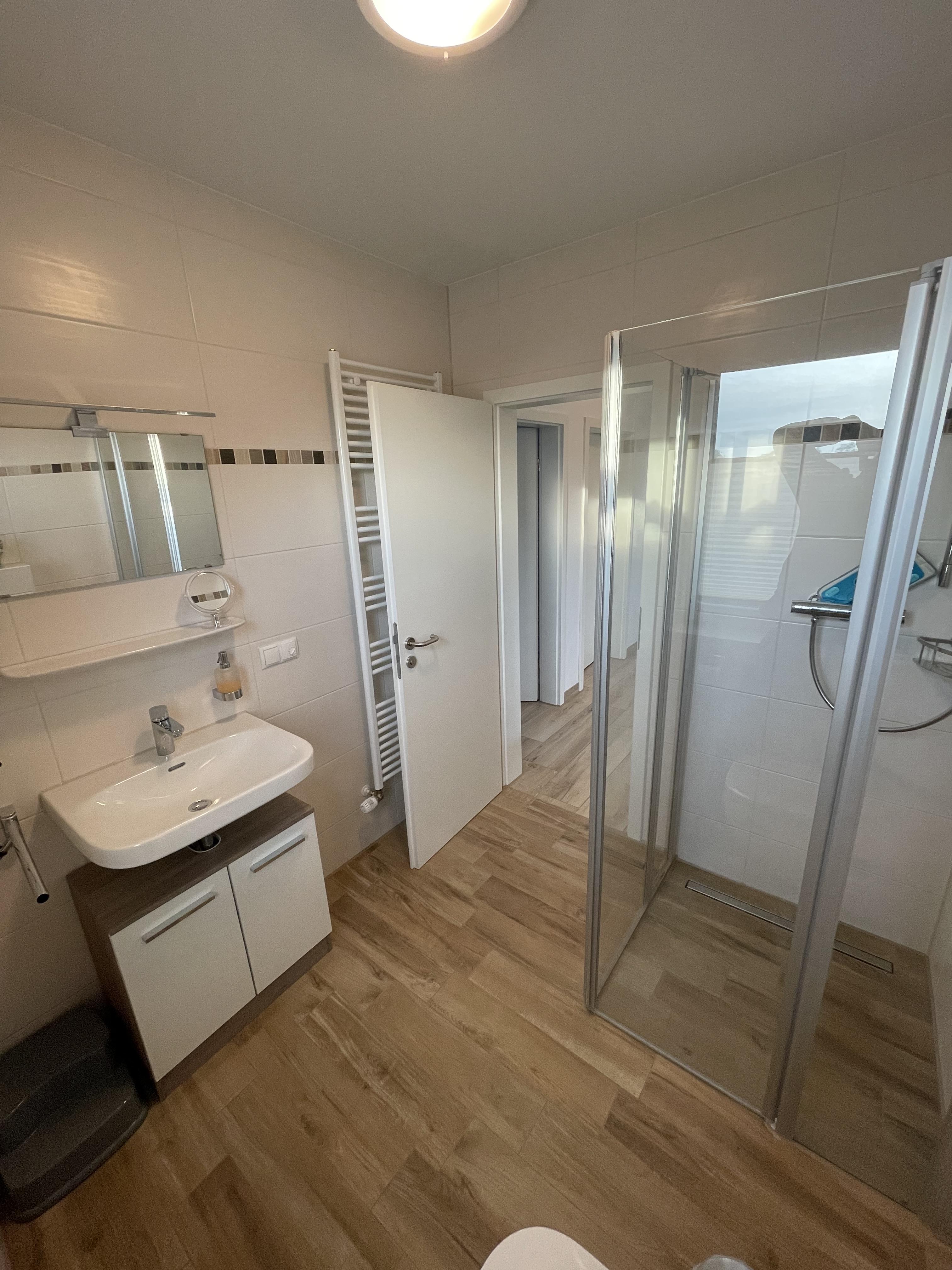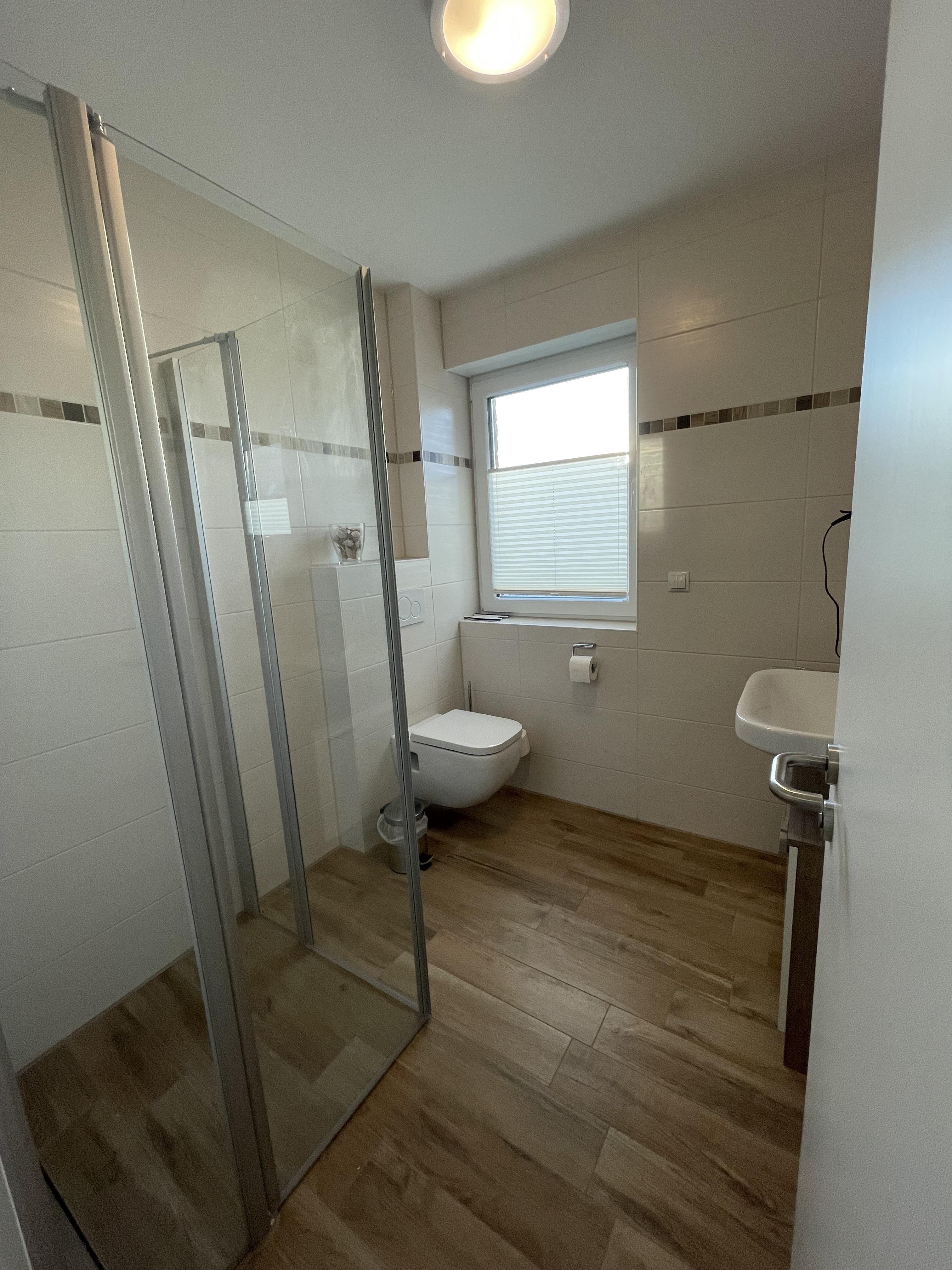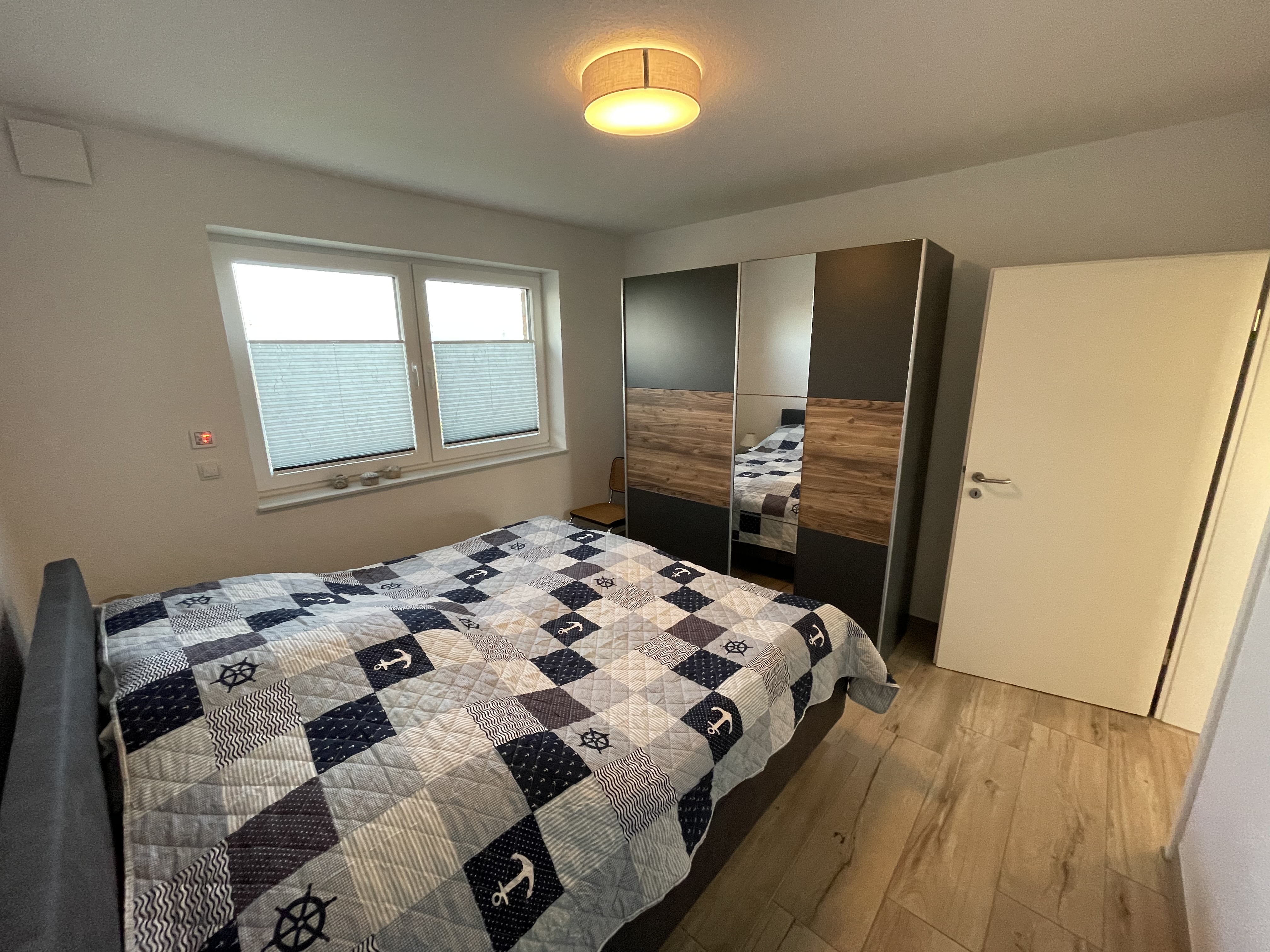 Die Wohnung verfügt über ein Schlafzimmer mit komfortablem Doppelbett sowie ein weiteres Zimmer mit Schlafsofa – perfekt für Paare, kleine Familien oder Freunde. Das moderne Badezimmer überzeugt mit einer ebenerdigen Dusche und sorgt für zusätzlichen Komfort.