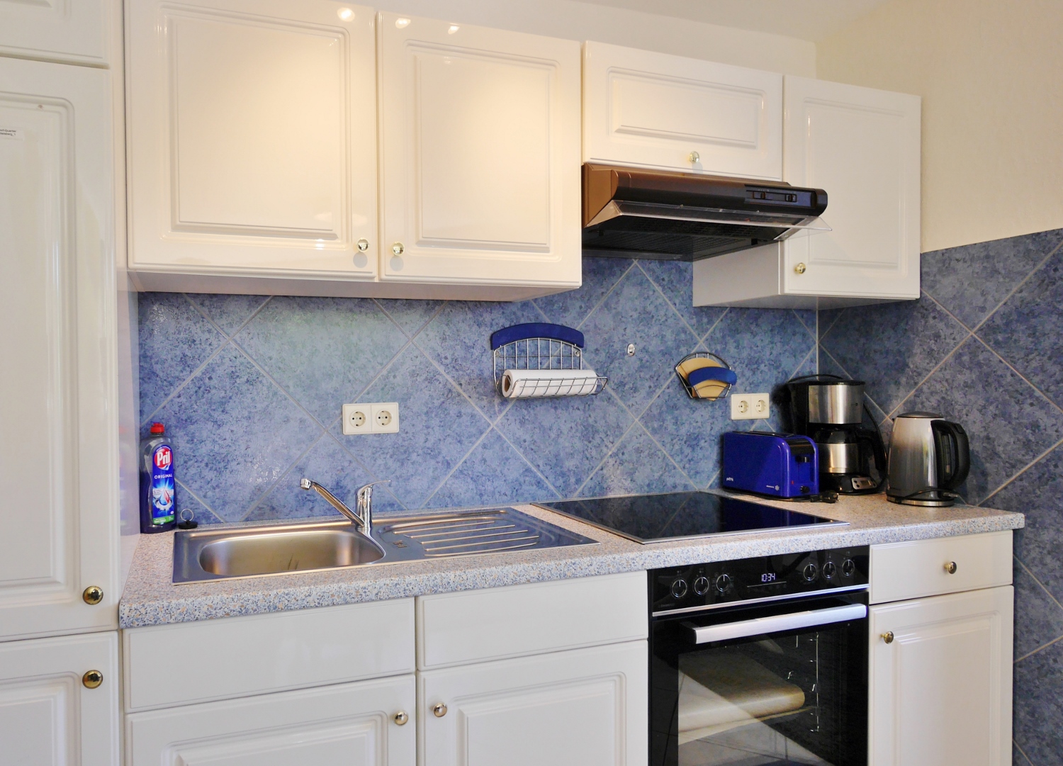 - offene Küche mit Ceran 4-Plattenherd, Backofen, Geschirrspüler und zweckmäßiger Ausstattun