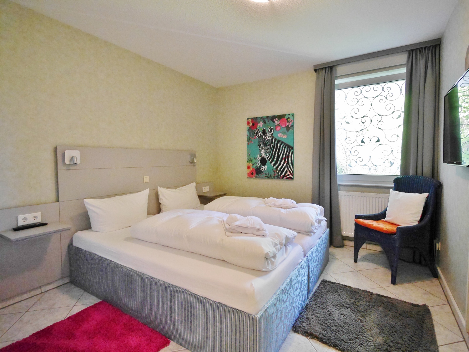 - ein Schlafzimmer mit Doppelbett, TV und großem Kleiderschrank