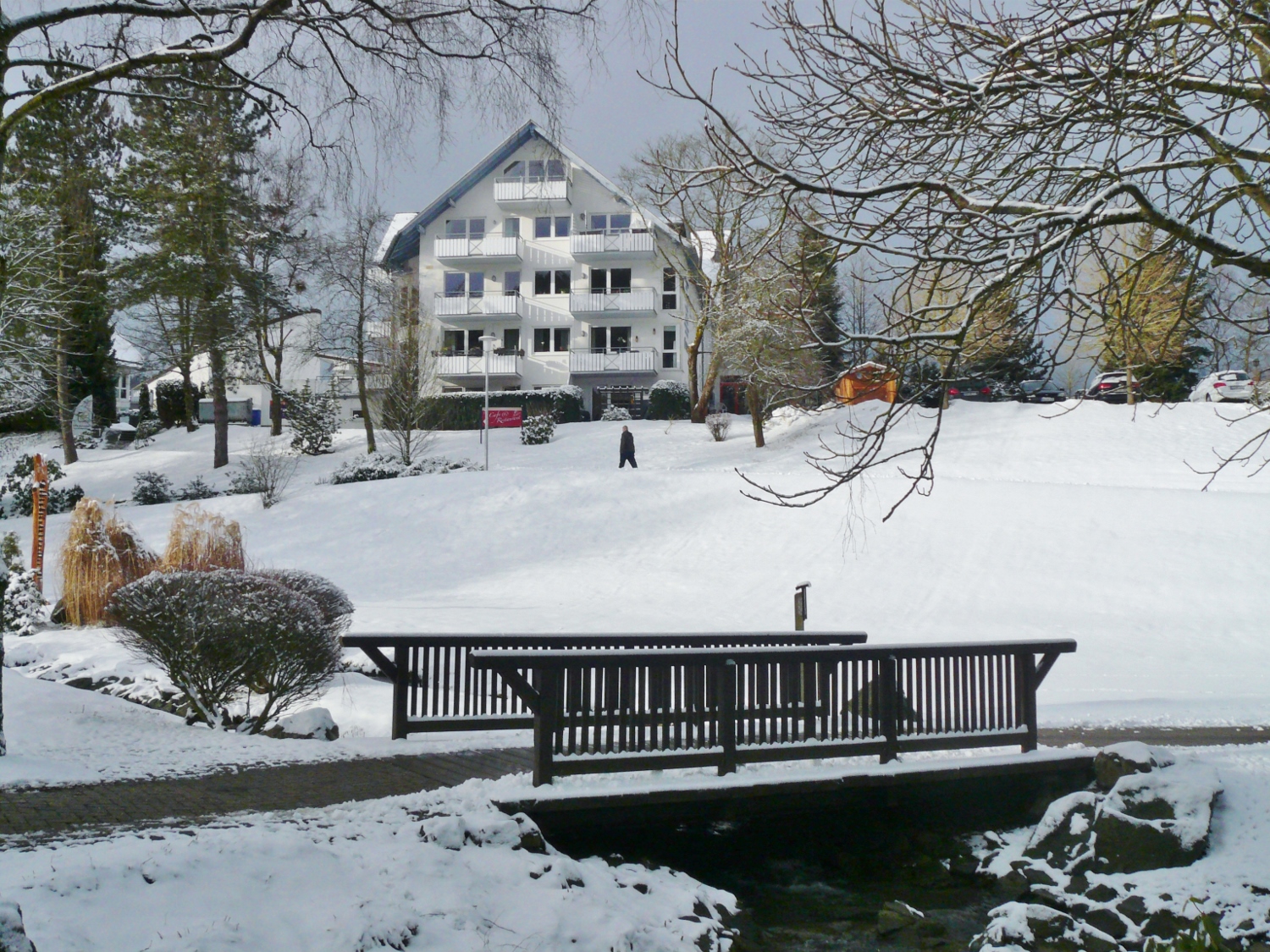 2-Raum-Fewo (53qm) für 2-3 Personen mit WLAN, barrierefrei im Erdgeschoss, mit einem Schlafzimmer (Schlafsessel im Wohnraum) und toller Aussicht in den Kurpark. Ruhig und superzentral gelegen; nur 2-5 Gehminuten zu den meisten wichtigen Einrichtungen, u.a. Zentrum, Bahnhof, Seilbahn & Skigebiet, Lagunenbad, Eishalle,