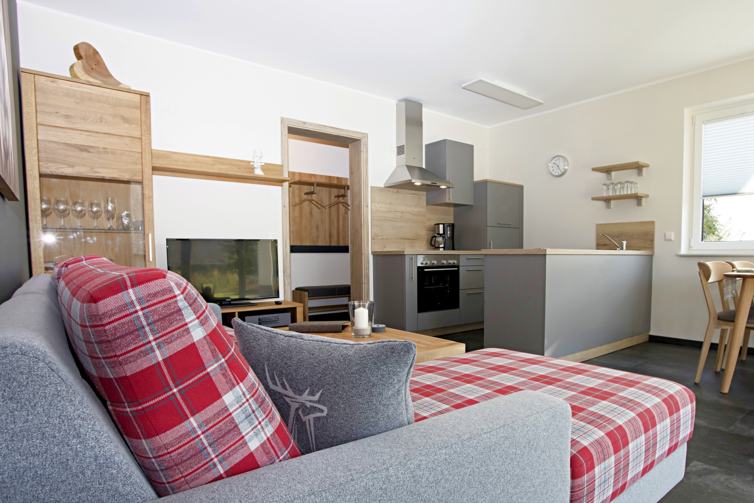 - Wohnzimmer mit TV, BlueRay, Soundanlage und Essbereich