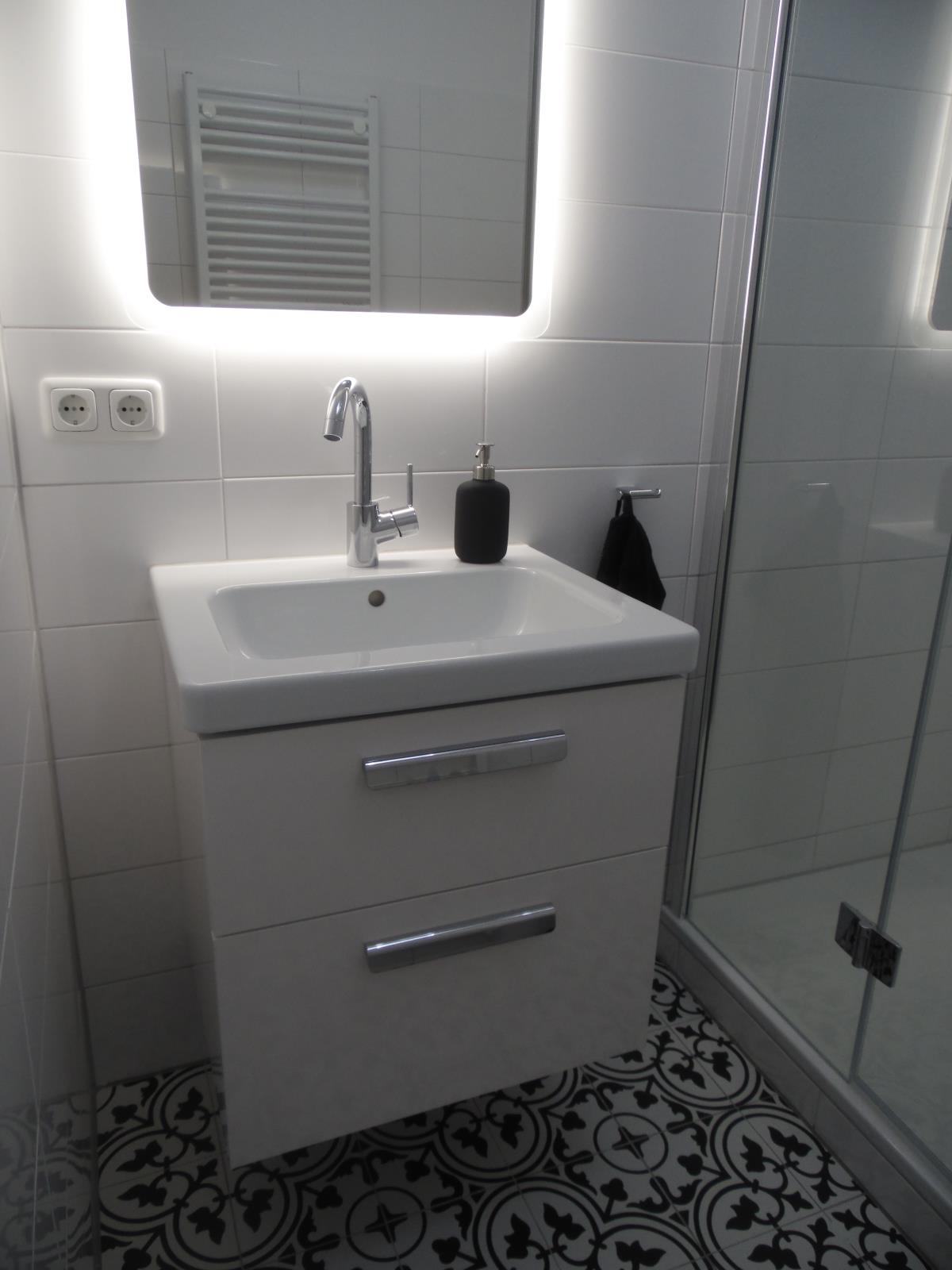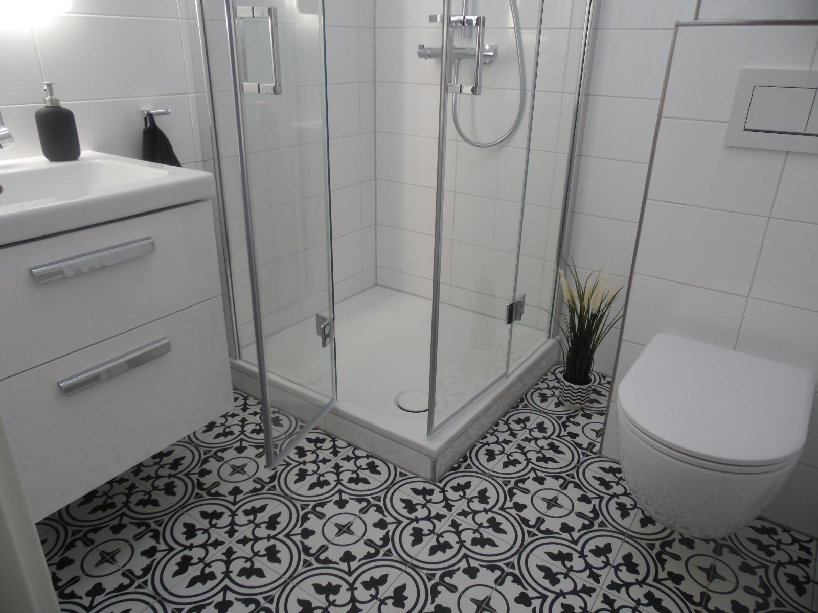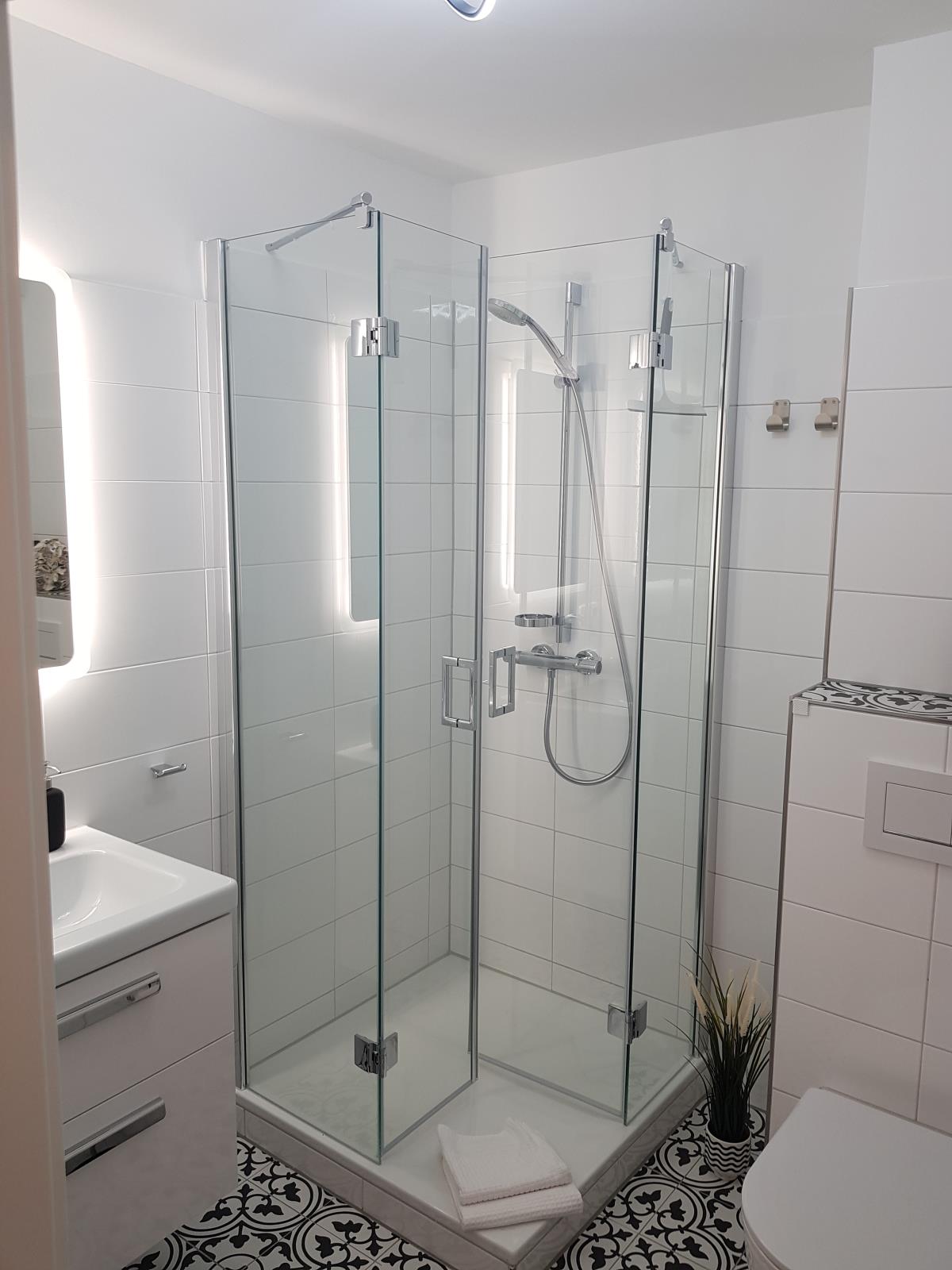Bad Dusche mit niedrigem Einstieg (11 cm), WC, Föhn, Handtuchhalter, Bad ohne Fenster