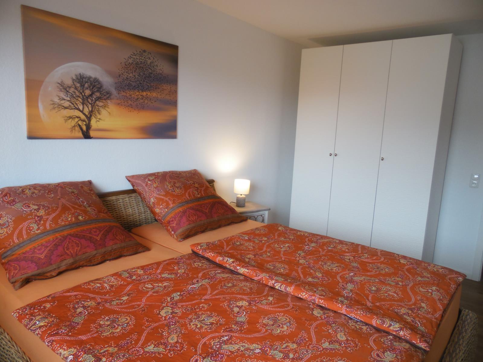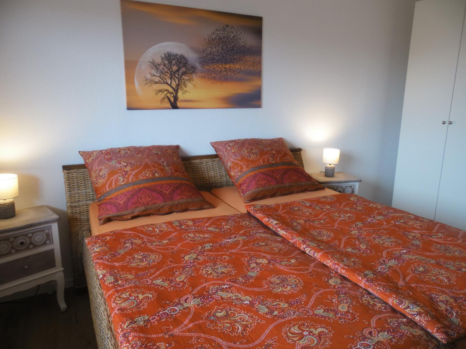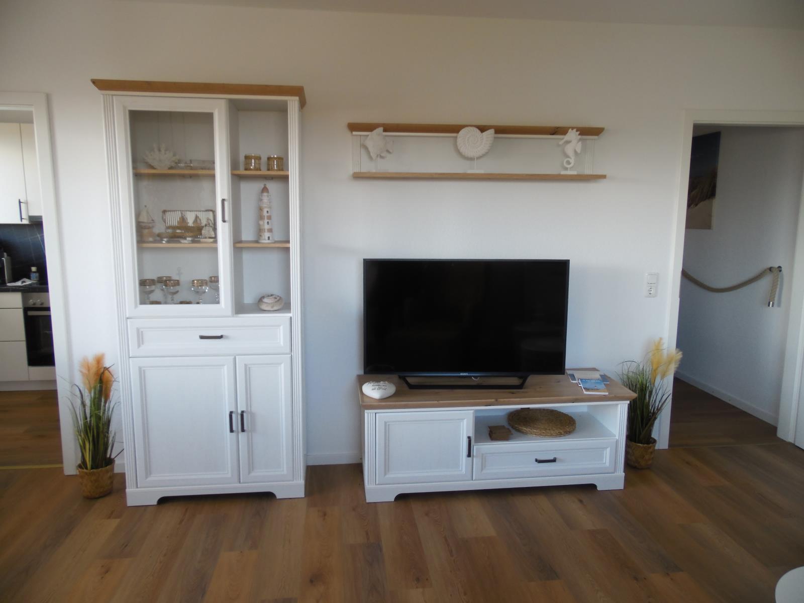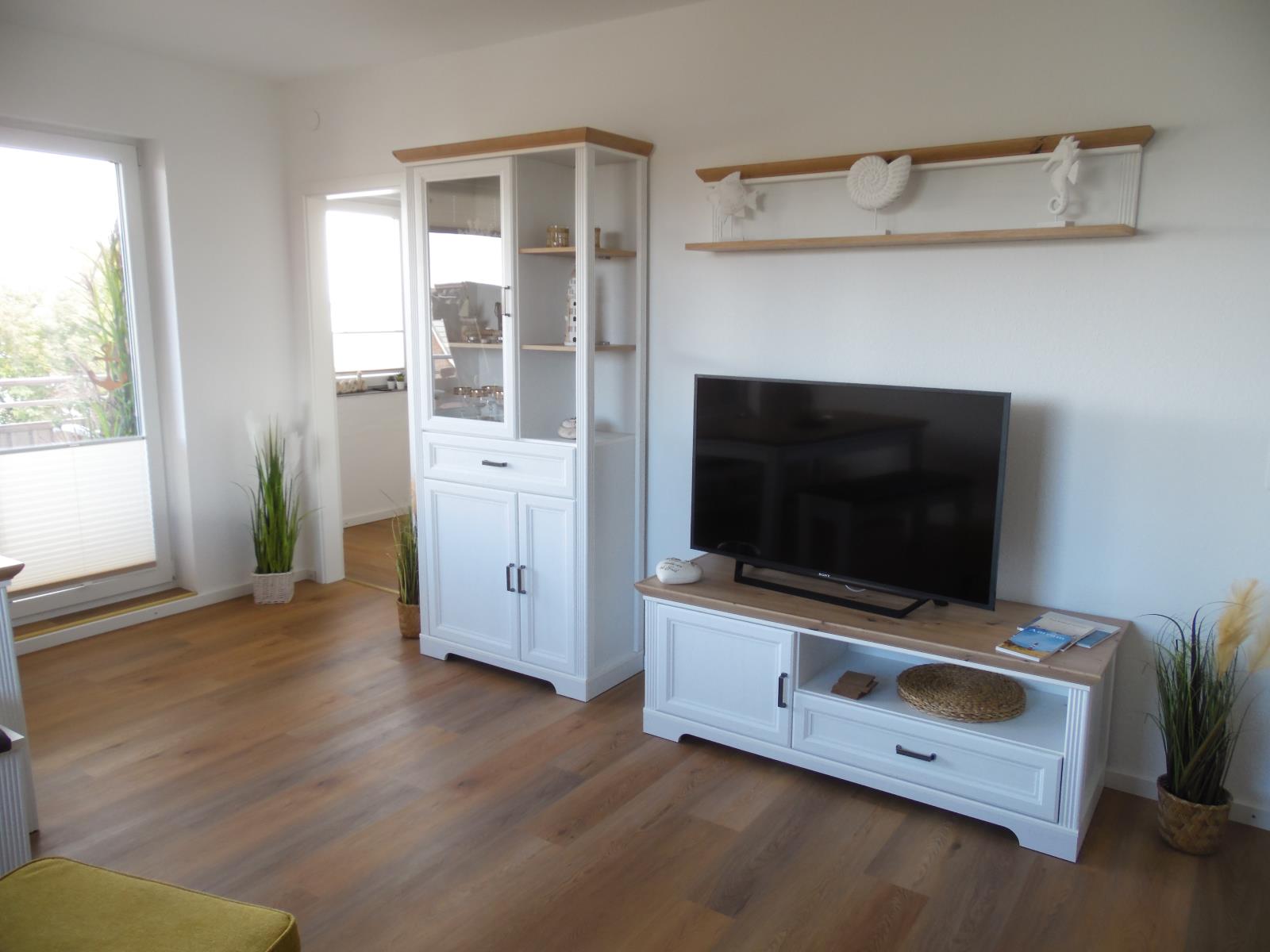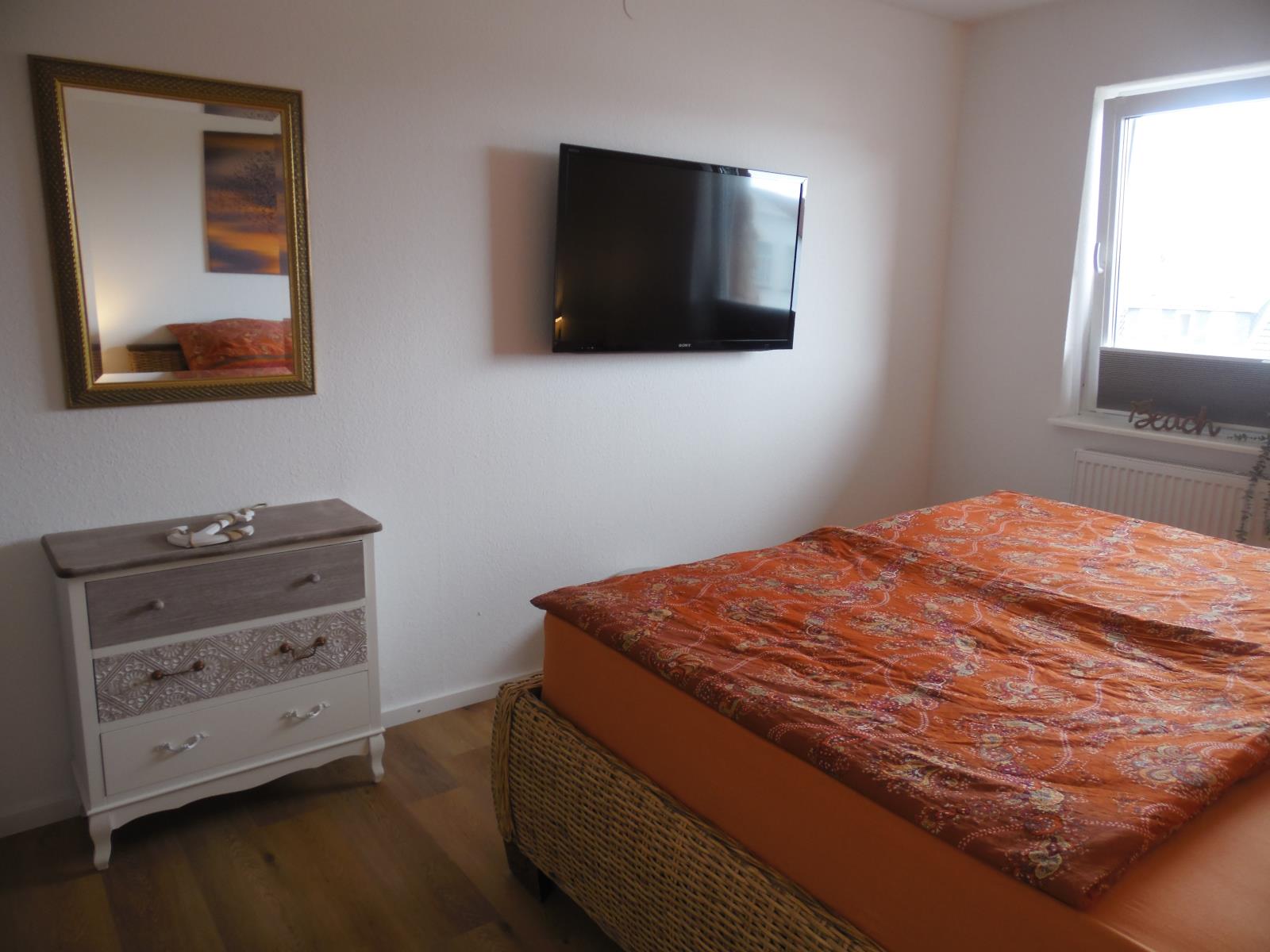 Wohnzimmer Zugang zum Balkon, WLAN und Sat-TV , Sofa / hochwertiges Schlafsofa (1,80 x 2m), Esstisch für 4 Personen, Spiele und Bücher geschlossene Küche mit Meerblick, Kaffeemaschine, Spülmaschine, Herd mit Ceranfeld, Toaster, Backofen, Wasserkocher und ein kleines Gefrierfach im Kühlschrank Schlafzimmer 1 Doppelbett mit Komfort-Höhe (1,80 x 2m), 1 Fernseher, großer Schrank, Spiegel, 2 Nachtschränke, 1 Kommode