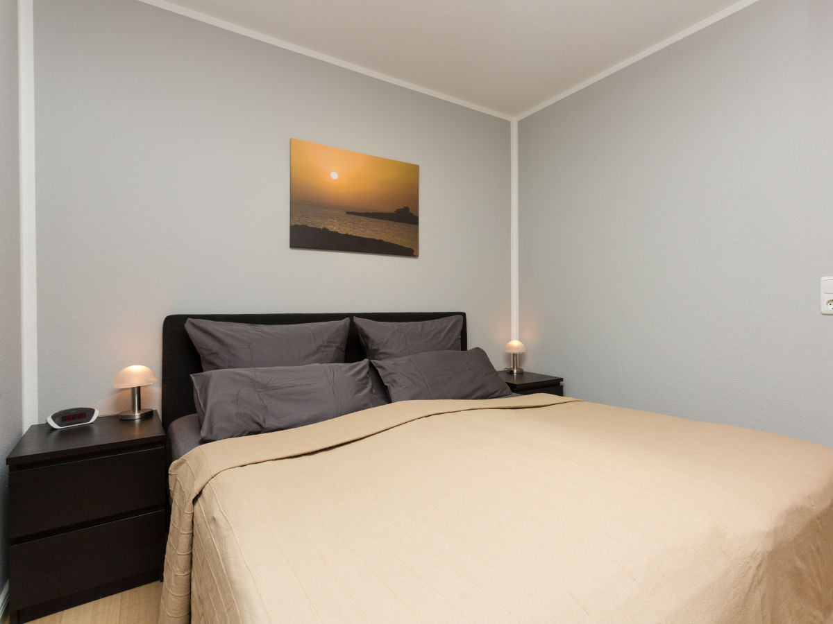 Die Wohnung hat ein Schlafzimmer mit einem 160×200 Meter großem Doppelbett, einem Kleiderschrank und Wecker. Es ist pro Person ein Kissen 80x80cm sowie 40x80cm verfügbar.