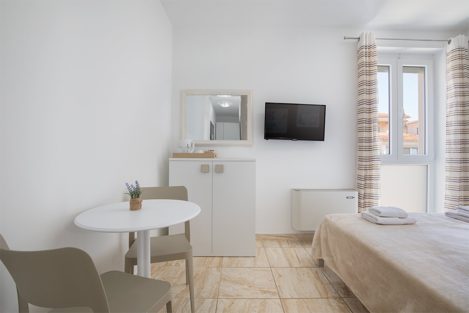 Das Doppelzimmer 2 verfügt über ein Doppelbett (160 cm x 200 cm) und bietet Platz für maximal 2 Personen. Zudem gibt es einen Tisch mit 2 Stühlen, Kaffee- und Teezubereitungsmöglichkeiten sowie einen Minikühlschrank. Das Badezimmer ist mit einer Dusche, einem Waschbecken, einem WC und einem Bidet ausgestattet. Fahrzeit ab kroatischer Grenze ca. 1h.