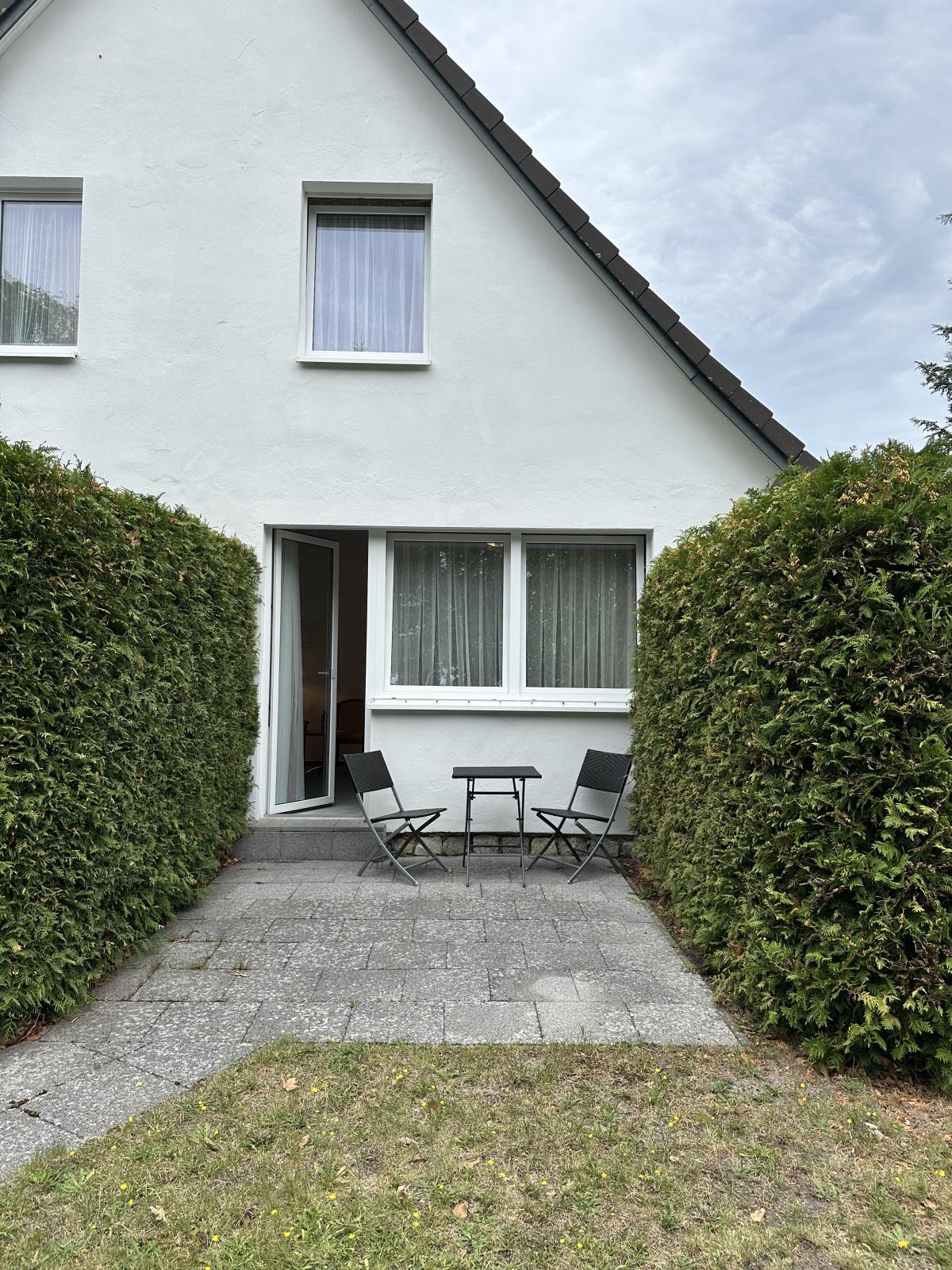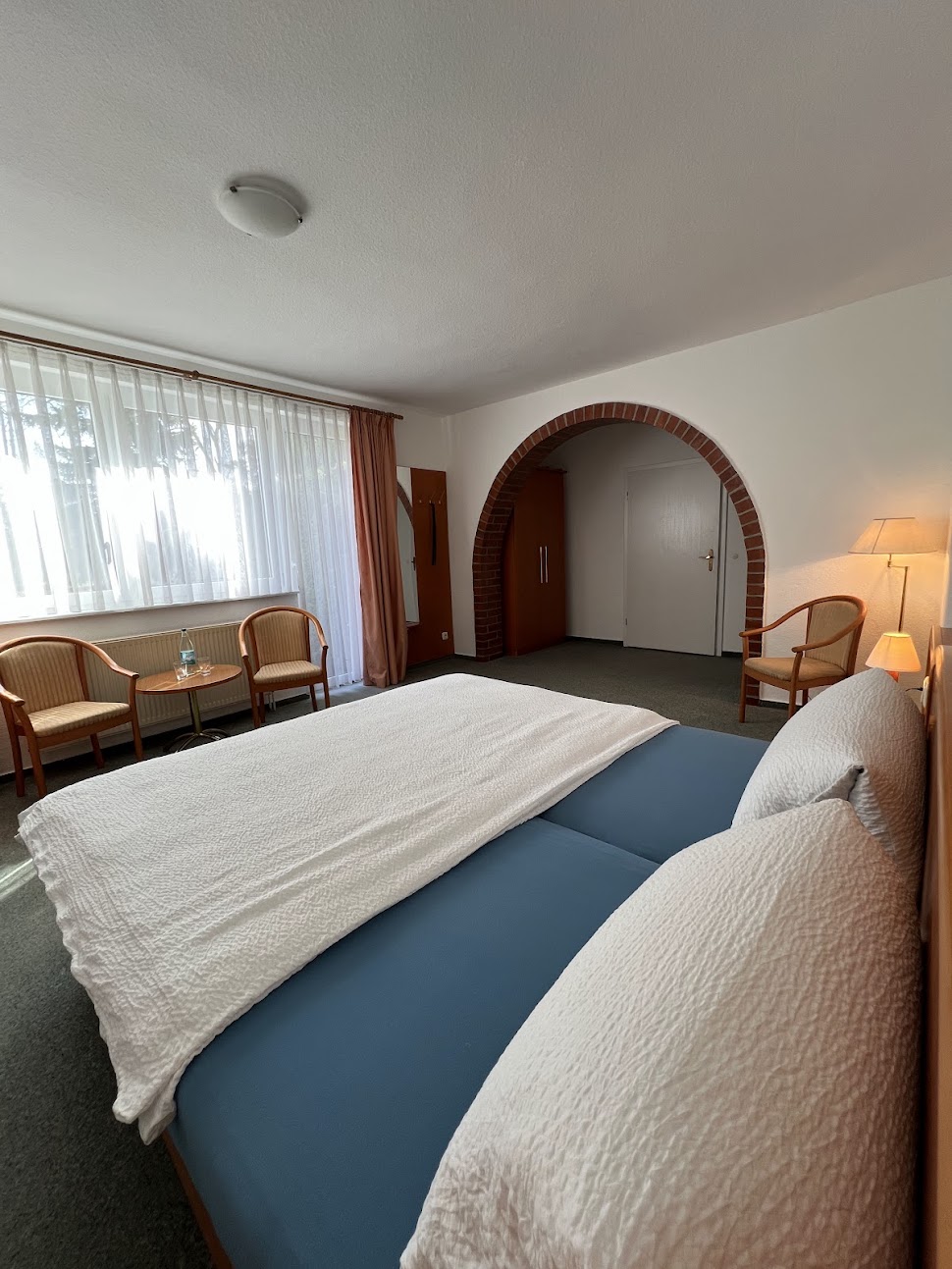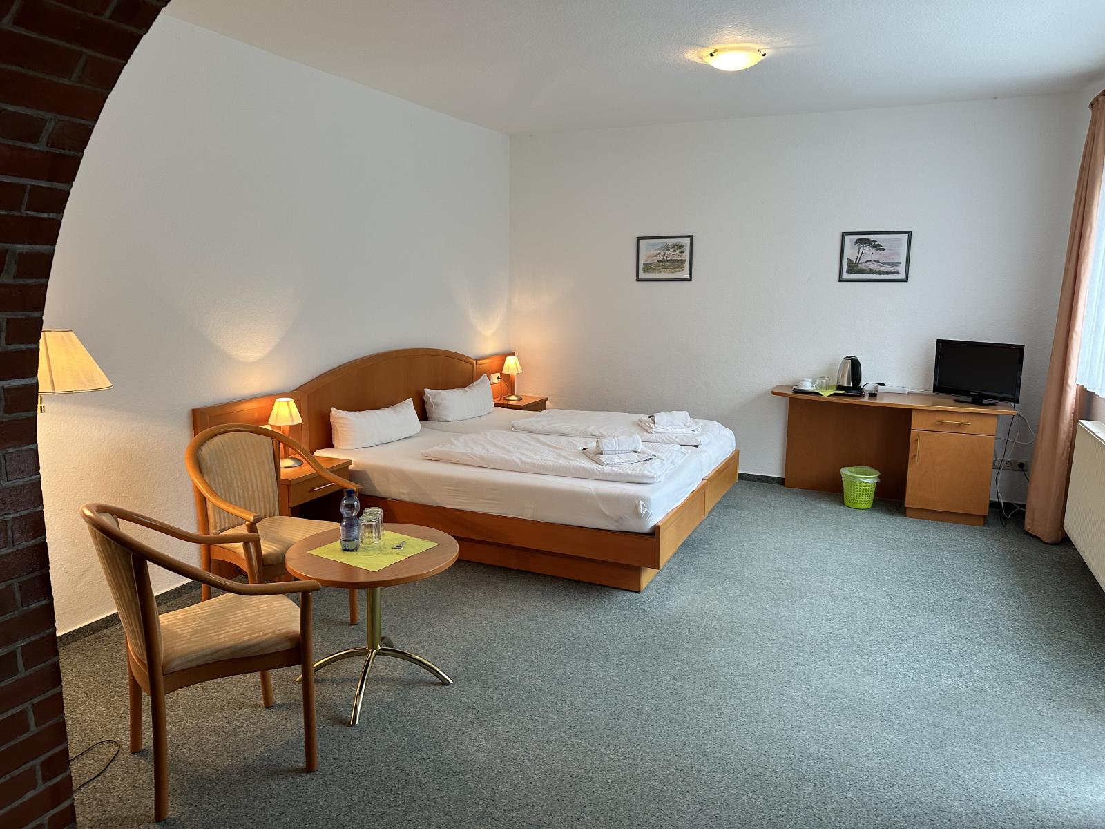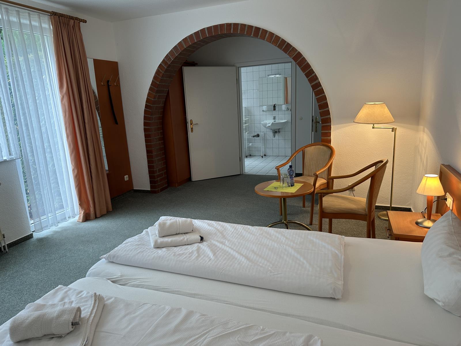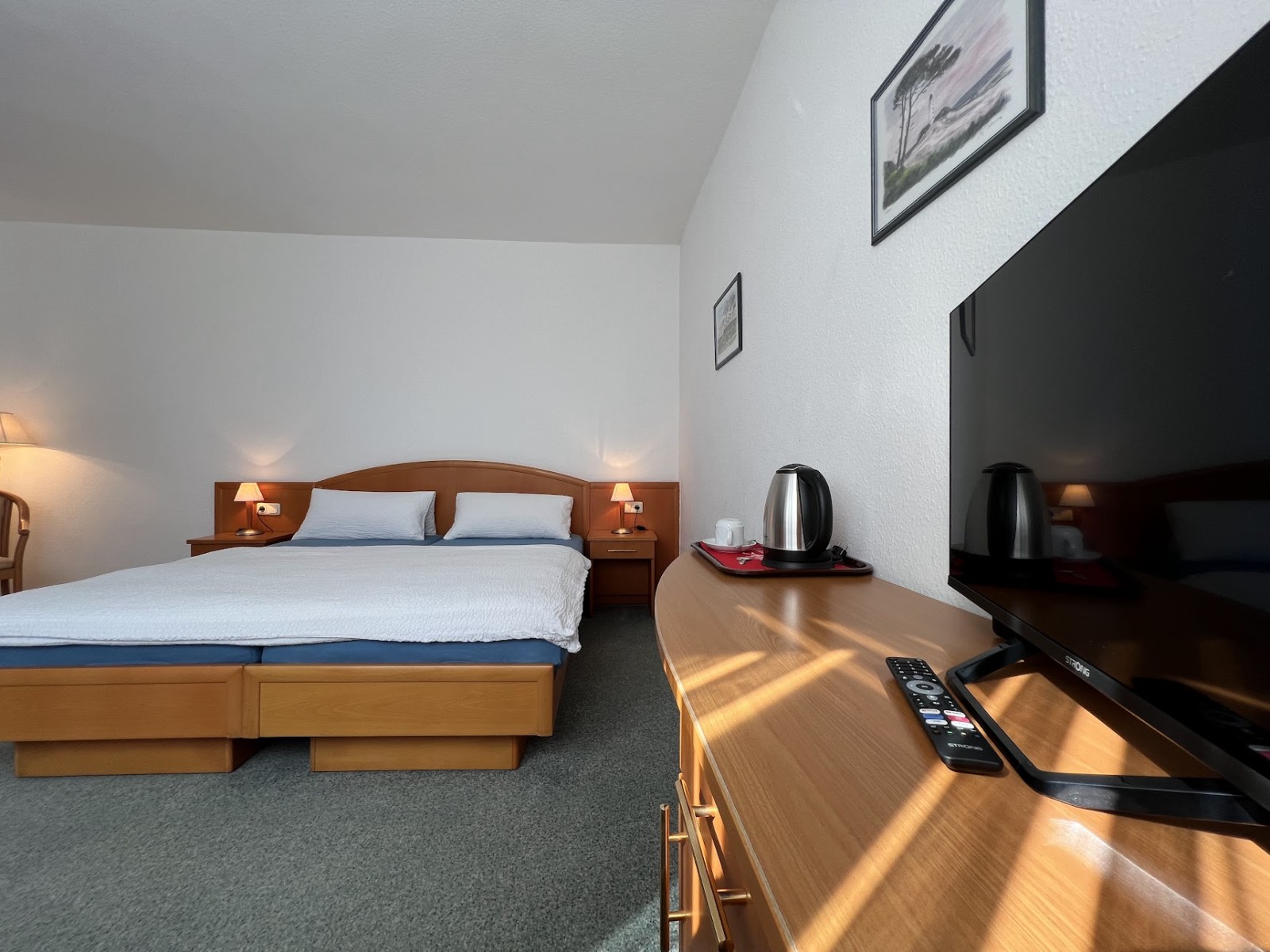 Freundlich eingerichtetes Doppelzimmer mit Terrasse, eigenem Bad (Behindertenfreundlich mit Fenster und Dusche) und kostenfreiem Parkplatz direkt vor dem Haus. Ihr Vierbeiner ist gegen eine Gebühr auch herzlich willkommen. Das Frühstück, die Bettwäsche sowie Handtücher sind bereits inklusive.